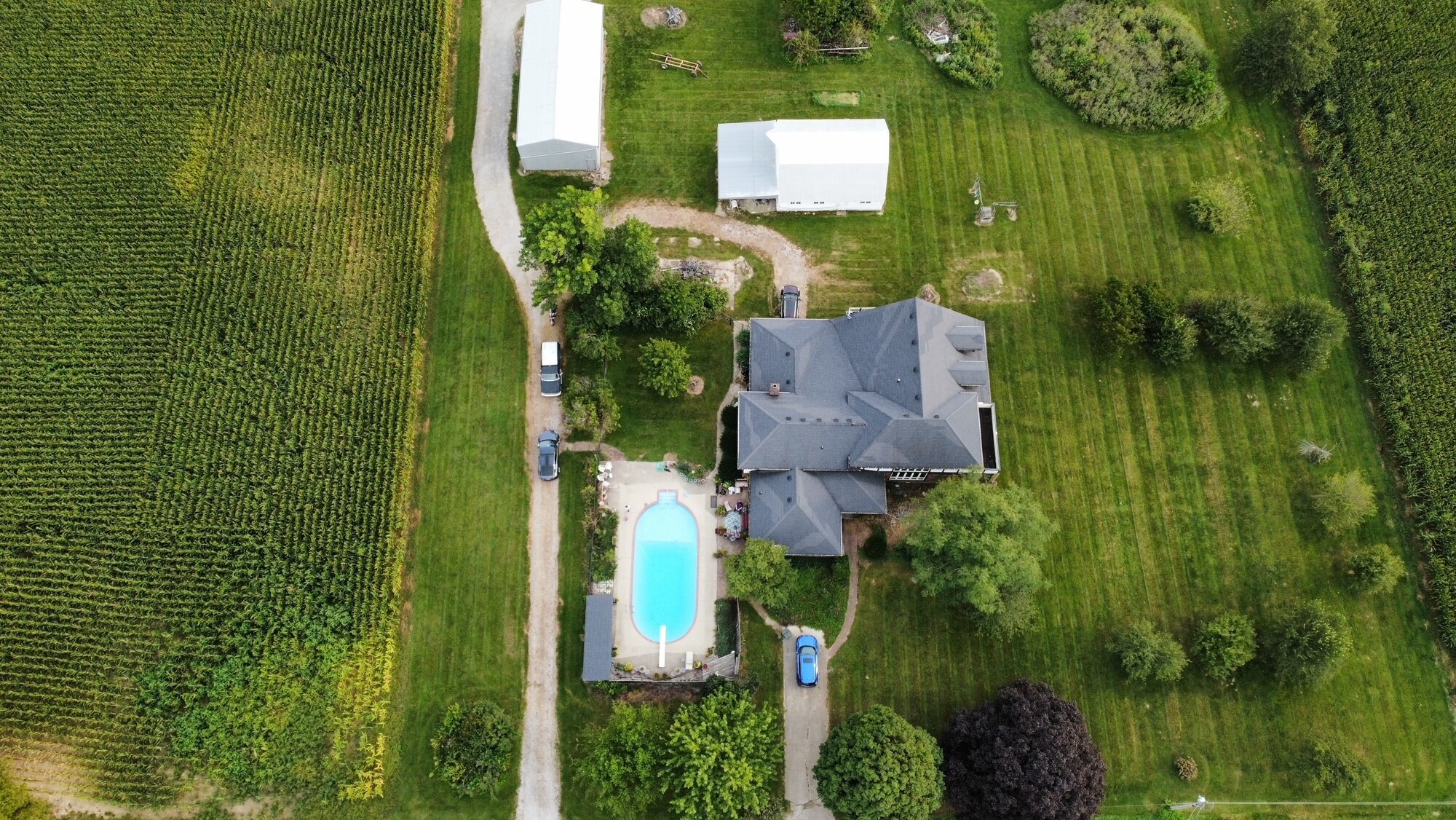 COUNTRY LIVING ON QUIET ROAD FEATURING 6000+ SQ FT, IN-LAW QTRS, 2 GEOTHERMAL SYSTEMS, 2 WELLS (1 FOR POOL WATER) POOL PROF CLOSED FALL 2021. UNUSED IN 2022 BUT OPERATIONAL WHEN CLOSED. POLE BARN & REGULAR BARN. TWO STORY GREAT ROOM PREV USED AS LIBRARY W/ WIDE MEZZANINE/LOFT AREA FOR COZY READING. TRILEVEL BUILT IN 1976 WAS ADDED ONTO W/POCKET DOORS FOR MANY ACCESSES TO LIBRARY AND IN-LAW QTRS BUILT IN EARLY 90’S. HUGE ROOMS FOR WORK-OUT, GAME RM, MEDIA AREAS- SO MANY POSSIBILITIES! KITCHEN & BATHS UPDATED 2019. SURROUNDED ALL 4 SIDES BY FARMLAND. FRUIT TREE ORCHARD. NEWER FLOORING IN MAIN LEVEL KITCHEN, LR & DR. BASEMENT UNDER TRILEVEL. INLAW QTRS FEATURE RAMP FROM GAR, LGE BA W/WALK-IN SHOWER & TUB, SITTING RM. TOTAL ELECT $500/M BUDGET