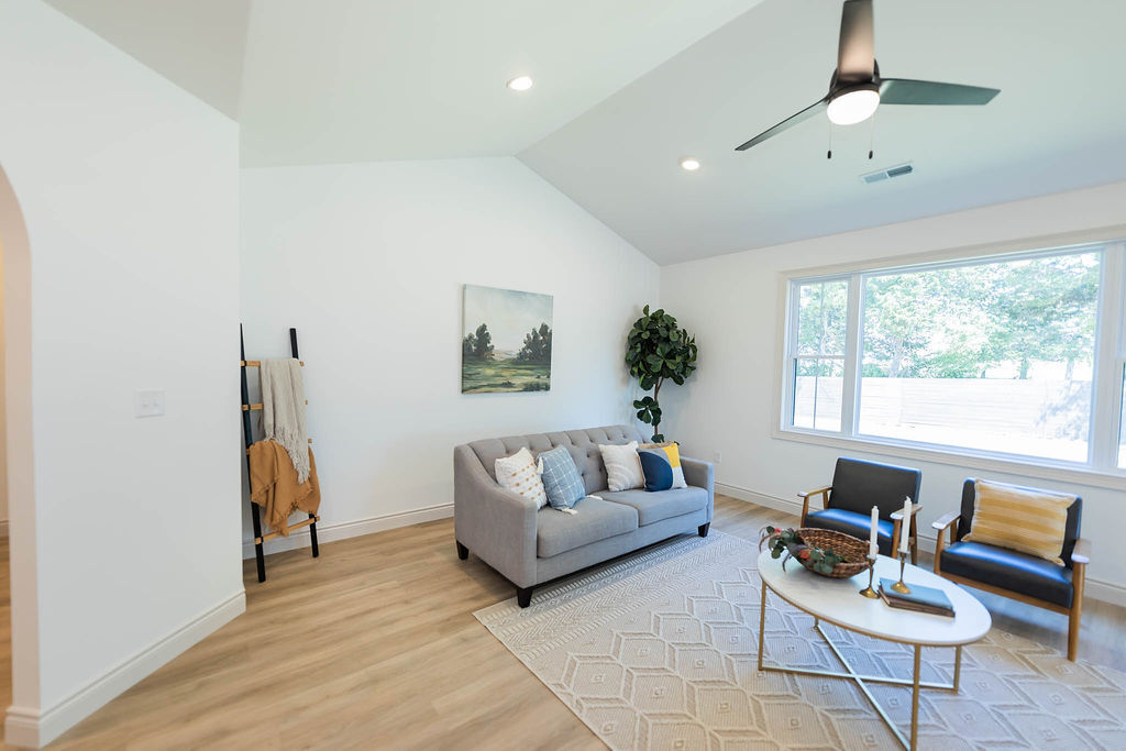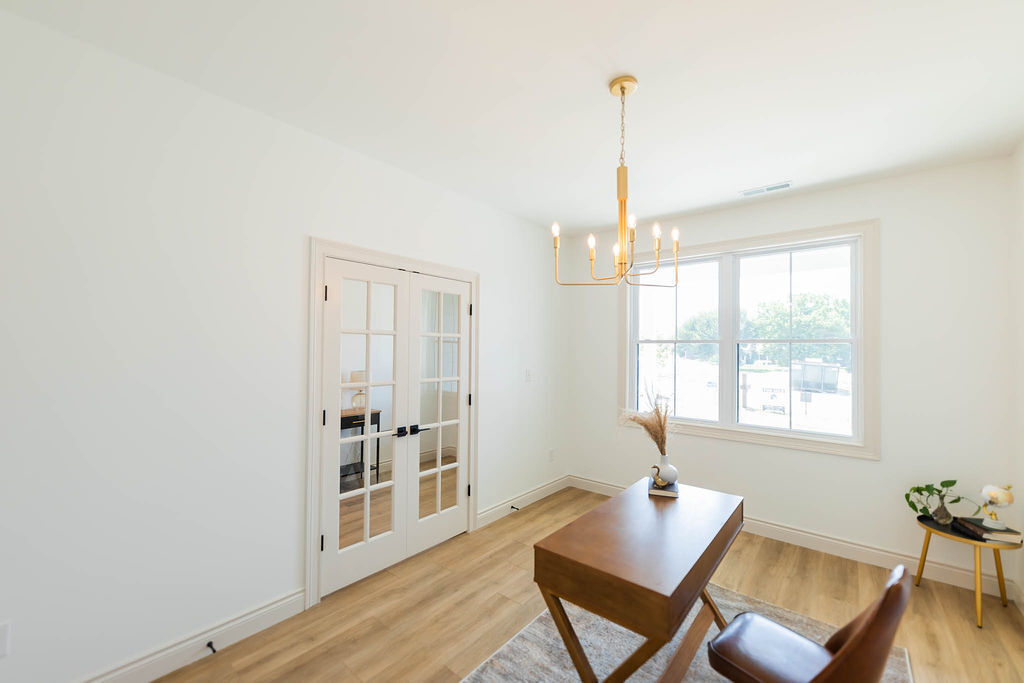 A true, southern-style front porch welcomes you as you walk through the front door. Just inside you will find a flex room with French doors that is large enough to be used as a 4th bedroom as well as two other bedrooms and a full bath. The primary suite has a luxurious feel with double closets, a large stand up tile shower and separate tub. The kitchen includes soft-close, custom cabinets, an island that seats up four people, tile backsplash and quartz countertops. Just off the garage is a private, secondary entrance providing so much closet storage and built in cabinets for your everyday essentials! This home was thoughtfully designed with LP siding, a stone faced 3-car garage, cathedral & tray ceilings and so much natural light.