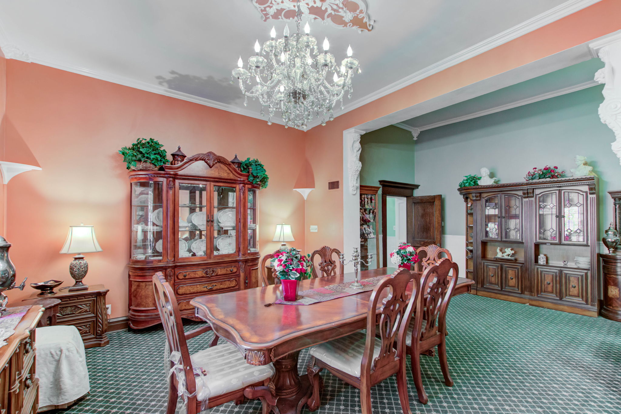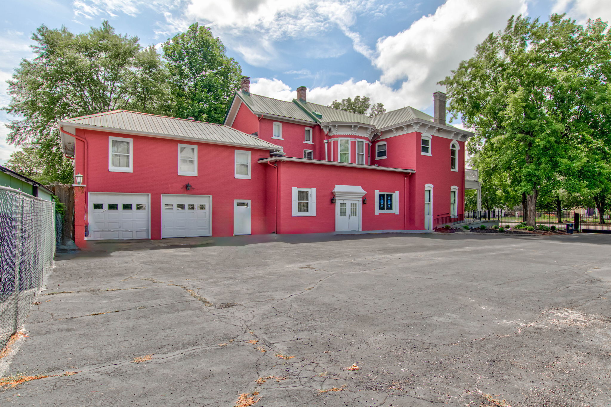Beautiful spacious two-story home on a double lot with a privacy gate in a lovely neighborhood. Upon entering, you will notice the 12′ high ceilings, a formal living room area with columns and a fireplace with original mirror and custom painted ceiling, a wide hallway and a private family room with coffered ceiling, fireplace and oversized double pocket doors. The elegant kitchen is visible from the front door, off the wide hallway, there is a large formal dining room with an original stained-glass window. There is a large room above the garage, currently used as a work studio. Along the hallway, you come to a bedroom and as you go forward, there is an office with lovely bay windows, further down there is the master bedroom and bathroom