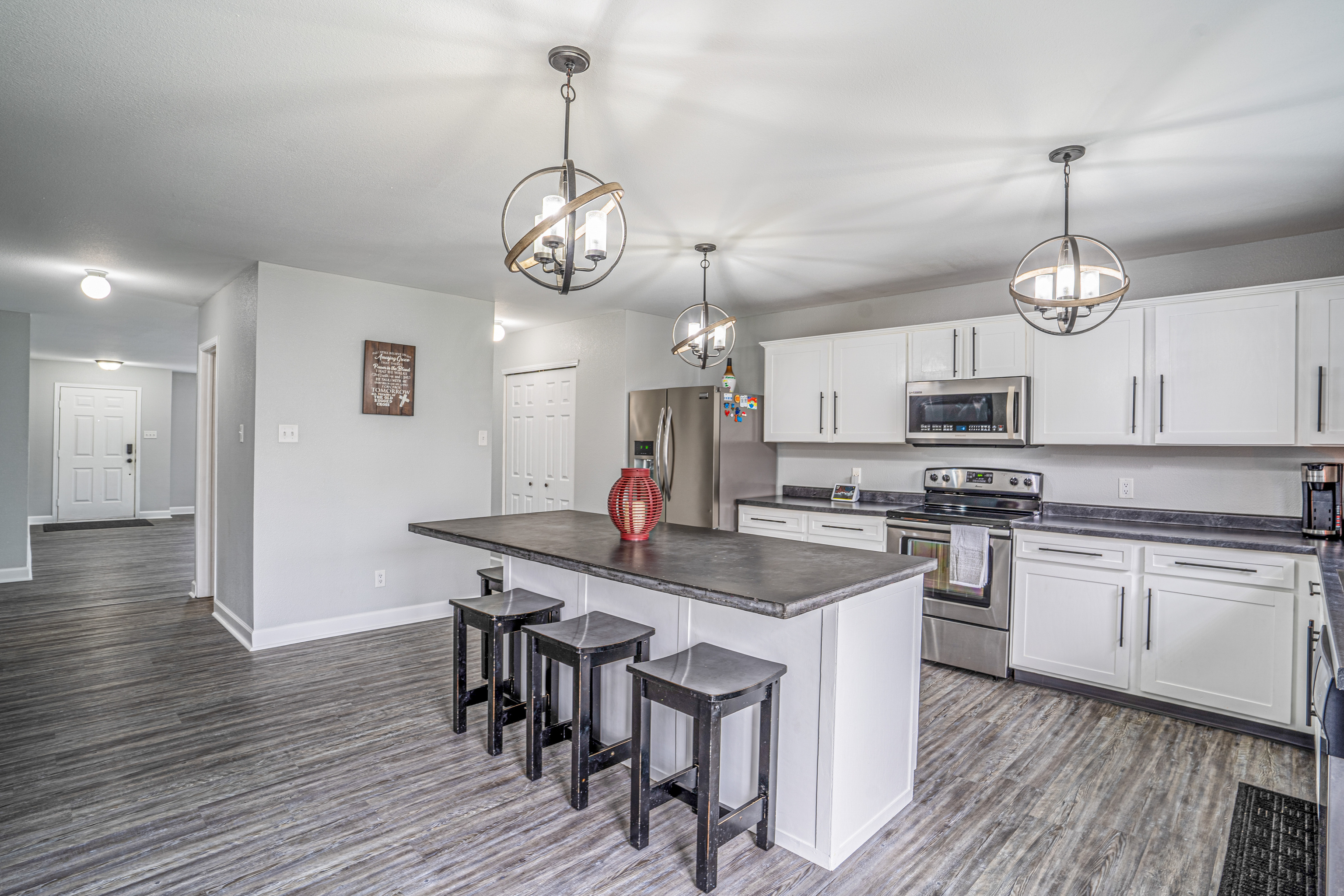 Wow! Lots of updates including Roof, gutters, downspouts 2021, New plank flooring 2022, New kitchen sink/faucet 2022, Whole house painted, upgraded cabinets, kitchen counters, lights, large cement island, upstairs carpet, New vanities in all 3 bathrooms, new lights, toilets, and floors in bathrooms(Tile), 2 inch faux wood blinds throughout, outdoor lights, and water heater all within the last 5 years! Lots of storage with 4 of the 5 bedrooms including Large Walk in closets, Large kitchen pantry, Separate Office on main level! Ceiling fans! All this in a neighborhood with access to pool with lifeguard, tennis courts, basketball courts, volleyball, soccer fields, 2 parks and a clubhouse. 7 minutes from Hamilton Town Center!