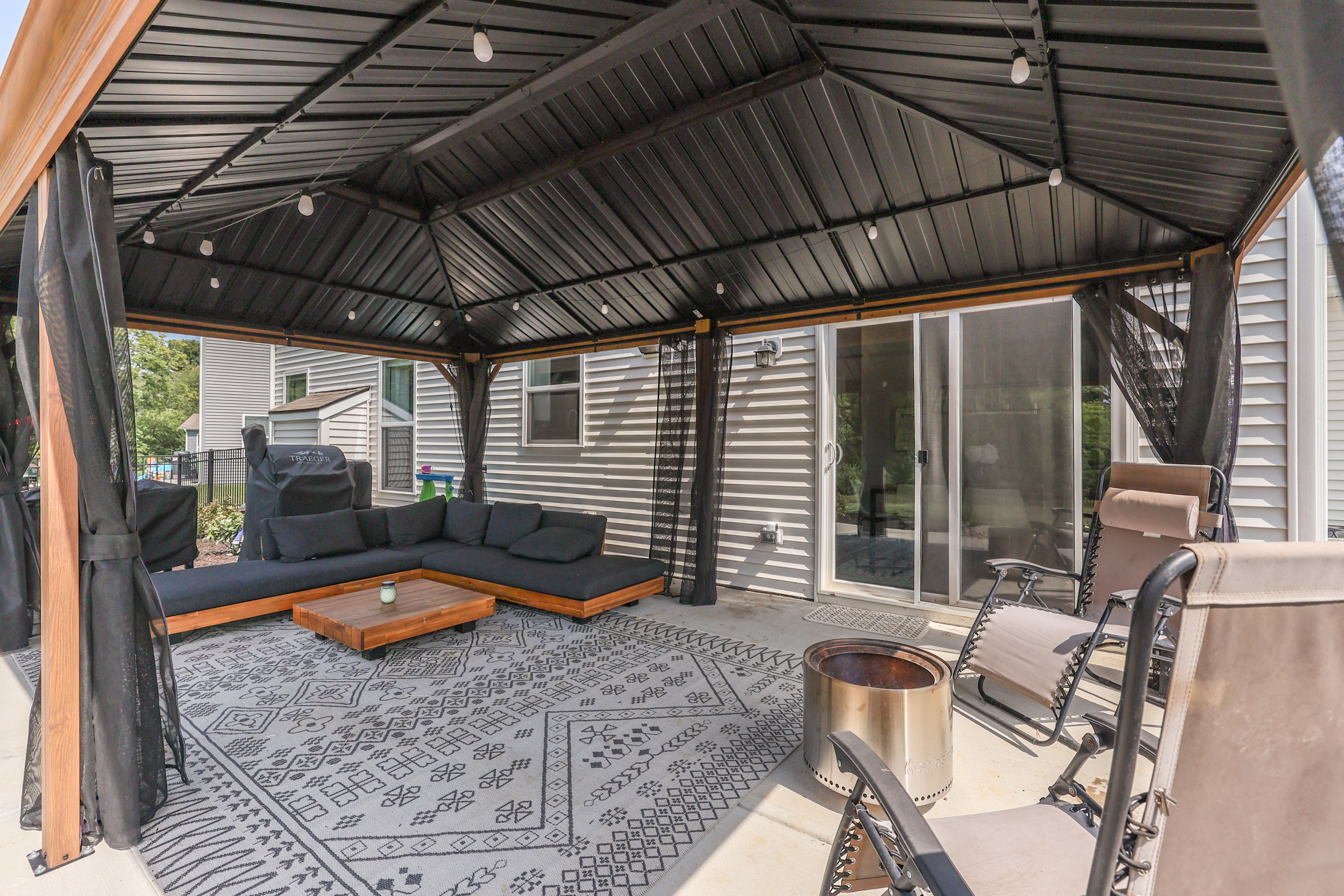 Better than new MI Homes stunner in Riley Meadows & Center Grove schools! This home is full of upgrades. 3 BR, 2.5 full bath home features 9′ ceilings & open concept. Enjoy your large open kitchen w/tile backsplash, center island, LVP flooring, dining area and pantry. Great room features a gas fireplace, in-ceiling speakers and motorized blinds while the office/den offers work from home privacy. Owner’s suite features tray ceiling, motorized blinds, dual vanities in bath, marble tops and walk-in closet while the loft provides a second floor spot to watch TV or a place to play. Three car garage is a bonus as is the 16’x24′ patio w/gazebo, the largest lot in the neighborhood with a fully fenced rear yard and a pond view.