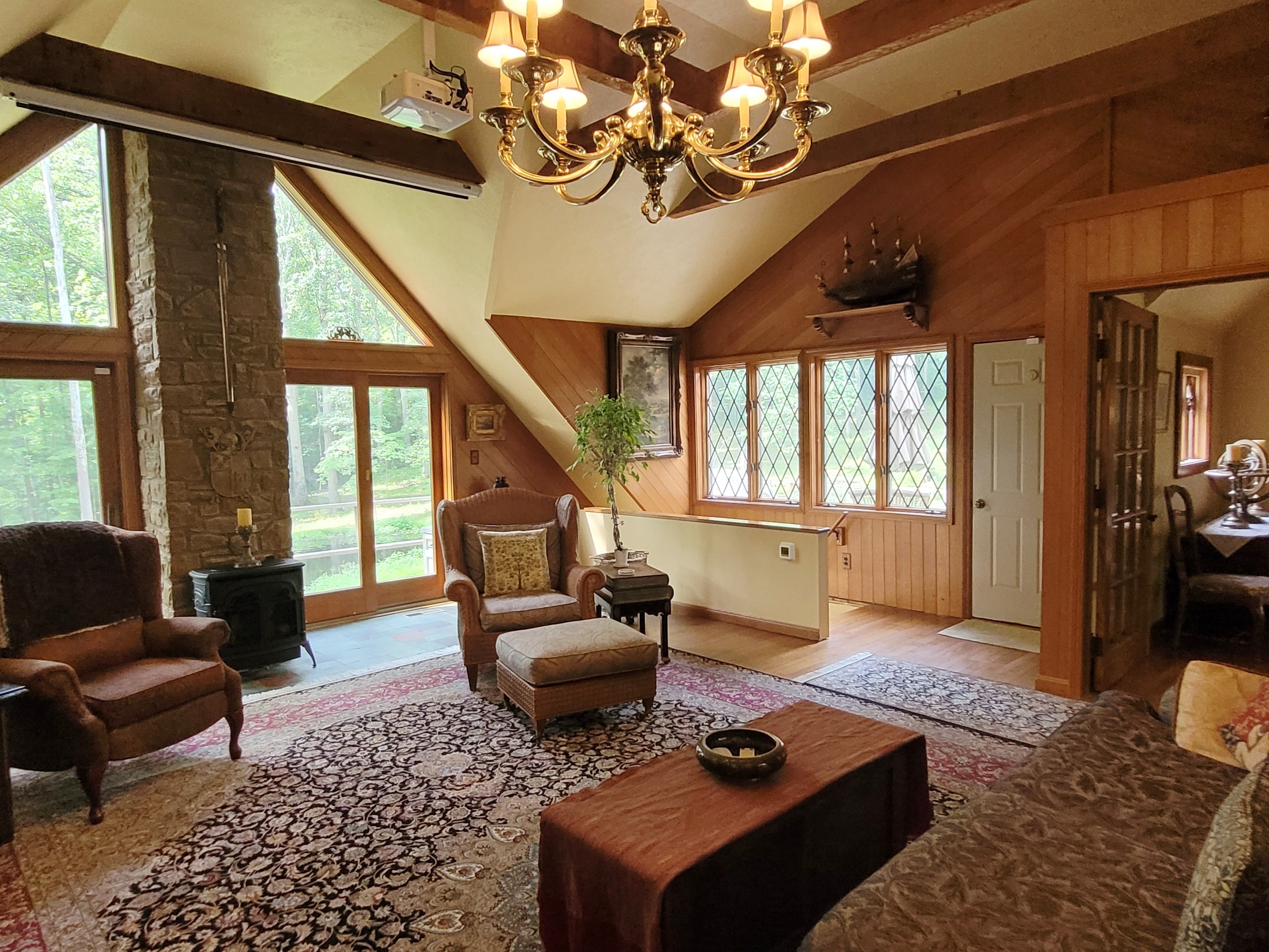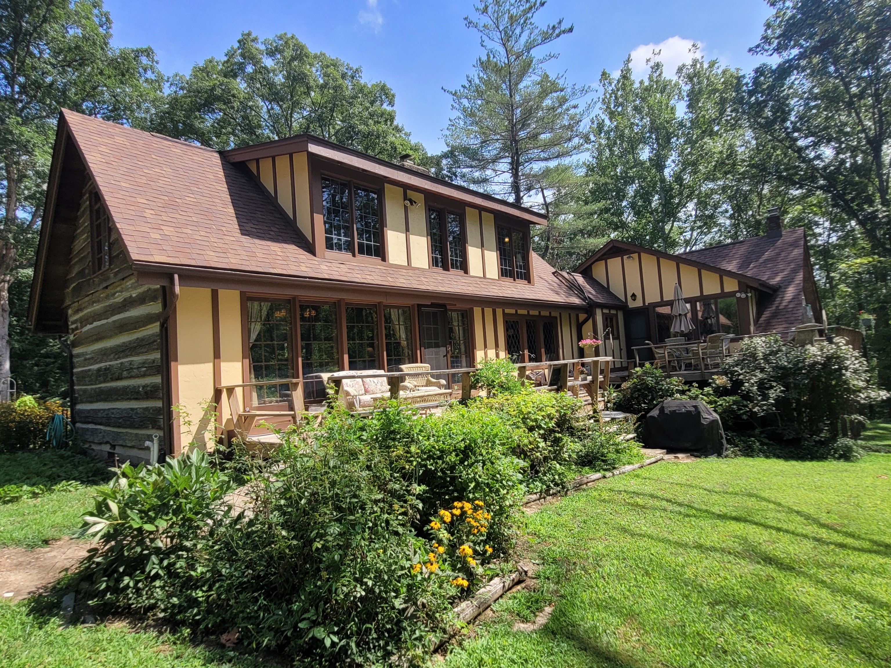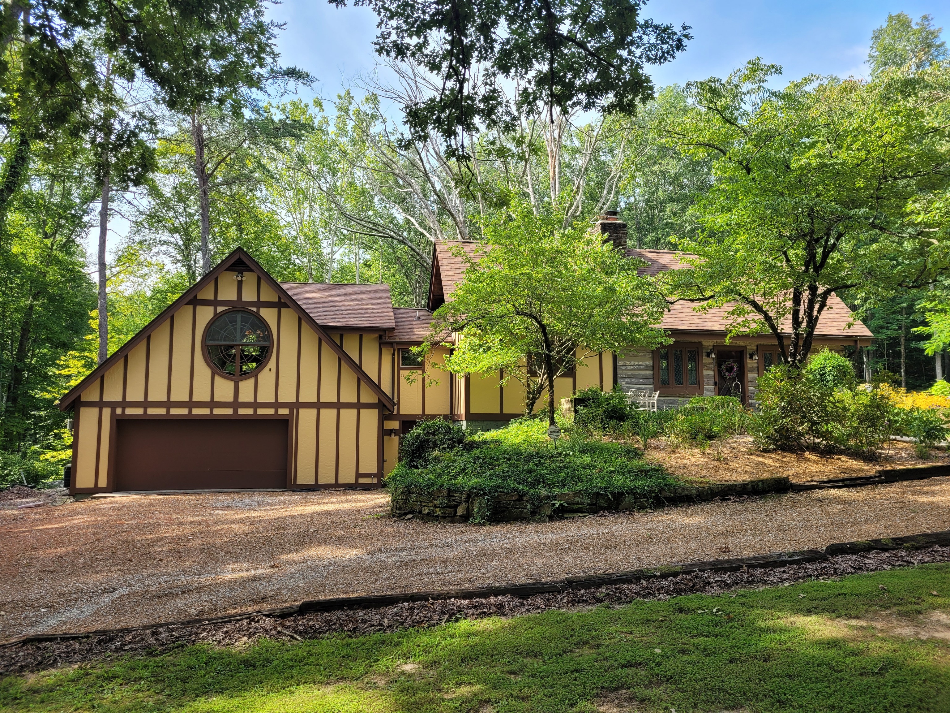‘Lostwithiel’ Tail End of the Forest. Welcome to one of the historic cabins built by Hank Swain in 1930. Hand chiseled stone fireplace & hand hewn poplar logs can still be enjoyed inside this Brown County oasis. Craftsmanship went into every detail while expanding this custom home. Featuring wood & gas fireplaces, expansive library with movie theater, top of the line kitchen, wonderfully updated bathrooms, antique custom round window & beveled windows are just some of the special touches this unique property host. A back deck stretches the length of the home & floor to ceiling windows allow you to enjoy your backyard sanctuary & pond. Workshop & storage building are temperature controlled. Driveway features beautiful tanned gravel.