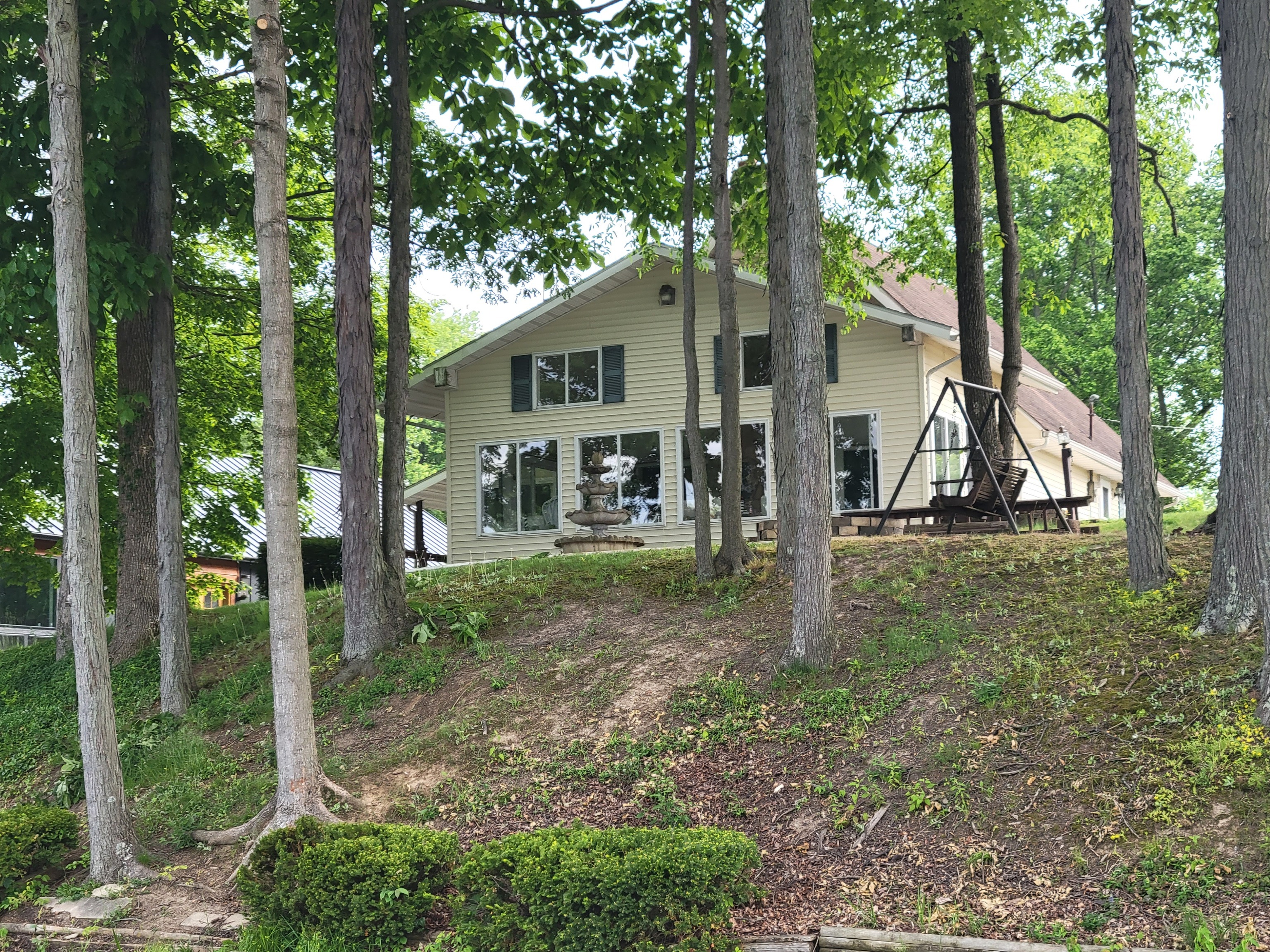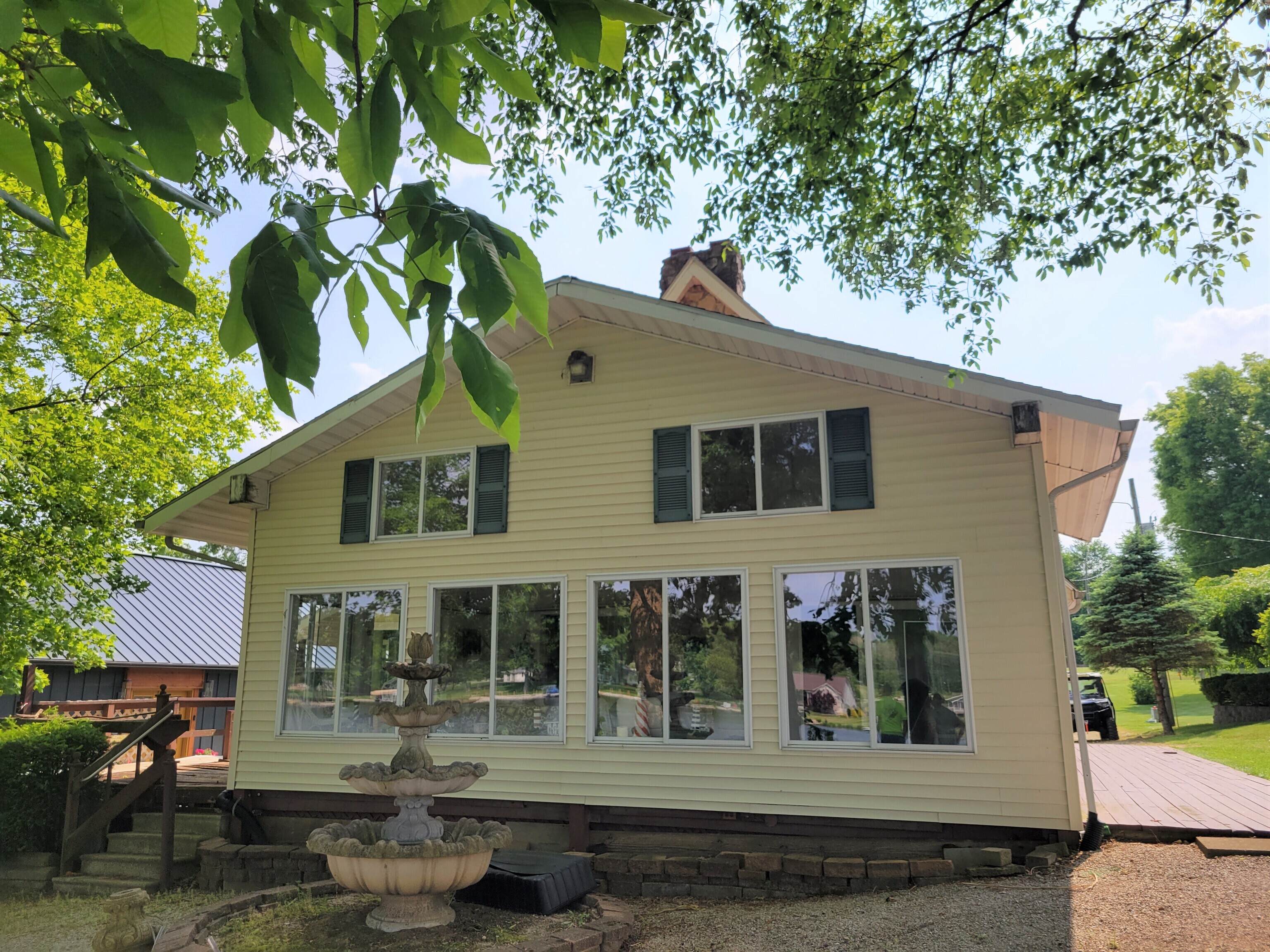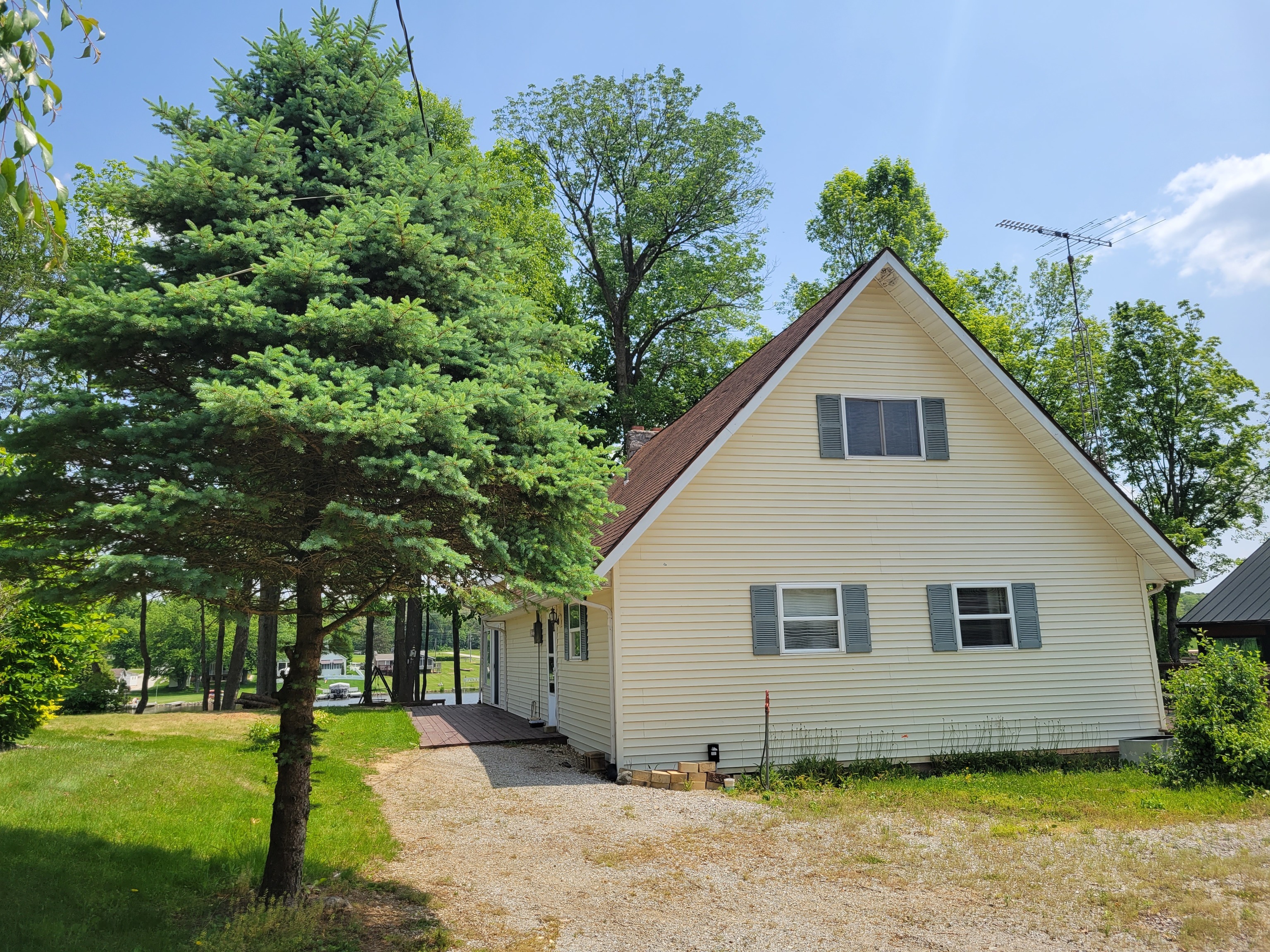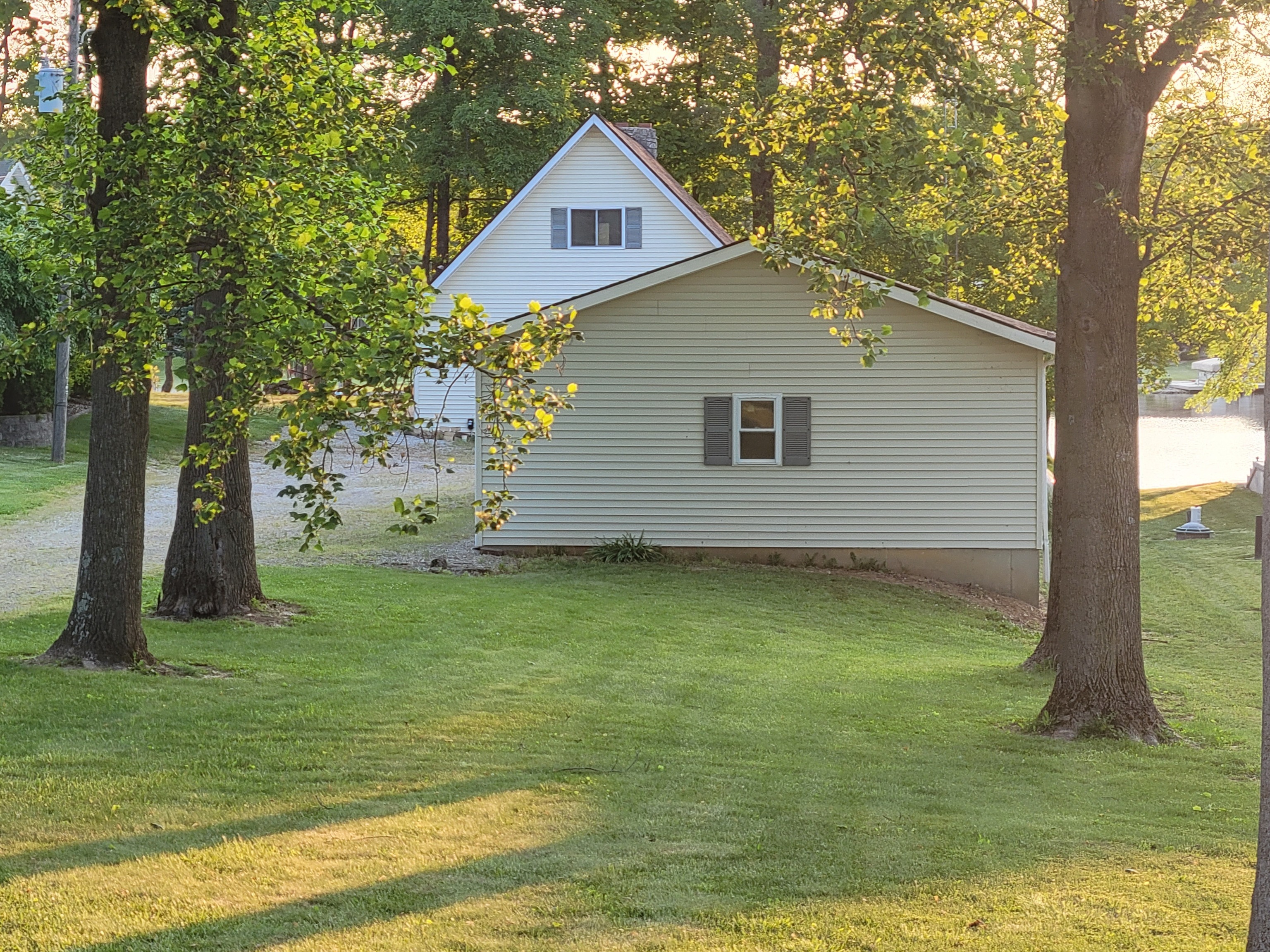 Enjoy breathtaking views from this waterfront home! Located on the north end fishing cove, you will enjoy a no wake zone perfect for kayaking, fishing and floating. You will wake up to sunrises and watch them from your sunroom. The home has 2 bed, 1 bath, kitchen, family room, sunroom, laundry room and enclosed porch on first floor. The second floor has a bedroom and loft area. Basement has a walkout door on the south side of home. The 3 car detached garage has a workshop area and plenty of room to store lake toys, golf cart and more. Big grassy front yard is perfect for games. Firepit overlooks the lake for fun fall evenings. This home is ready for you to remodel and make it your own. It is being sold AS IS.