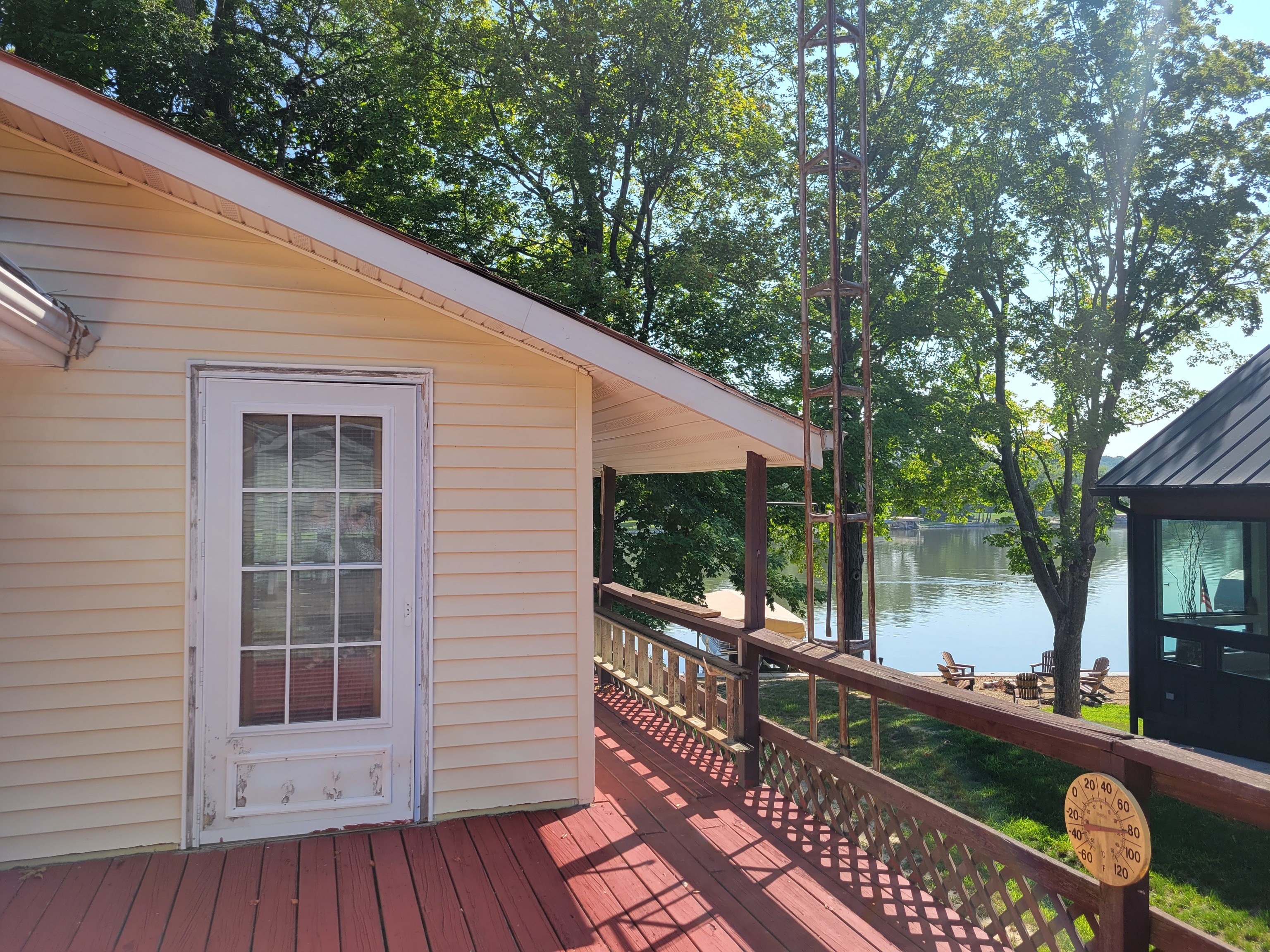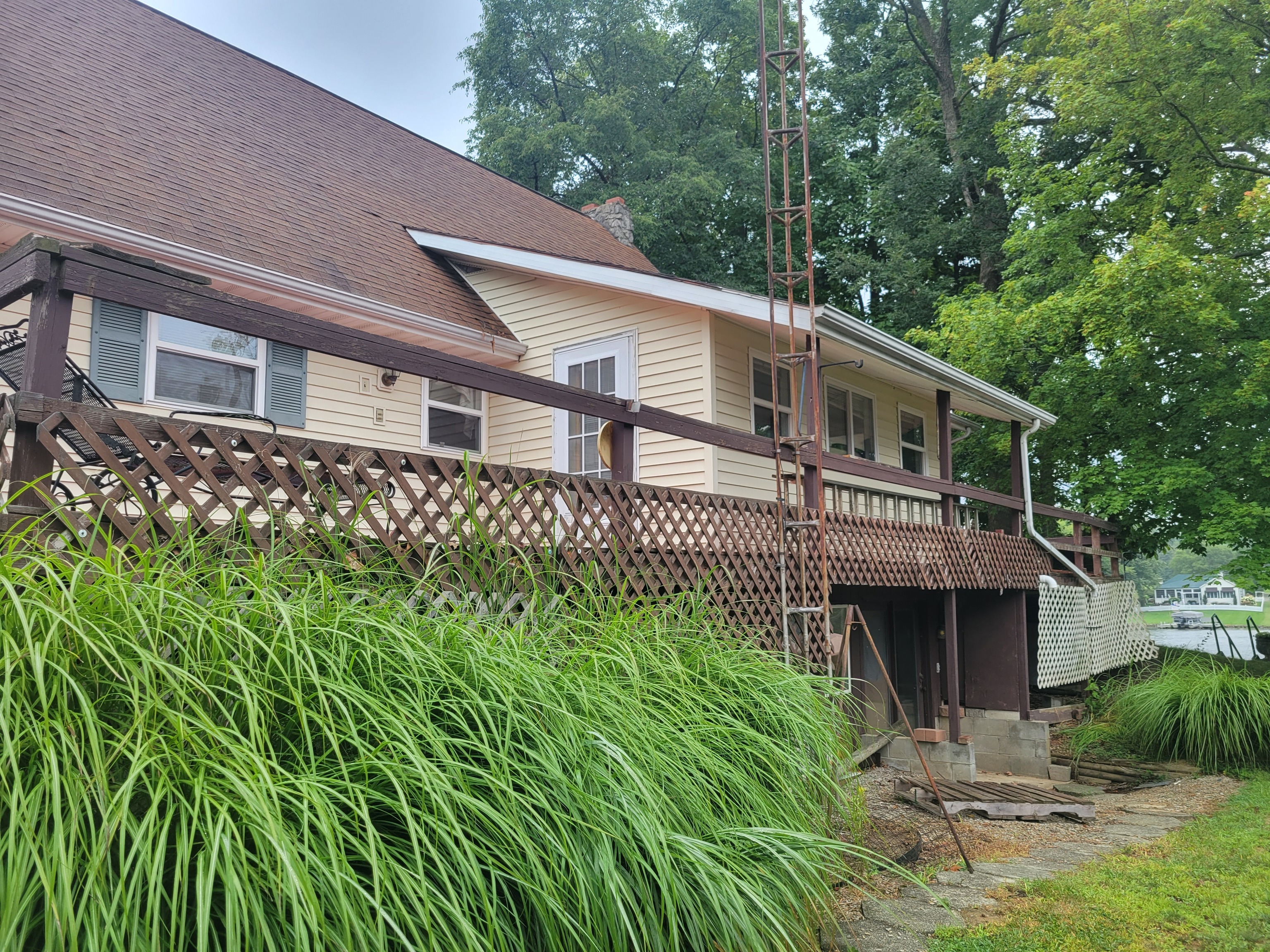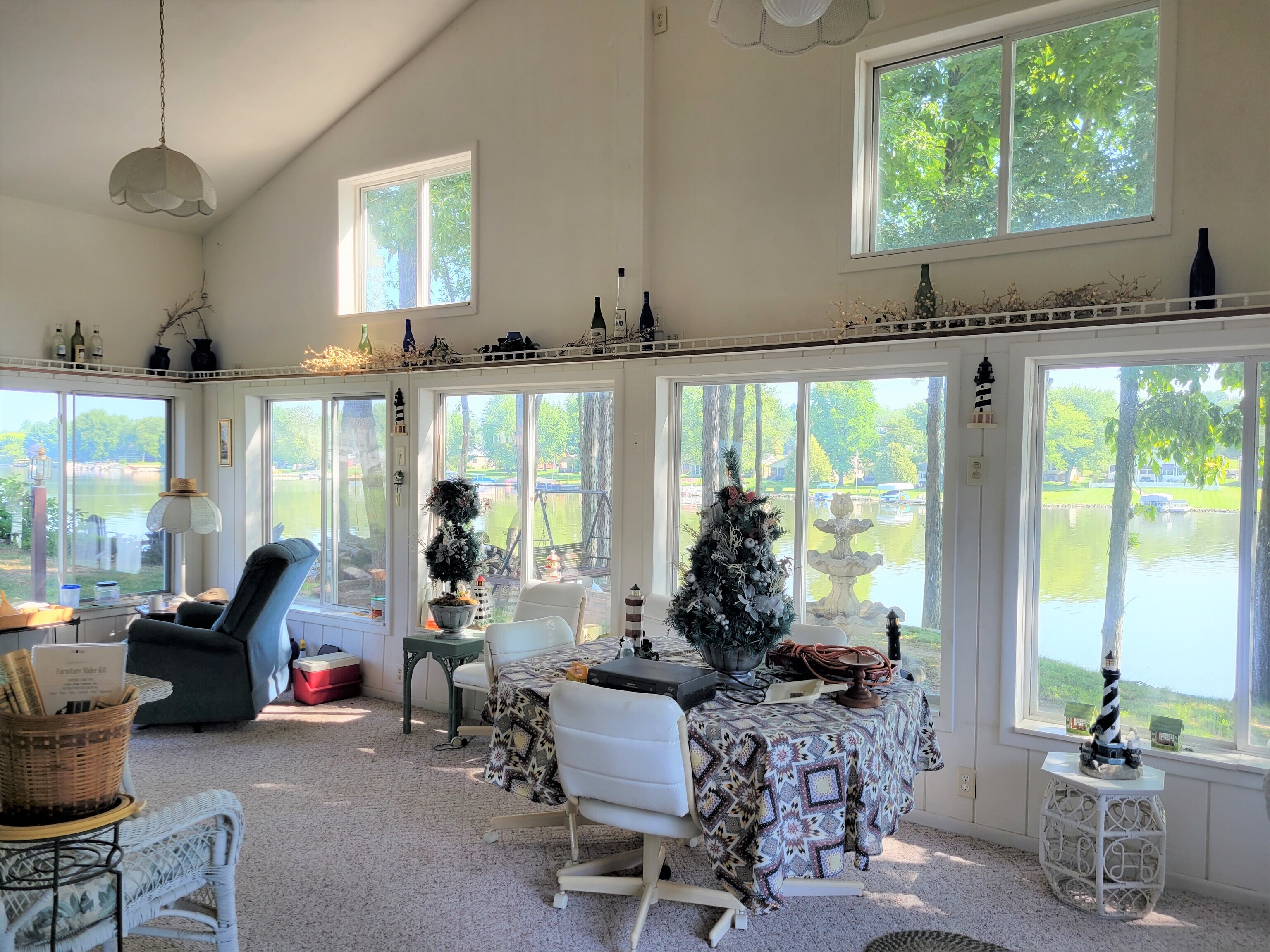 Enjoy breathtaking views from this waterfront home! Located on the north end fishing cove, you will enjoy a no wake zone perfect for kayaking, fishing and floating. You will wake up to sunrises and watch them from your sunroom. The home has 2 bed, 1 bath, kitchen, family room, sunroom, laundry room and enclosed porch on first floor. The second floor has a bedroom and loft area. Basement has a walkout door on the south side of home. The 3 car detached garage has a workshop area and plenty of room to store lake toys, golf cart and more. Big grassy front yard is perfect for games. Firepit overlooks the lake for fun fall evenings. This home is ready for you to remodel and make it your own. It is being sold AS IS.