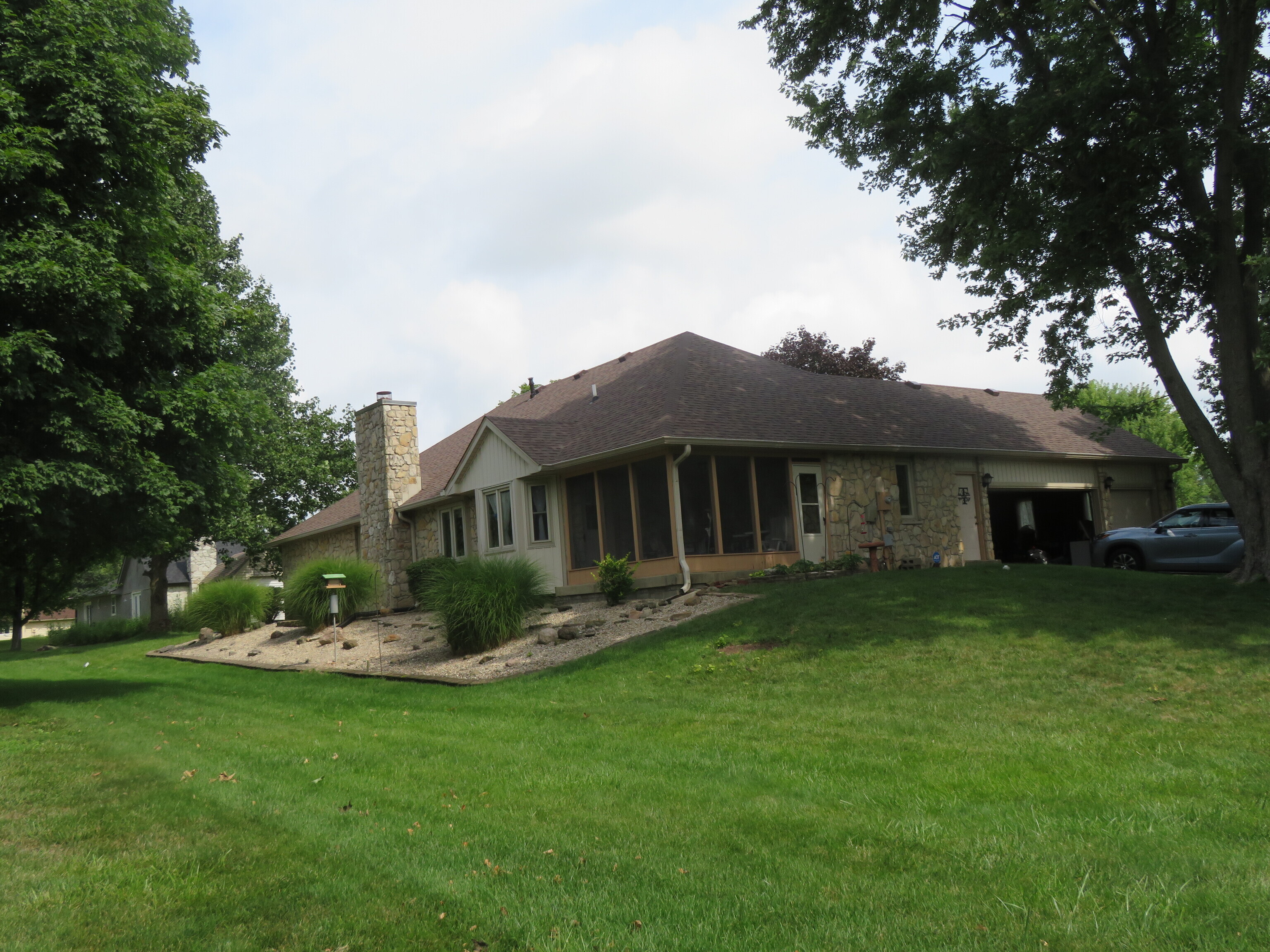 This wonderful stone ranch home has been lovingly taken care of. Spacious Great Room greets your guest with a gorgeous stone fireplace and adjoins the breakfast room for easy entertaining. The bright and open kitchen has been updated with quartz counter tops. Home is complete with formal dining room, 3 bedrooms, 2.50 baths and a mudroom/laundry area that is large enough to be used as an office or craft room. Primary bedroom has beautiful hardwood flooring with an adjoining bath that was recently updated. This home is energy efficient with a geo thermal heat/cool system , electric heat pump replaced in 2022 and tankless water heater. Roof was just replaced in July, 2023. Screened porch to relax and enjoy those summer or fall evenings.