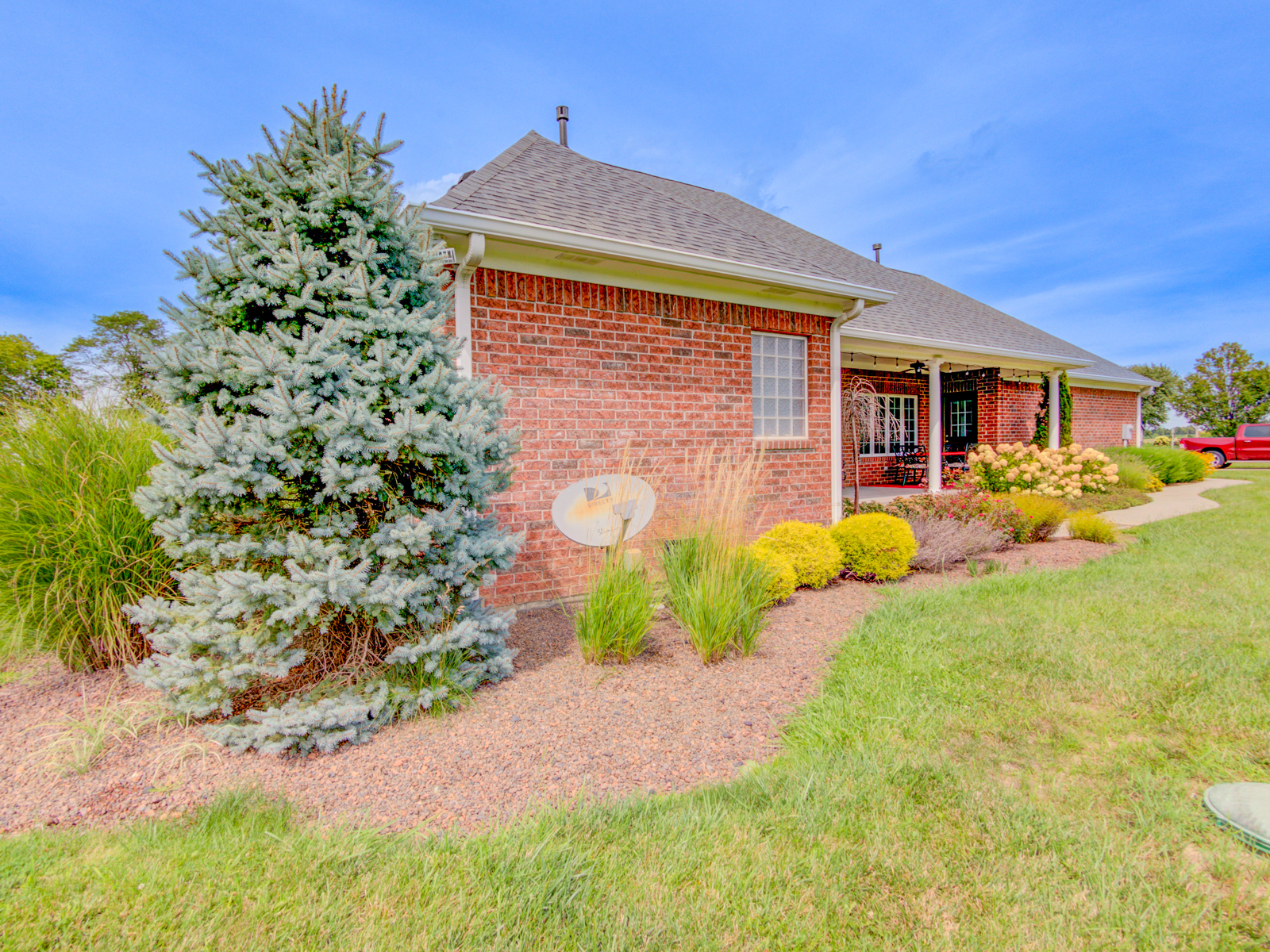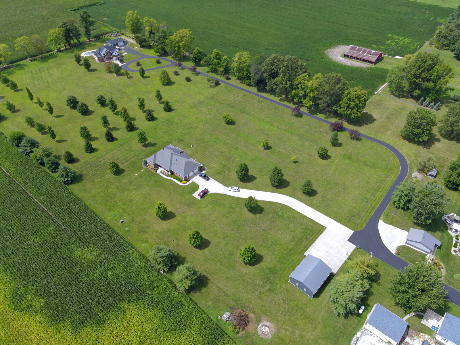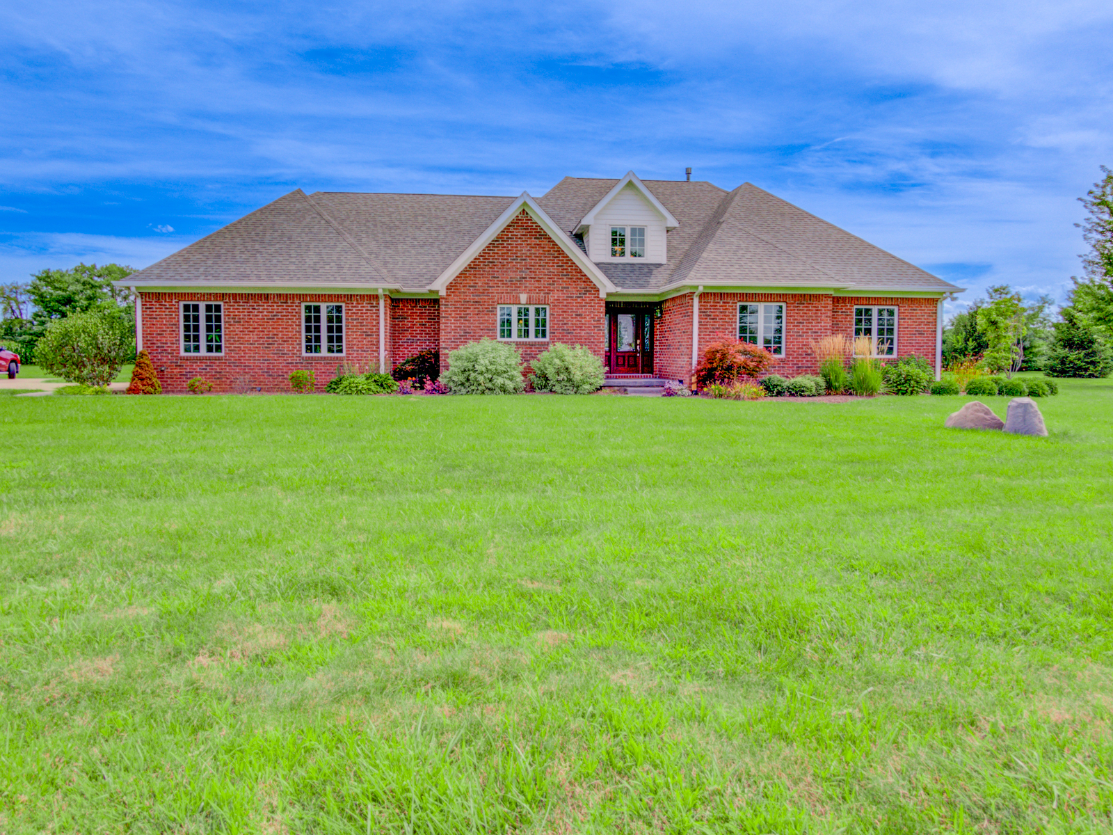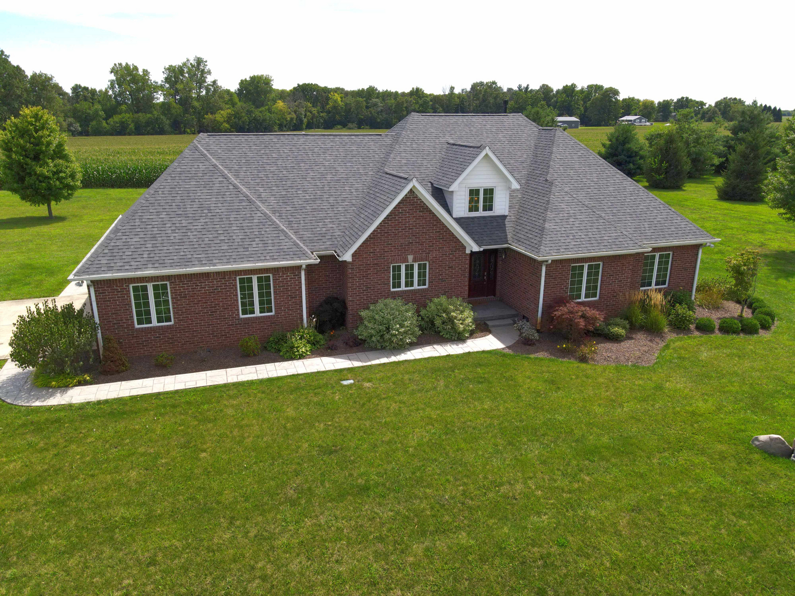 Wow don’t miss this one! A lovely custom built all brick ranch on 4.73 ac lot, 3 bedroom, 2.5 baths. Well thought out design & perfectly located on the lot with space for a future pool in back. Septic to the west. A water system professionally installed for the landscaping around the house. Separate 1200 sqft pole barn w/electric and concrete drive. The home features cherry hardwood floors throughout, a recently updated primary ensuite bathroom. Roof 2 years old, kit has tons of cabinets, a lrg walk-in pantry, built-in appliances, granite countertops, open concept with kitchen, GR and DR all open with a fireplace as the centerpiece. Fr Plc recently refaced and upgraded. Dedicated laundry w/storage, a covered porch in the back & lrg 2CG.