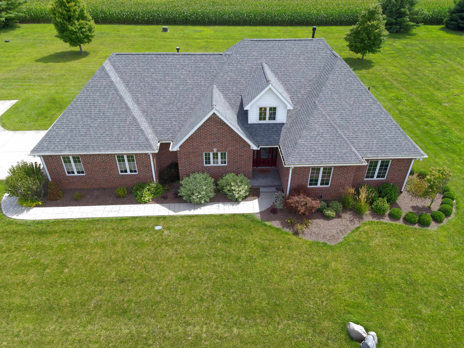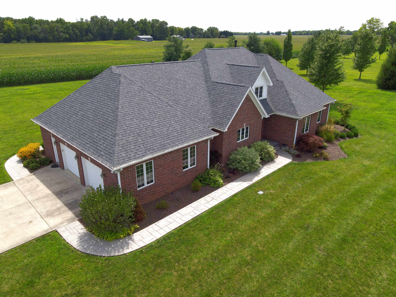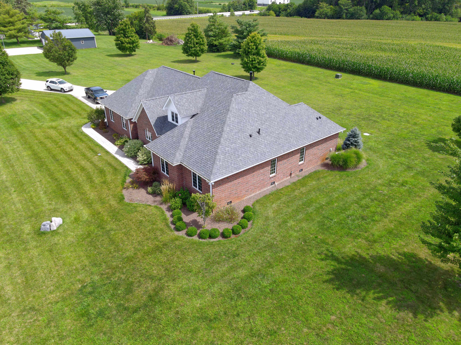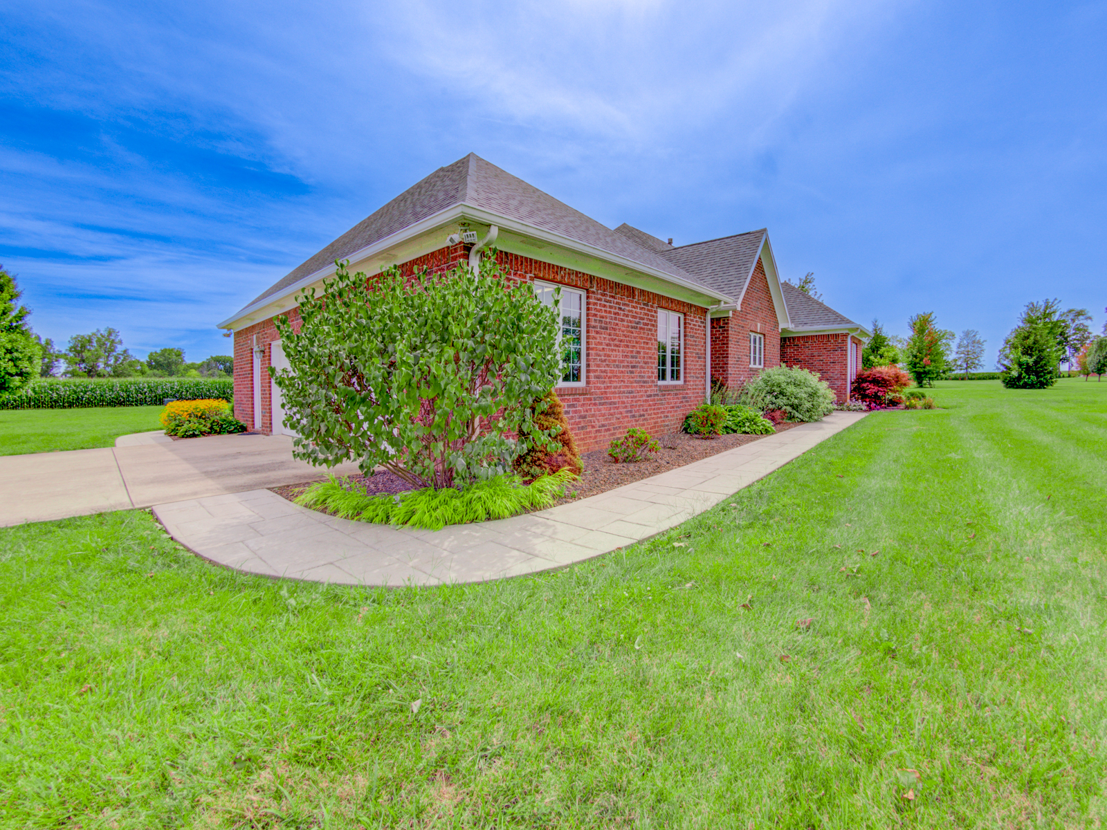 Wow don’t miss this one! A lovely custom built all brick ranch on 4.73 ac lot, 3 bedroom, 2.5 baths. Well thought out design & perfectly located on the lot with space for a future pool in back. Septic to the west. A water system professionally installed for the landscaping around the house. Separate 1200 sqft pole barn w/electric and concrete drive. The home features cherry hardwood floors throughout, a recently updated primary ensuite bathroom. Roof 2 years old, kit has tons of cabinets, a lrg walk-in pantry, built-in appliances, granite countertops, open concept with kitchen, GR and DR all open with a fireplace as the centerpiece. Fr Plc recently refaced and upgraded. Dedicated laundry w/storage, a covered porch in the back & lrg 2CG.