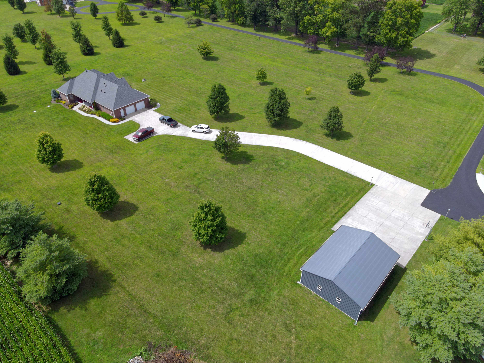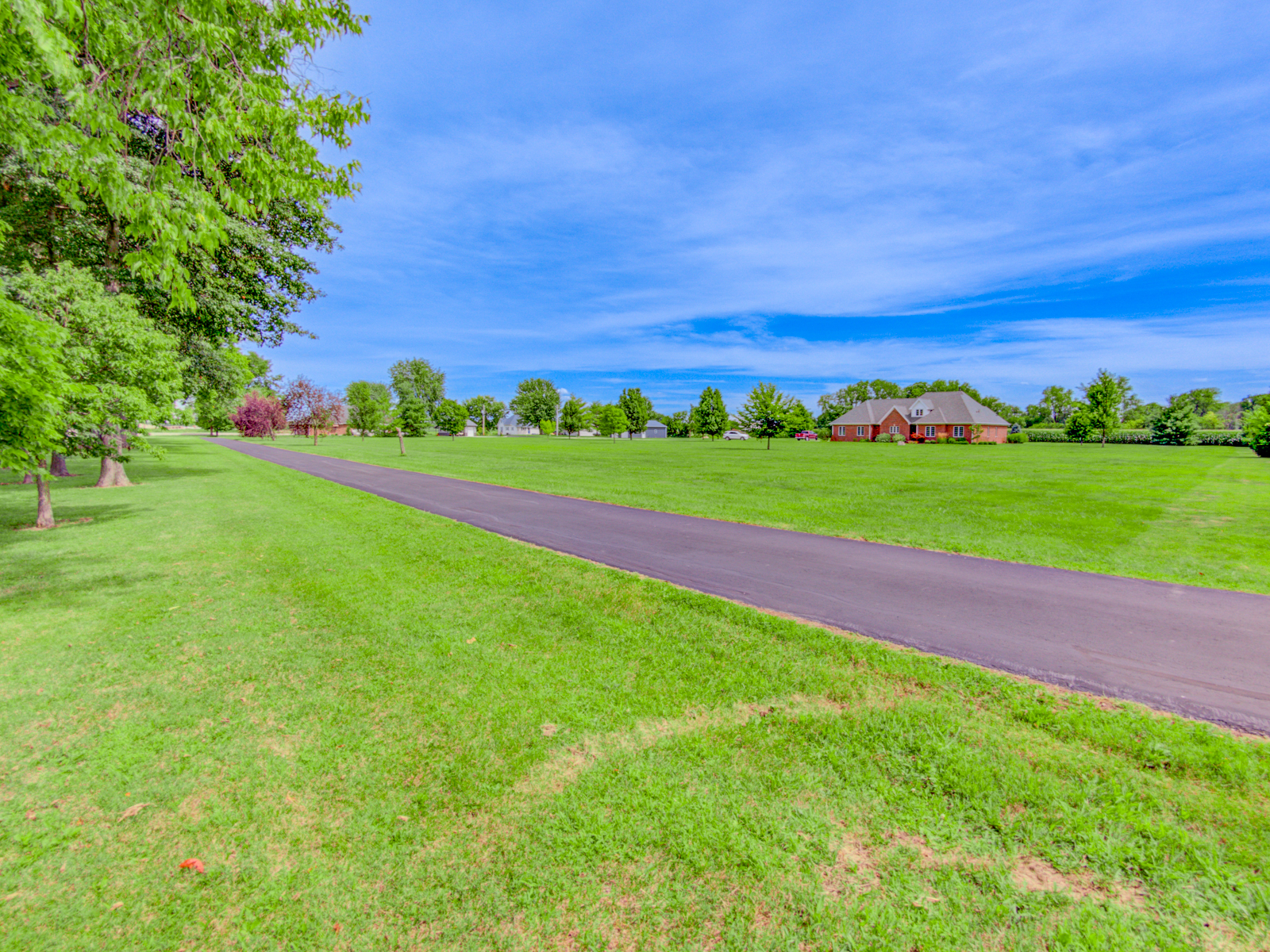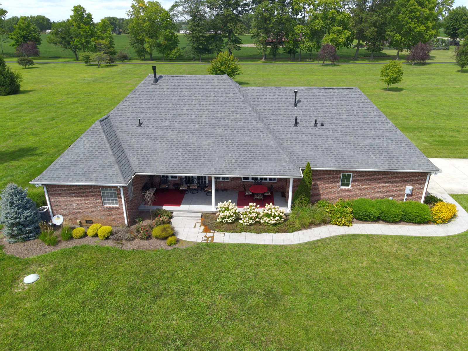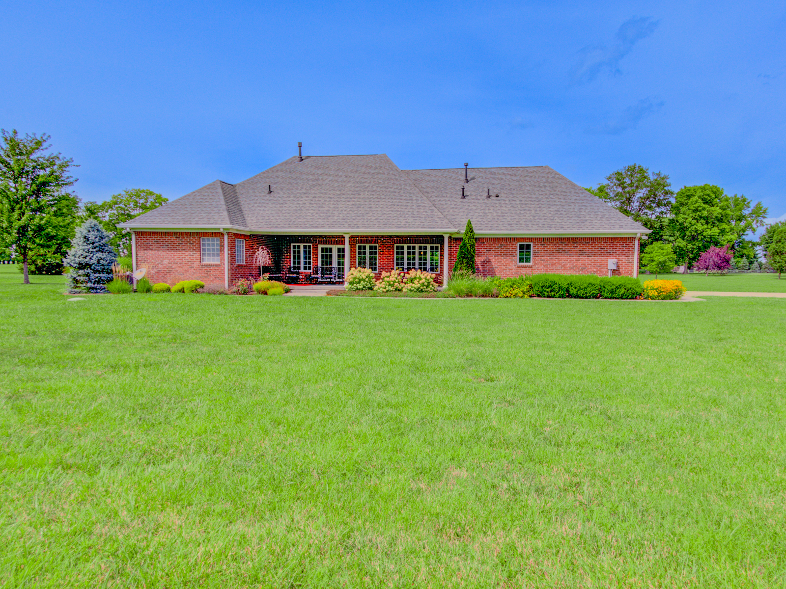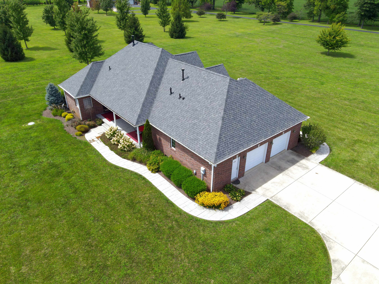 Wow don’t miss this one! A lovely custom built all brick ranch on 4.73 ac lot, 3 bedroom, 2.5 baths. Well thought out design & perfectly located on the lot with space for a future pool in back. Septic to the west. A water system professionally installed for the landscaping around the house. Separate 1200 sqft pole barn w/electric and concrete drive. The home features cherry hardwood floors throughout, a recently updated primary ensuite bathroom. Roof 2 years old, kit has tons of cabinets, a lrg walk-in pantry, built-in appliances, granite countertops, open concept with kitchen, GR and DR all open with a fireplace as the centerpiece. Fr Plc recently refaced and upgraded. Dedicated laundry w/storage, a covered porch in the back & lrg 2CG.
