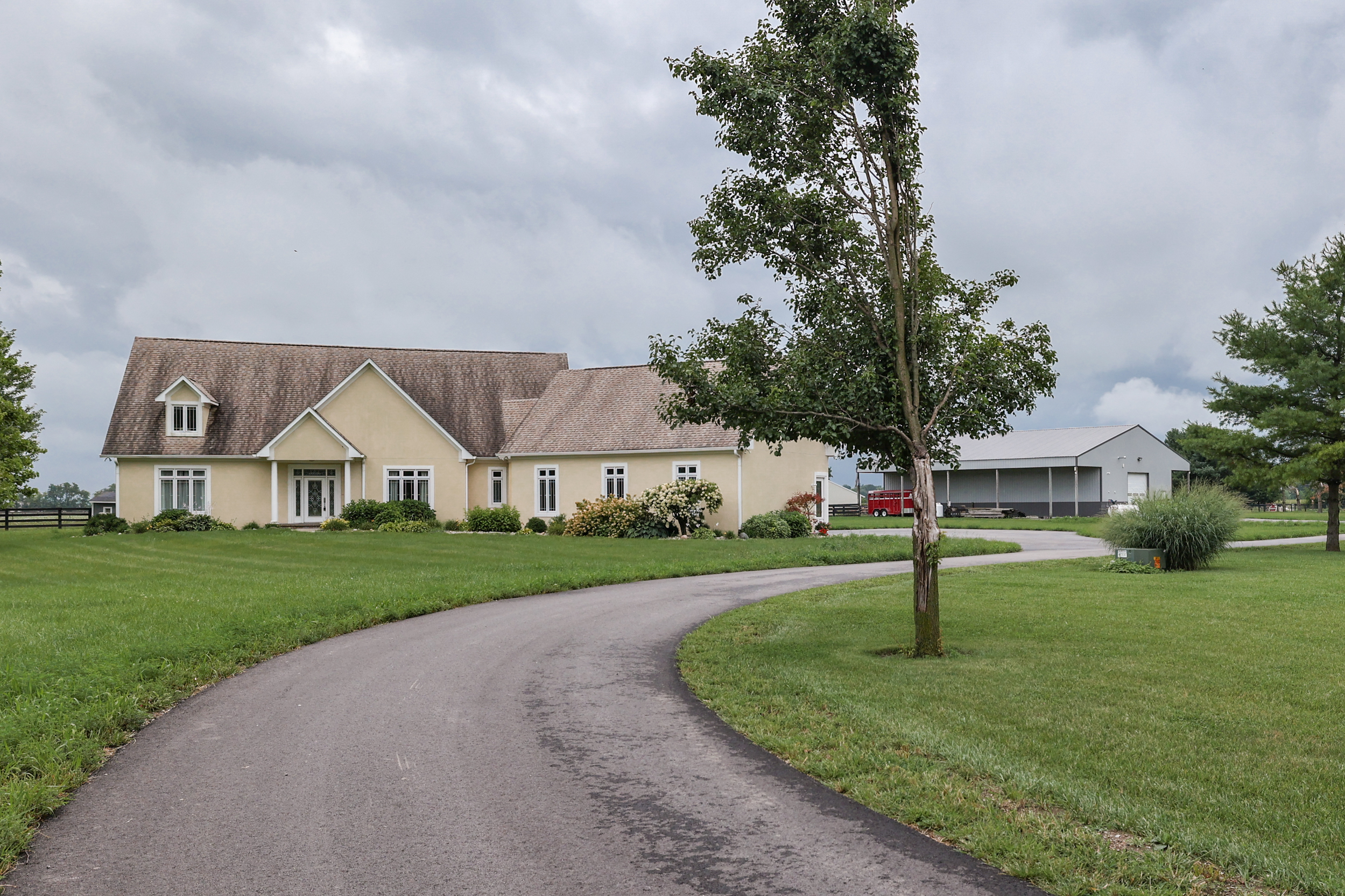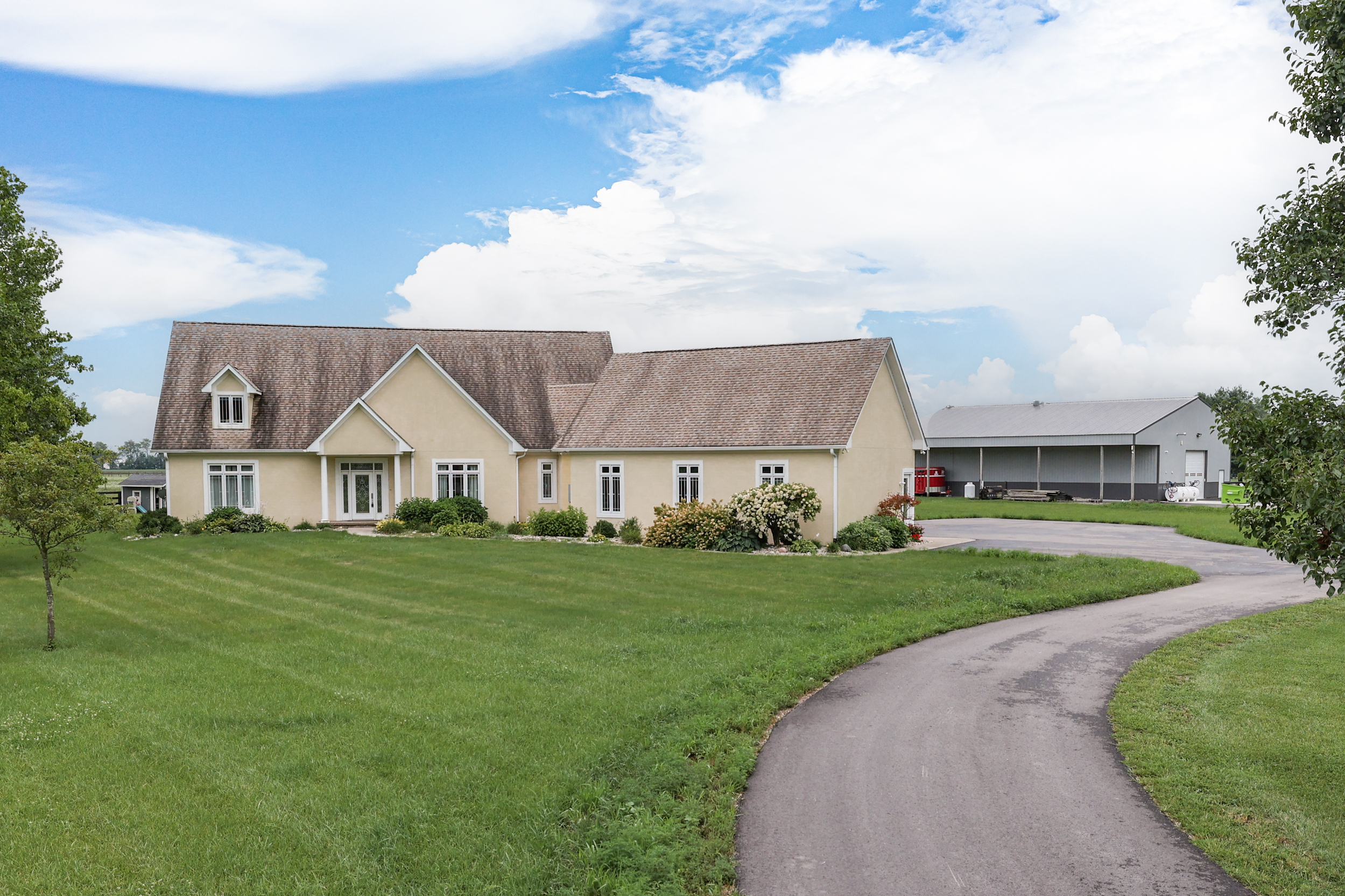 Beautiful 3 BR. 2.5 BA home on 9.08 acres. Master on Main w/ beautiful MBA w/ soaker tub, stand alone shower w/ rain shower head, dual sinks. GR & Formal Dining 2 story. Eat in Kit. looks out to newly poured patio, pool and playhouse. Fence line beyond yard to field. Laundry Room/Mud Rm. off of Garage. HBA off Laun. Rm./Kit. area. 2nd level boasts of BR 3 & loft. Studio apt. or 4th BR. entry off of loft. Separate entry into garage & from garage to studio apt. or 4th BR. Studio apt. w/ kit., bathroom w/ walk in shower. So many plus’s to this home! Lg. 72’X40′ heated Building/Barn w/ dual doors on property as well for property work equip. or “play” equip. Also boasts of separate store room! Don’t miss out on this Gem!! Country Living.