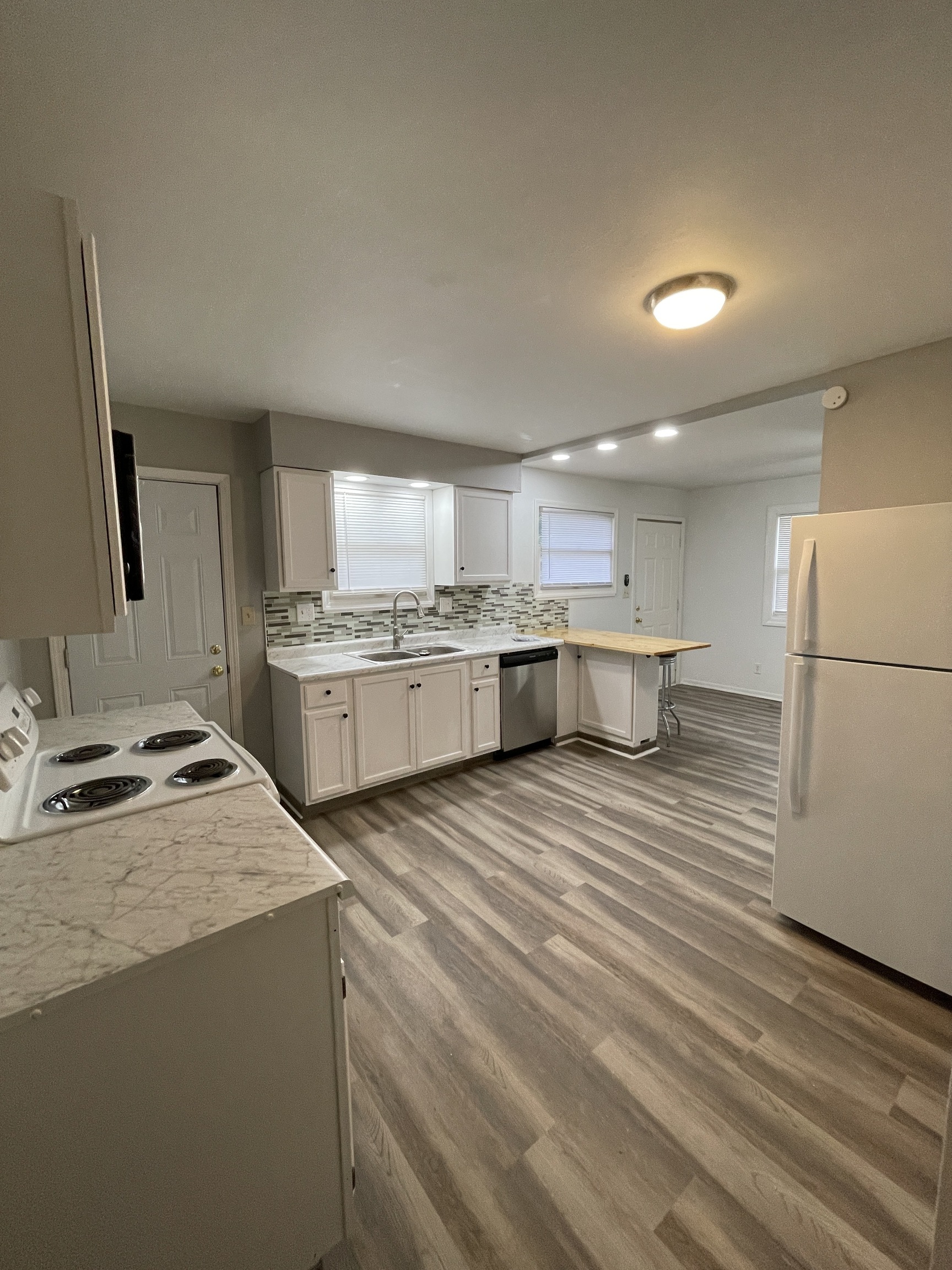 Stylish two-bedroom 1 bath ranch styled duplex, with an exquisite wrap around, wooded patio deck w/graveled driveway parking. Located on the Westside of Indy, easy access to the Motor Speedway, Local Shopping near West Washington and the new highway system. Welcome inside a fully modernized updated home w/new hardwood vinyl floors, new paint, ceiling fan, recessed lighting, window treatments, well-crafted breakfast bar w/stools fully remolded kitchen w/ new cabinets, marble counter tops, all appliances w/micro hood and dishwasher, main flr, washer and dryer hook-up, decent size bedrooms, inviting bathroom w/ all new amenities marble styled shower surround and so much more Don’t miss out on the cool pad schedule your viewing today!