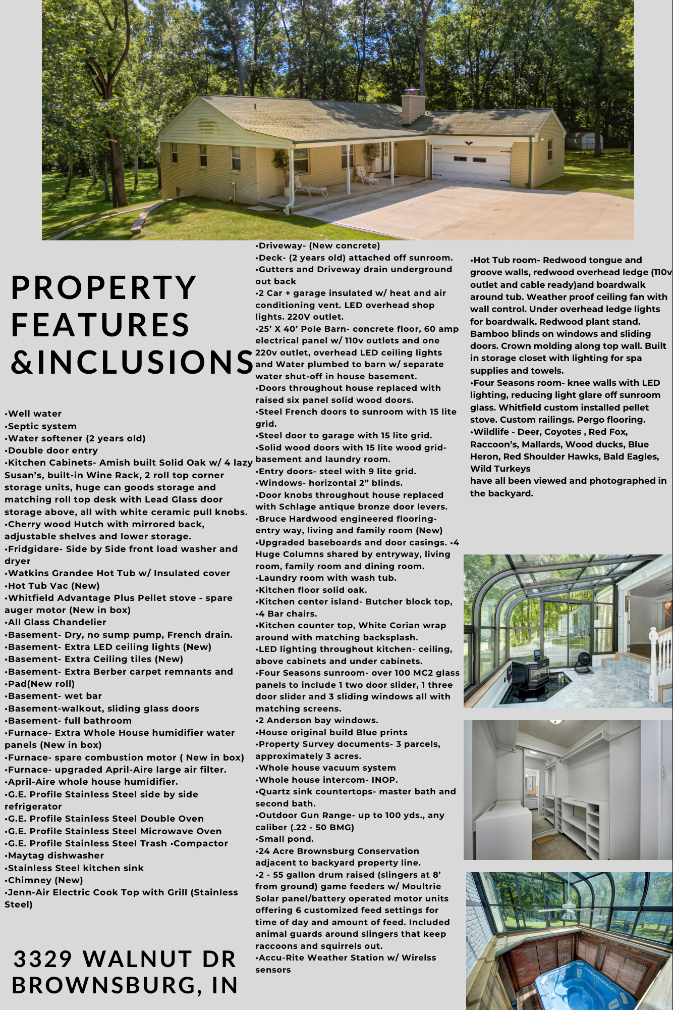 At the end of its lane in Brownsburg sits this immaculate brick ranch on 3 parcels of nearly 3 acres of land! The open concept living room is more than welcoming when cozying up next to the wood-burning fireplace (with built-in wood storage). Walking through the spacious kitchen & large dining room, you will find a four seasons sunroom that houses a pellet stove to make the area perfect for observing the abundance of wildlife year-round! The finished, full size walk-out basement contains a wet bar and plenty of space for entertaining, including the custom hot tub room. 25’x40′ pole barn with h20/electric. 100 yard shooting range. Pond. ****Multiple Offers Received. Highest & Best offers due by Sunday Sept 10 at 8:00 p.m.