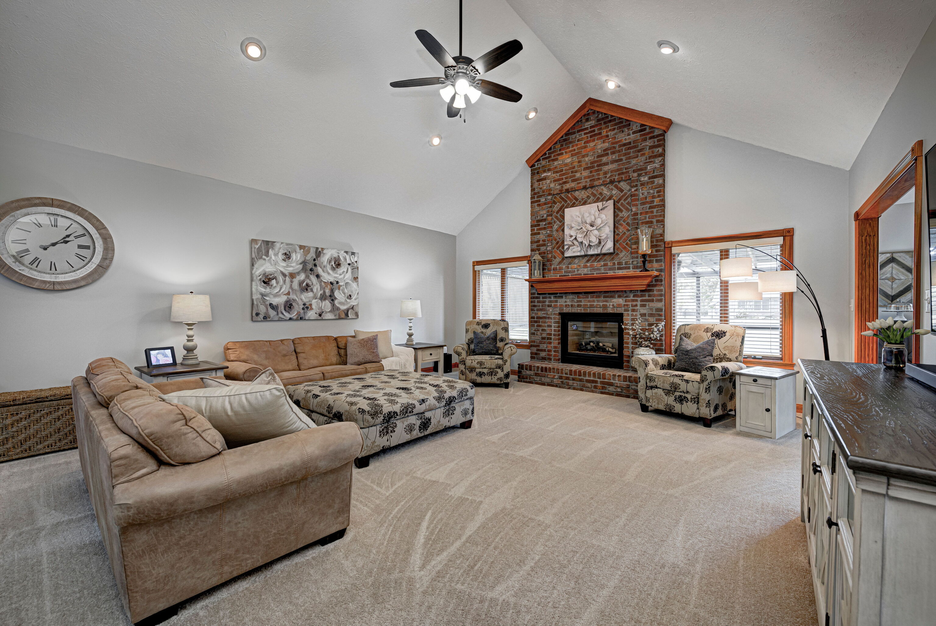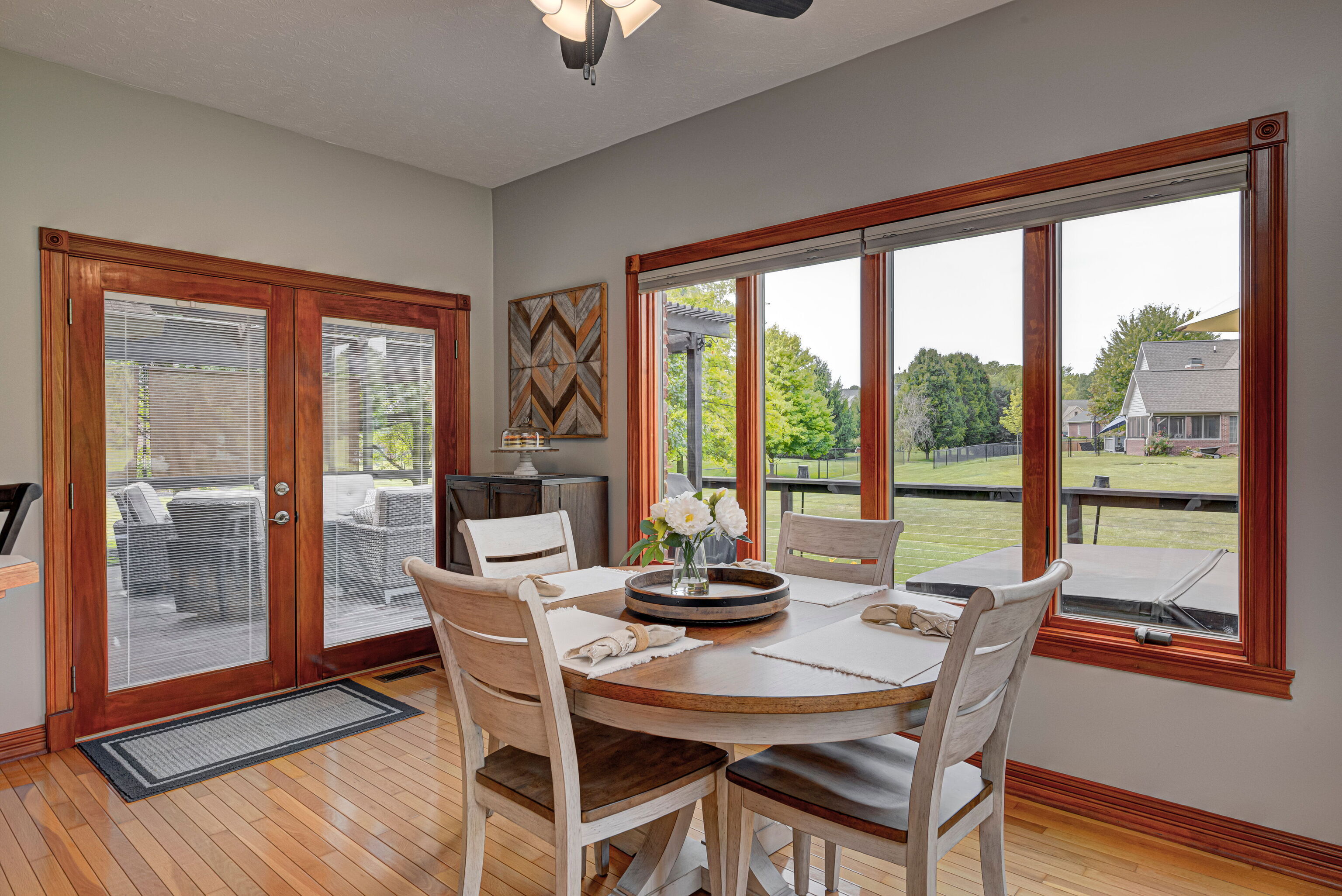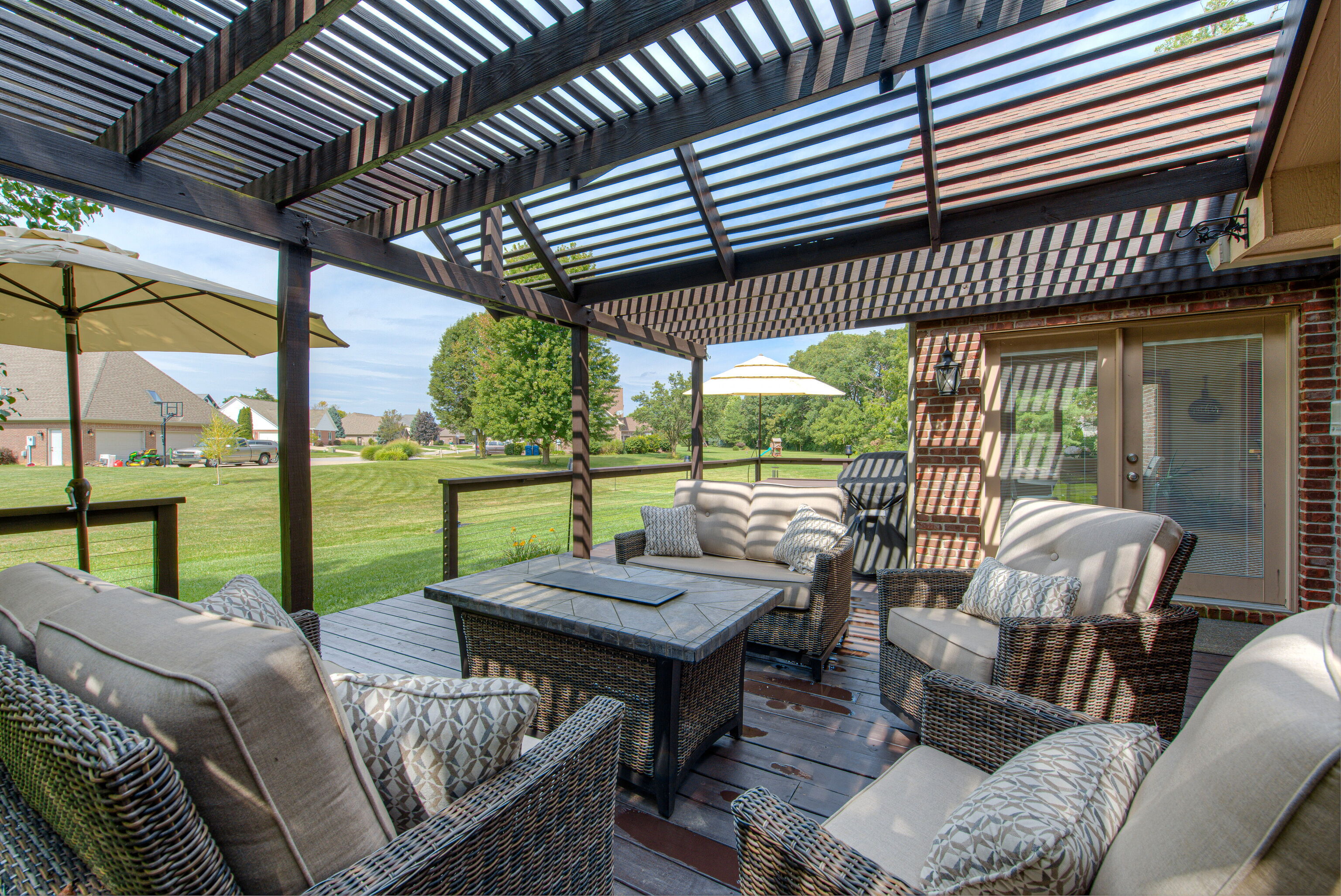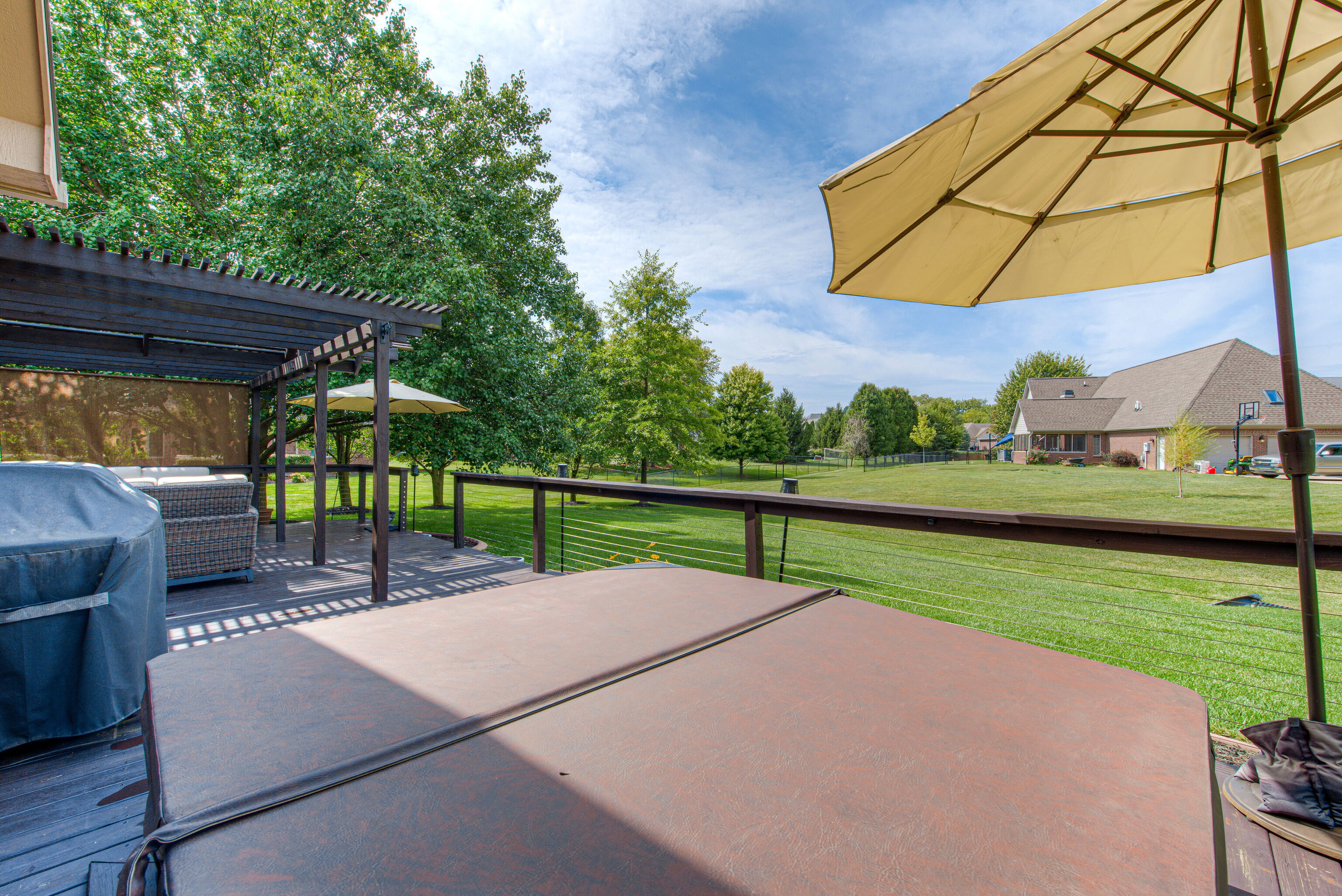 CUSTOM RANCH HOME IN NORTH FOREST COMMONS | Welcome to this well planned, maintained and designed Tom McKinzie custom-built brick 4-bedroom, 2.5-bathroom, 3-car oversized garage home w/upstairs flex space currently being used as a home gym but could be used as a 4th bedroom, attic storage, hardwood floors & Anderson Windows. Entering the home from large front porch, you’ll love the soaring ceilings, brick fireplace, custom millwork & crown molding. Split floor plan features main level primary bedroom suite. Enjoy the outdoor living area that includes a 502 sq ft deck w/hot tub and pergola. Home sits on professionally landscaped, irrigated 1/2-acre lot w/mature trees that has no neighbors on east line. House is very close to Indianapolis airport, interstate system, downtown Indy, trails, parks, restaurants & shopping. Avon Community Schools.