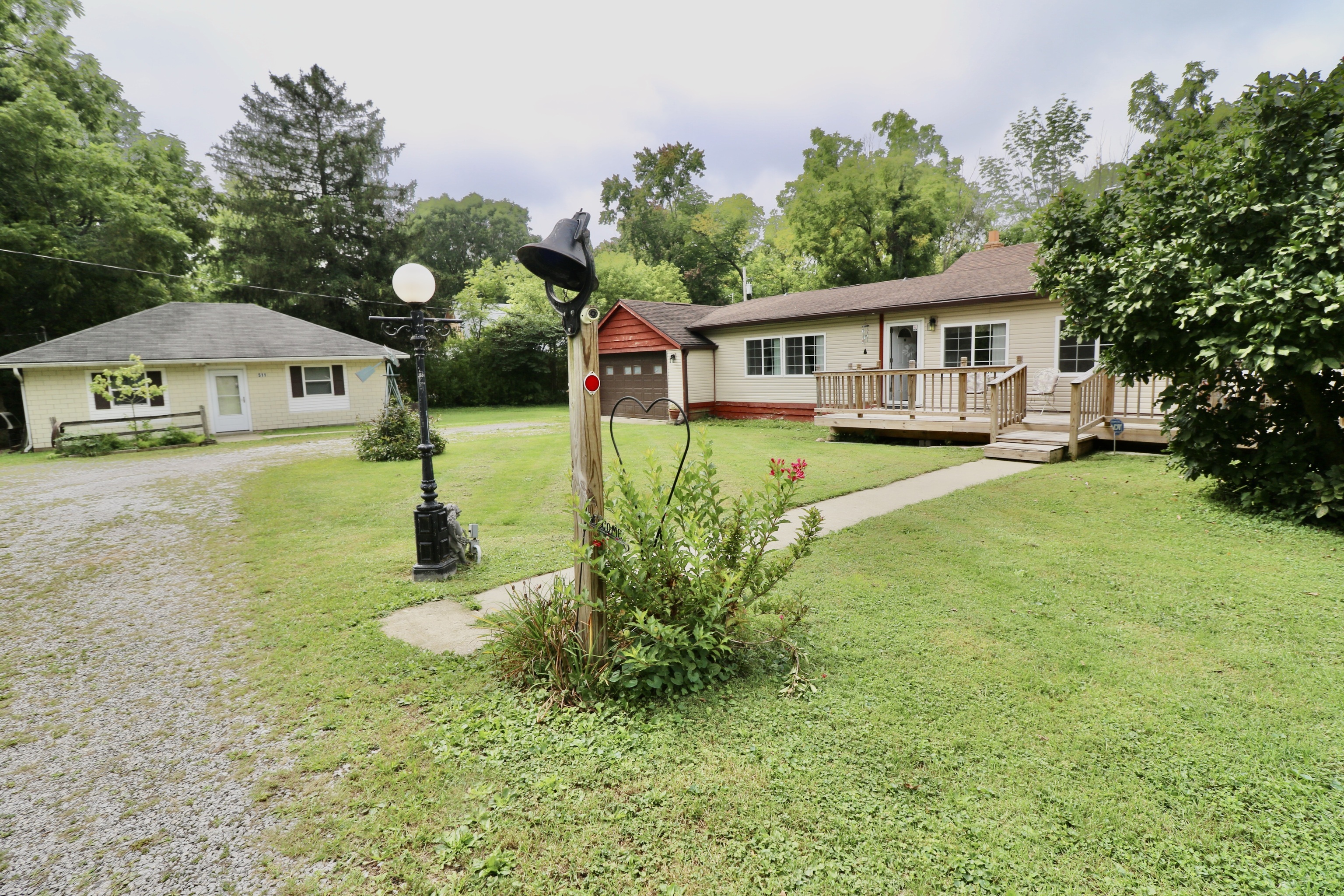 This 3 bdrm, 2 full bath home is inviting & offers many sought after amenities. Remodeled kitchen, new windows w/ transferable warr, new doors, HVAC w/ C/A, wood burning stove, formal dining rm, multiple outdoor entertaining areas, fenced in area for children or pets, basement & MORE. Kitchen has an abundance of cabinetry including: pantry, center island w/ electric cooktop, OH ventilation, double oven & all kitch appliances will remain. Additionally, property has a 705 sqft guest house or rental opportunity w/ new elect f/a furnace. Lastly, 2 car att garage & a detached 585 sqft 1 car workshop all on the premises! Bordered by woods on .58A yet within walking convenience of downtown & school. Seller is providing a 1 yr home warranty