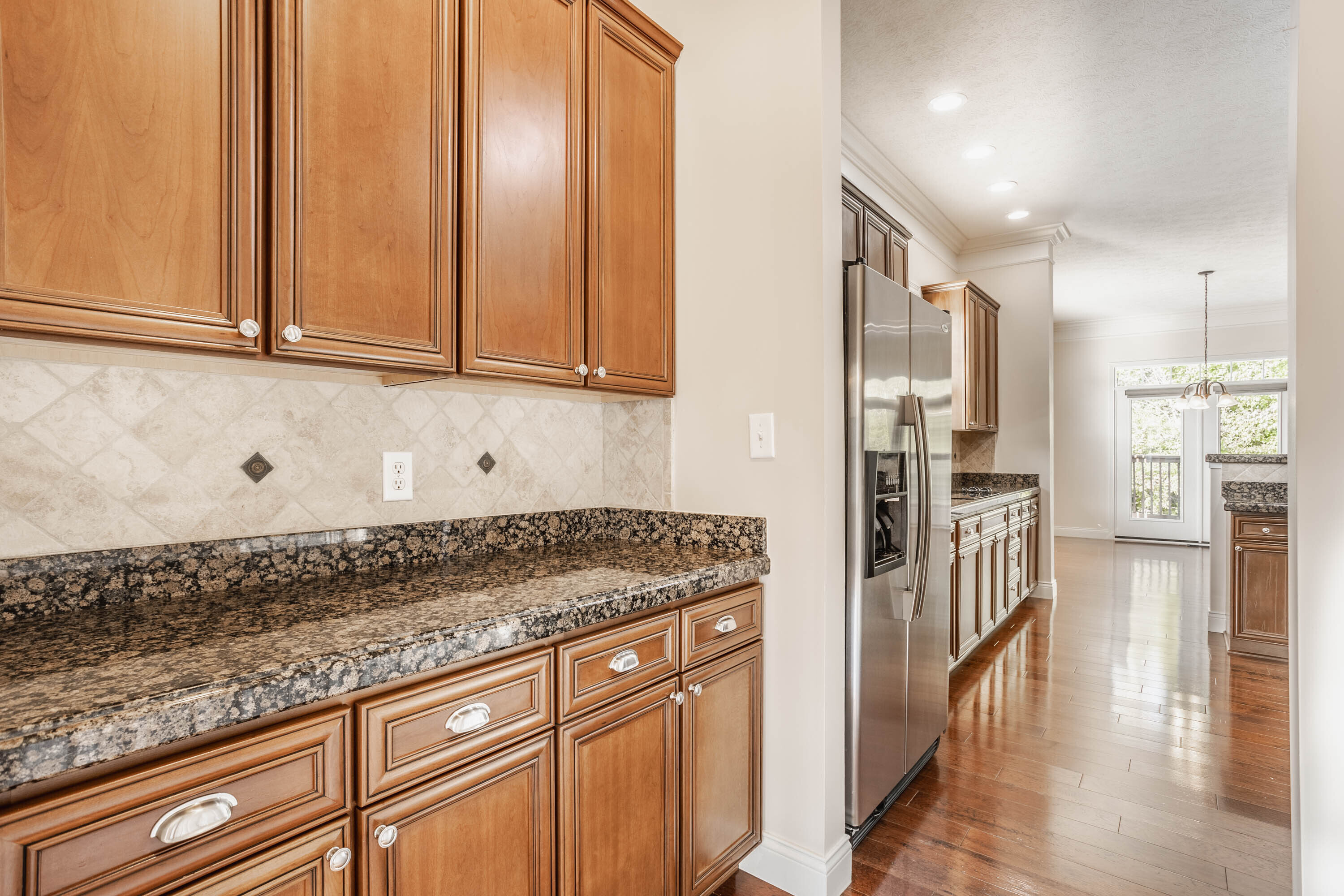 BEAUTIFUL END-UNIT WITH DISTRESSED HICKORY FLOORING THAT FLOWS THOUGHOUT SPACIOUS MAIN LEVEL COMPLEMENTING THE EXTENSIVE TRIM WORK, ABUNDANT WINDOWS, WROUGHT IRON STAIRS AND 10′ CEILINGS. UPSCALE KITCHEN INCLUDES GRANITE TOPS & UPGRADED CABINETS. HUGH 10’X20′ DECK WITH NATURAL GAS GRILL CONNECTION OVERLOOKS WOODED TREE LINE. FULLY FINISHED LOWER LEVEL IS COMPLETE WITH THEATER SOUND WIRING, 500+ BOTTLE SEPARATELY COOLED WINE CELLAR, MUD ROOM AND THE 3RD FULL BATH. UPPER LEVEL HAS SEPARATED MASTER SUITE WITH SITTING ROOM & BALCONY.