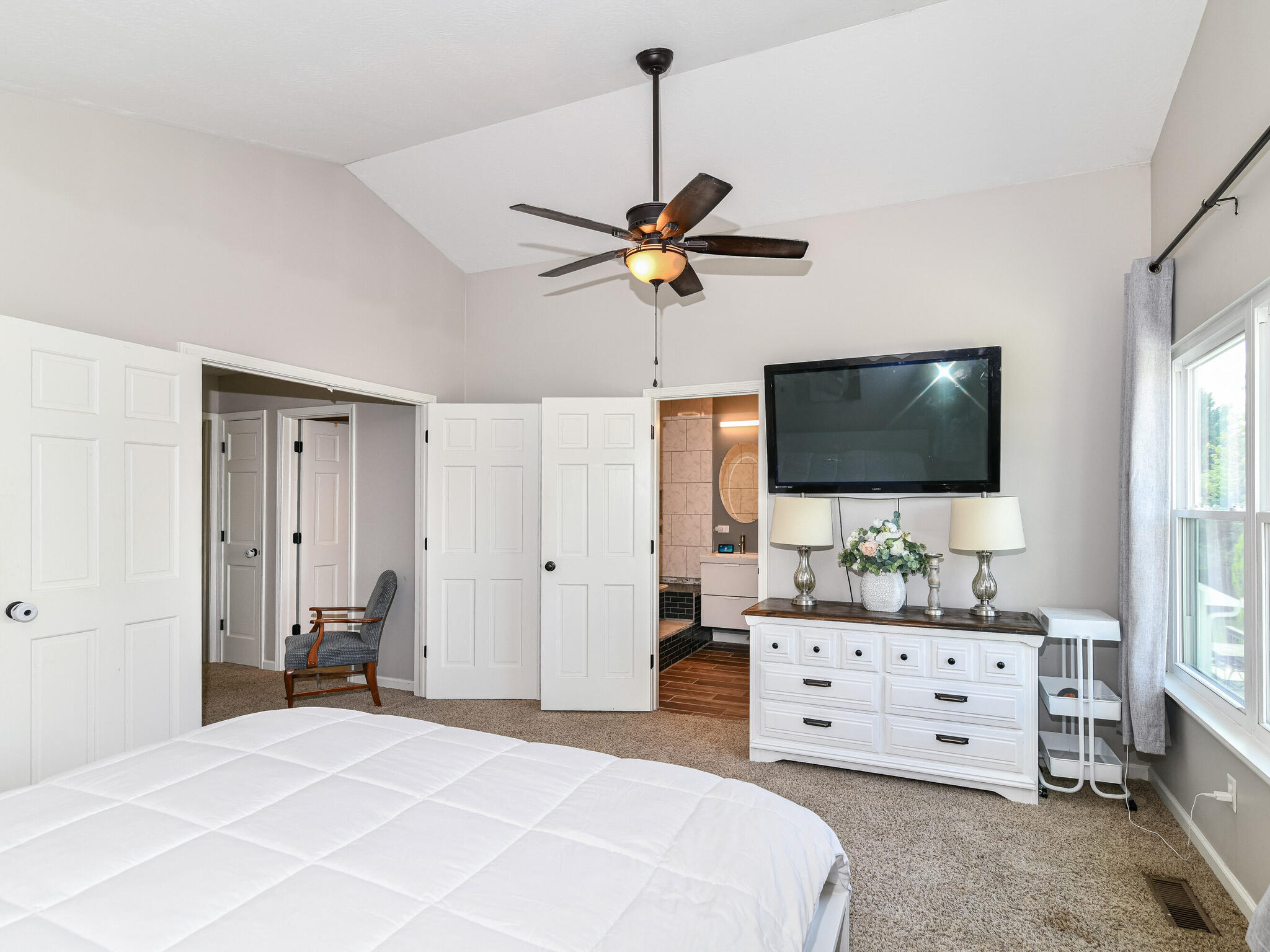 You’ve found it! Updated 3 bed, 2.5 bath boasting over 2,000sqft with an open floorplan and revived spaces throughout. Brand new roof and gutters in 2023, updated paint, remodeled master bathroom showcasing a beautiful tiled soaker tub/shower with built in Bluetooth speaker. Spacious kitchen includes stainless appliances, granite counters, double pantry, and breakfast bar flowing into the dining room with a wood burning fireplace. Vaulted great room includes new upgraded mini-split HVAC system featuring a bar with built-ins perfect for indoor/outdoor entertainment on the connected refinished deck and fully fenced in backyard. Nestled in quiet Boulders At Geist with no HOA, conveniently located near grocery, restaurants, and Geist Reservoir.