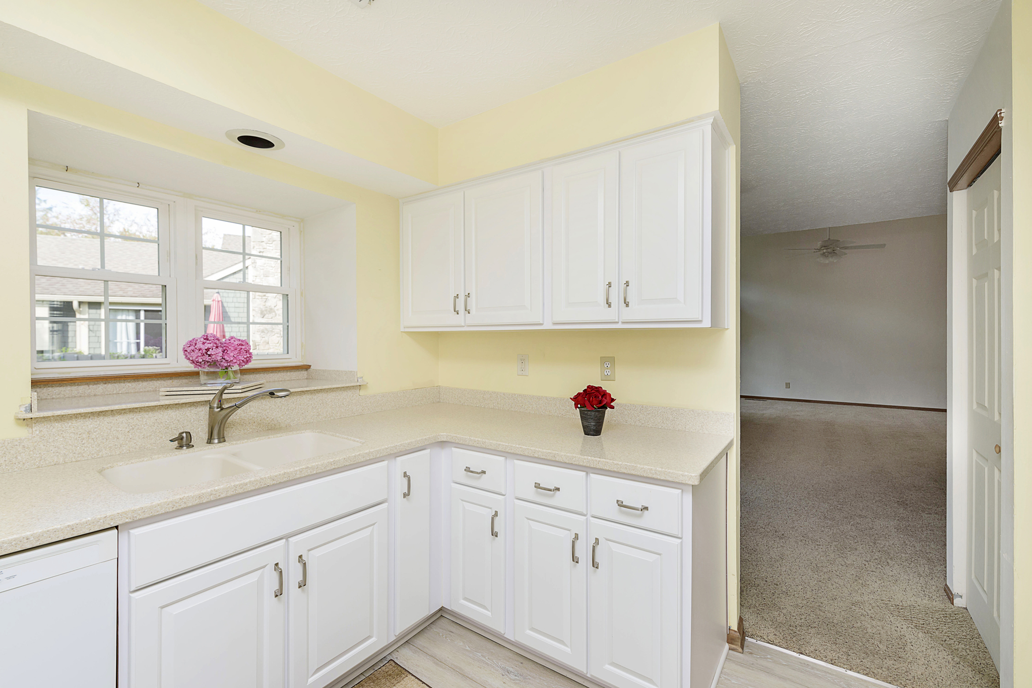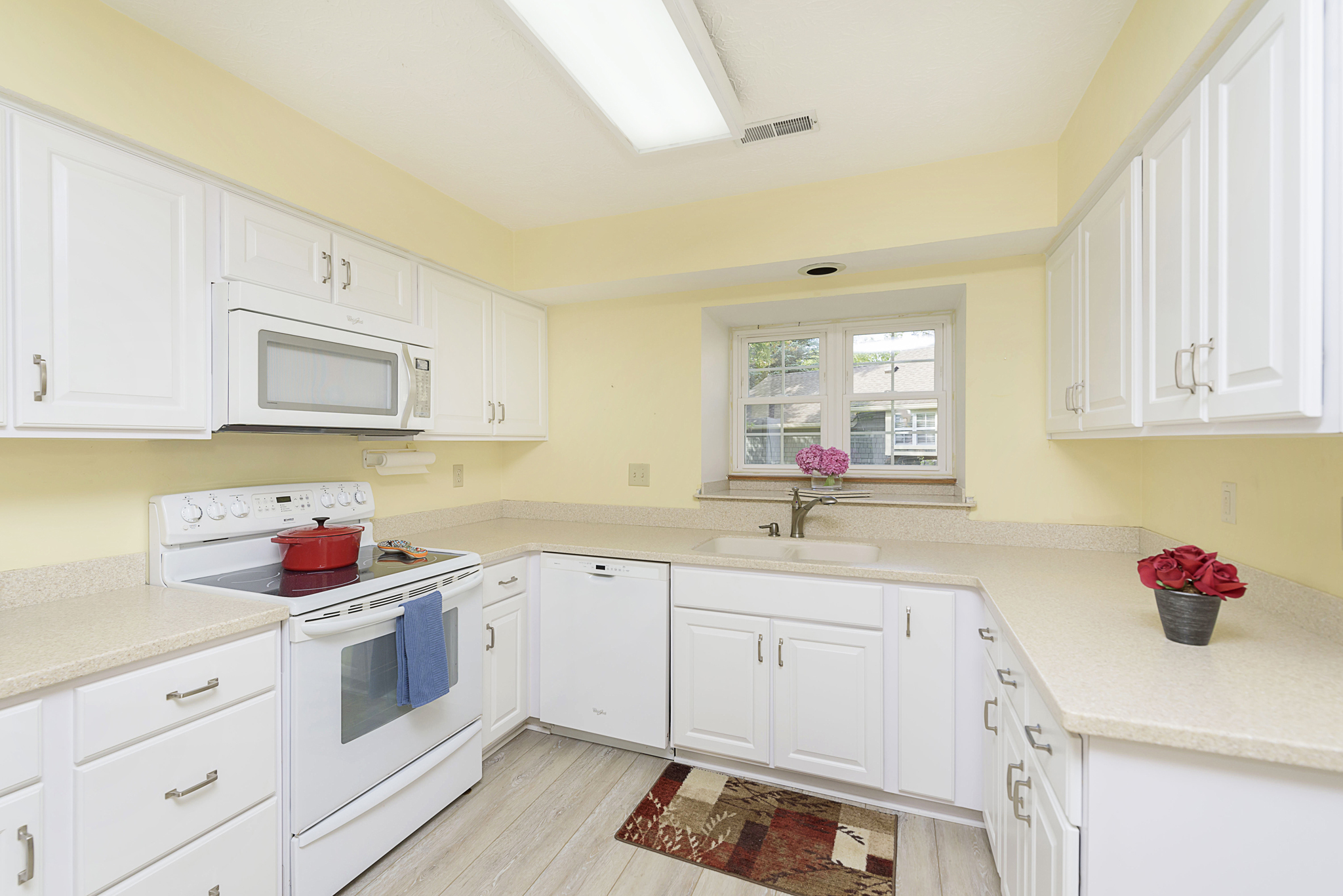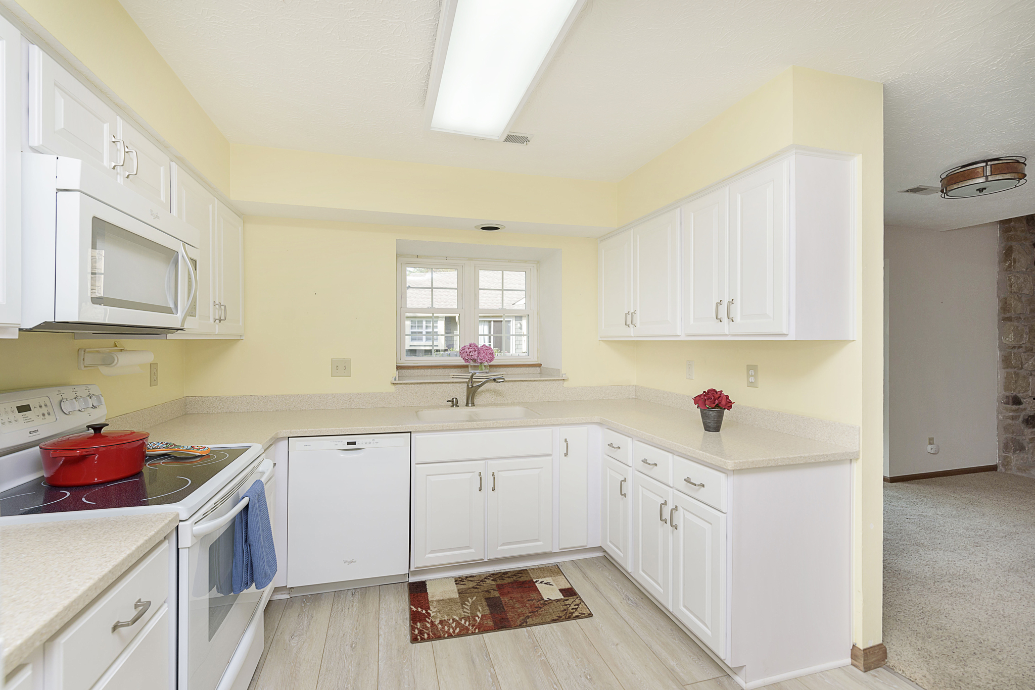 Seldom available-Beautiful 1-level-2 car garage, end unit condo in Cobblestone. Great room with vaulted ceiling and a floor to ceiling gas fireplace. Large master bedroom suite with pond view from all the windows. Vaulted ceiling and walk-in closet. Updated private bathroom with Walk-in shower, double sink vanity and extra storage cabinets. Second full bath with tub has also been updated. Eat-in kitchen has newer cabinets W/Corian counter tops. Large deck with pond view. Newer windows and patio door. Beautiful landscaping. Enjoy Eagle Creek Park, reservoir, walking trails or dinner at Ricks Cafe Boatyard watching the sailboats. Downtown Indy and airport minutes away. Oh, yes, there’s a community pool for those hot summer days.