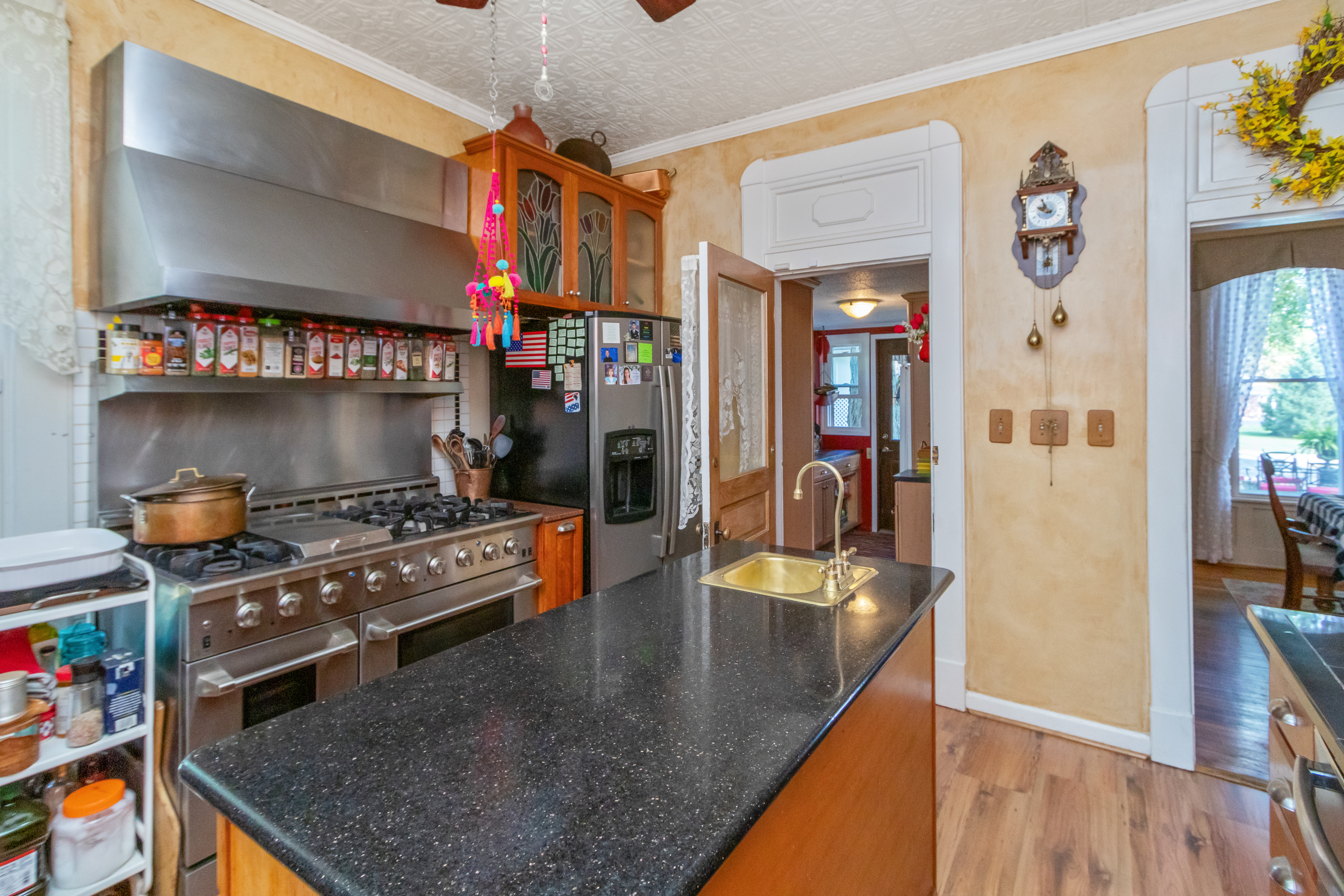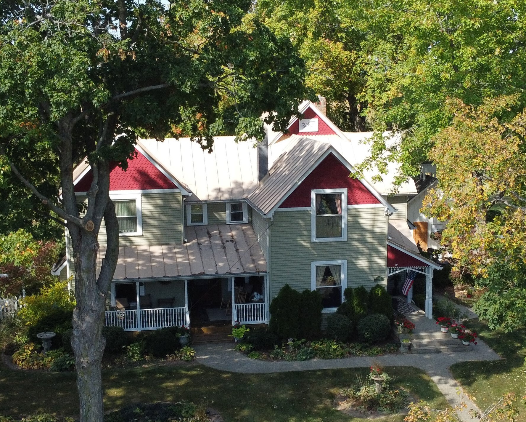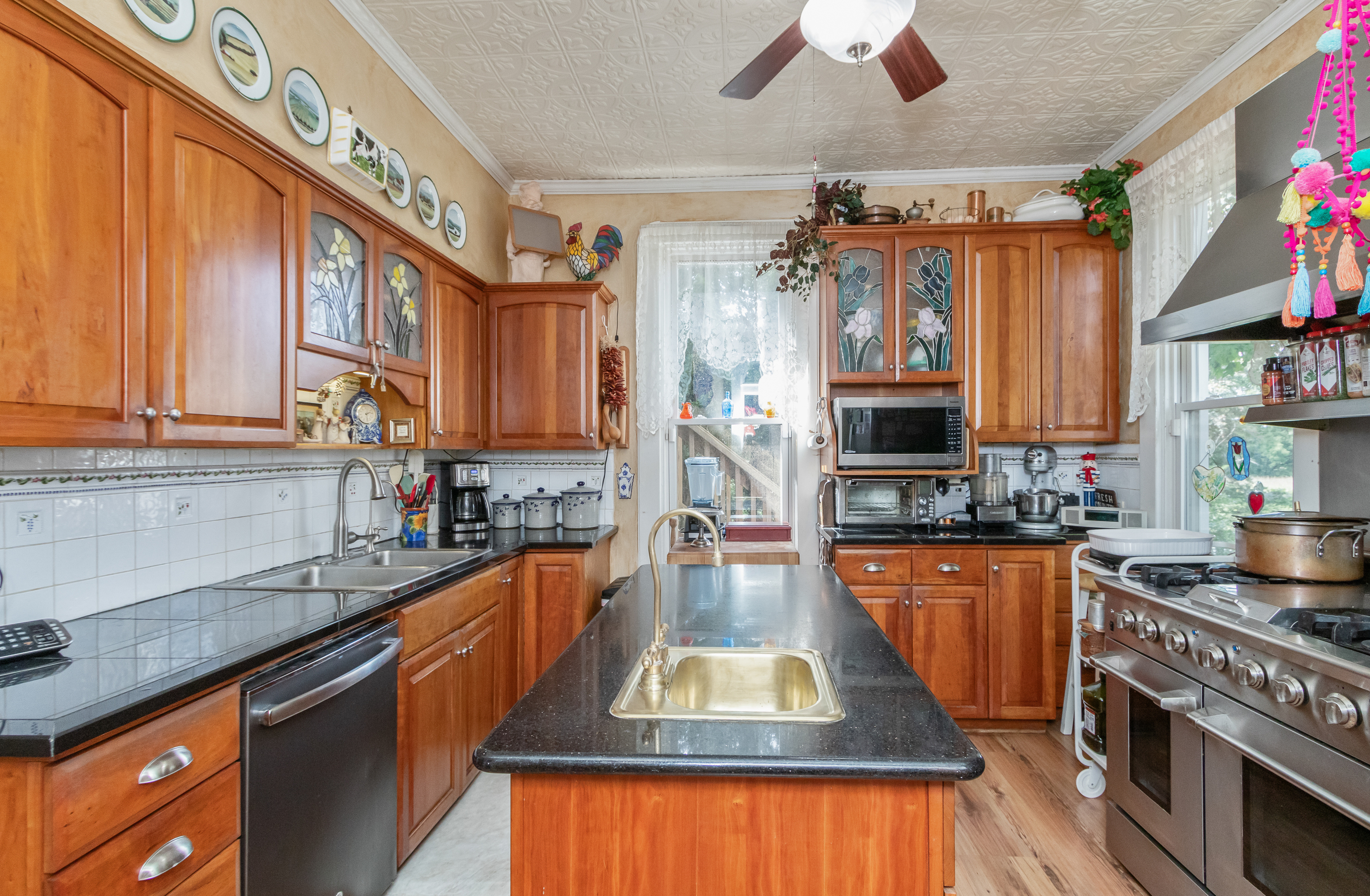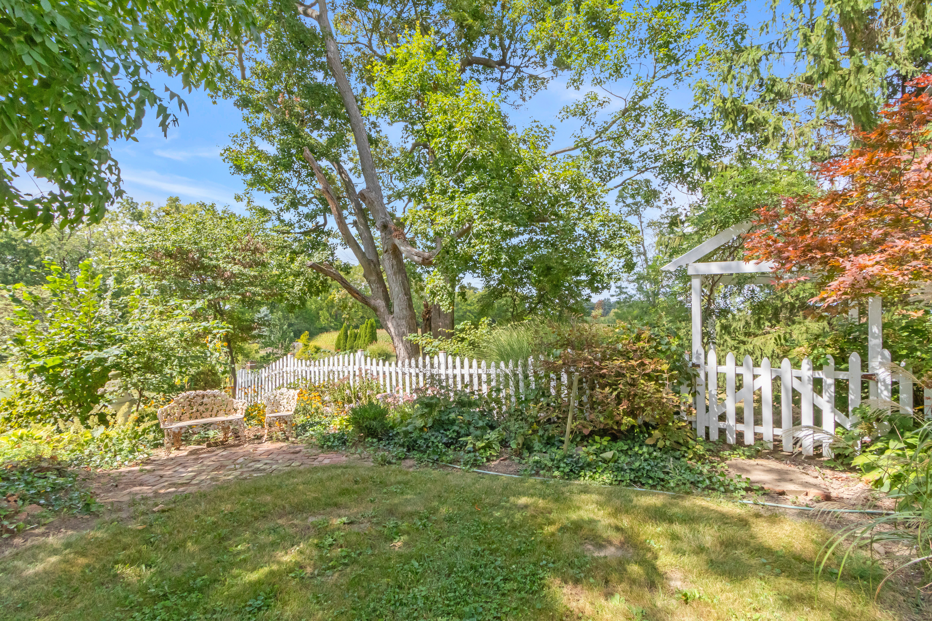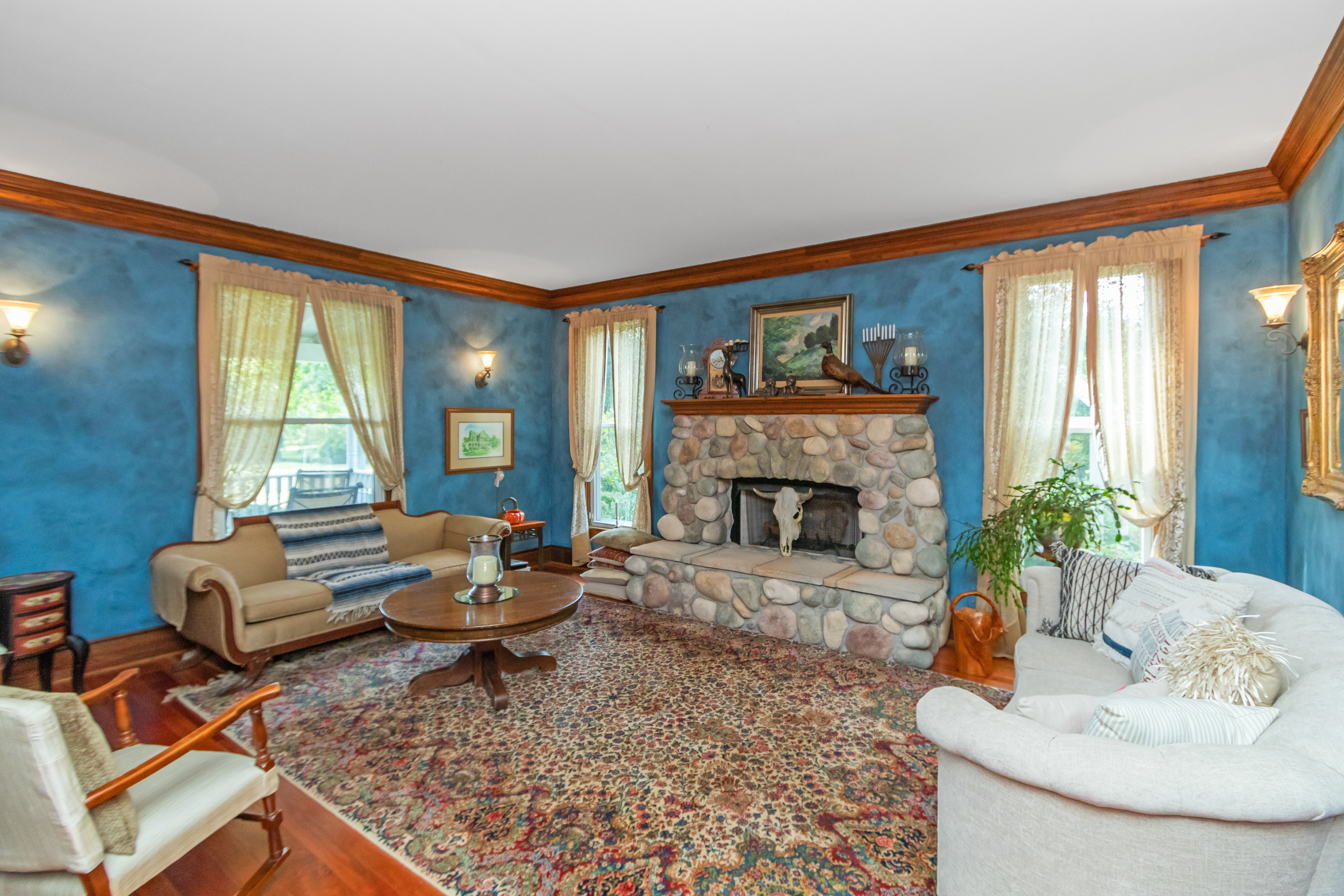 Beautifully updated early 1900’s Farmhouse – Remodeled -added 3 master bedrooms with baths, family room & large front porch. Many upgrades: windows, Kitchen, baths, fireplace, HVAC & flooring. Idea layout for a mother-in-law downstairs area using west family rm wine bar, foyer, bed & bath. Has over 532 feet road of frontage with much rock fencing. 4 Bedrooms plus bonus 3 rooms of Exercise, Setting & Den. Outside covered porches, upstairs outside deck and large wood patio deck in back. The outside patio & flower gardens are very beautiful. Fenced rear yard for dogs(s). 3 Out-buildings- 2 garages and the old original milk house. West flower garden is extensive and includes many shrubs, plants and flowers. Custom cherry kitchen cabinets, granite & marble tops.
