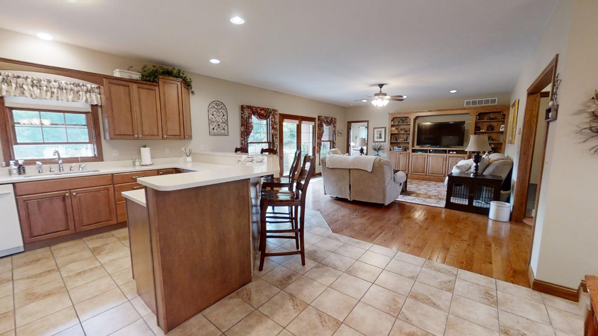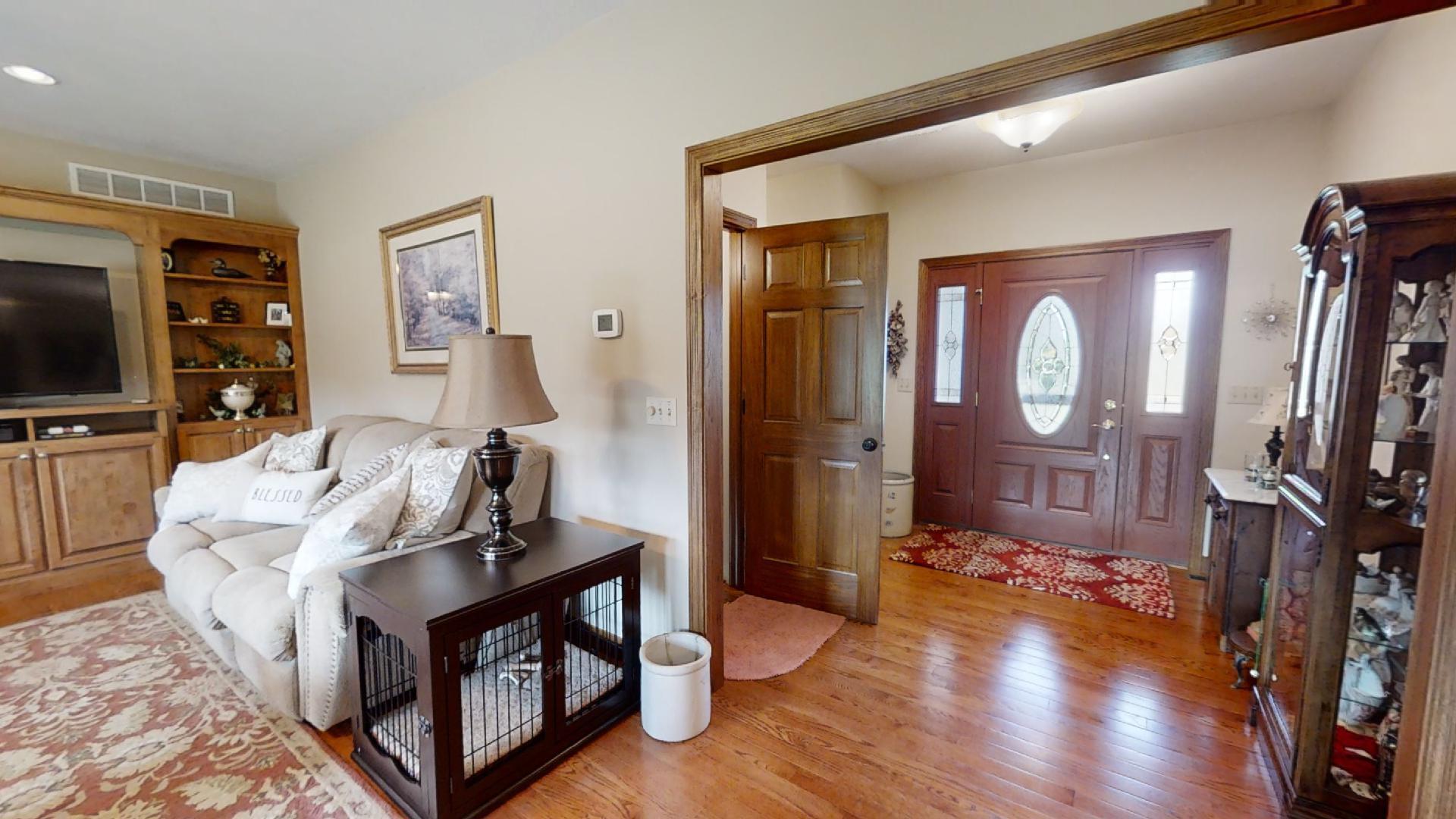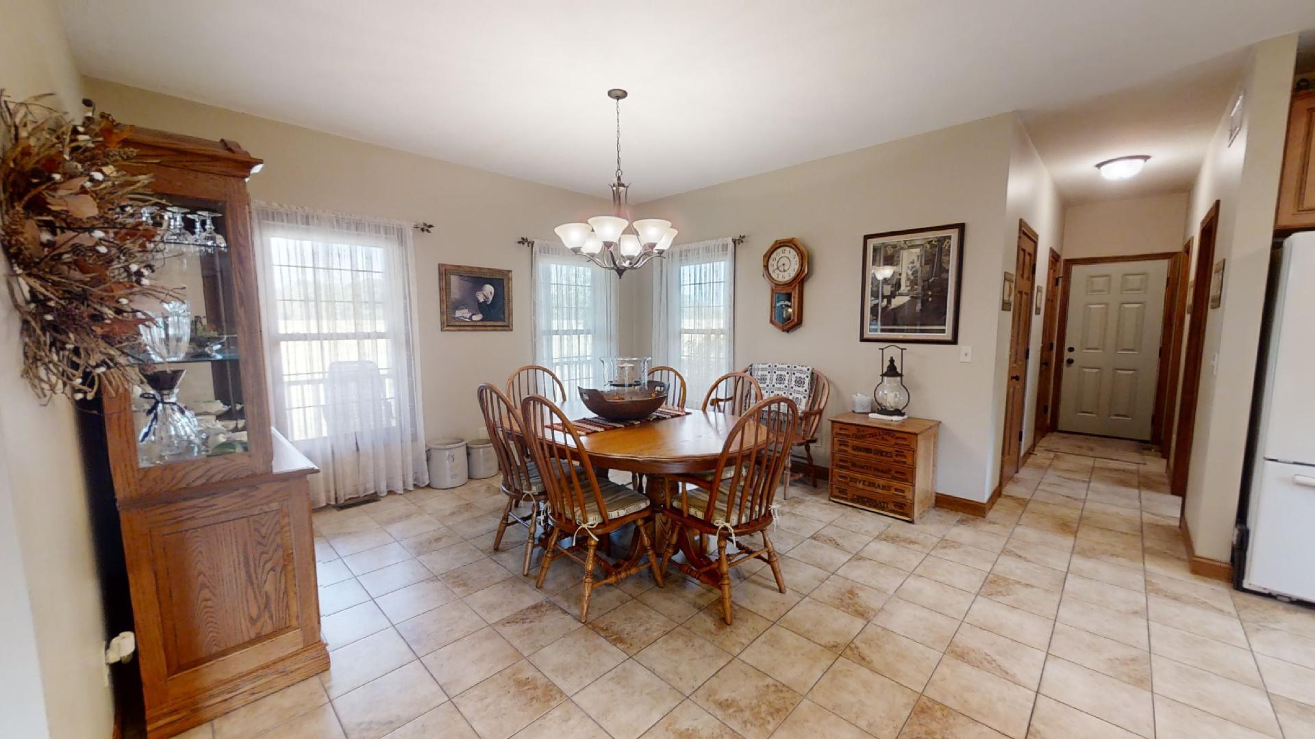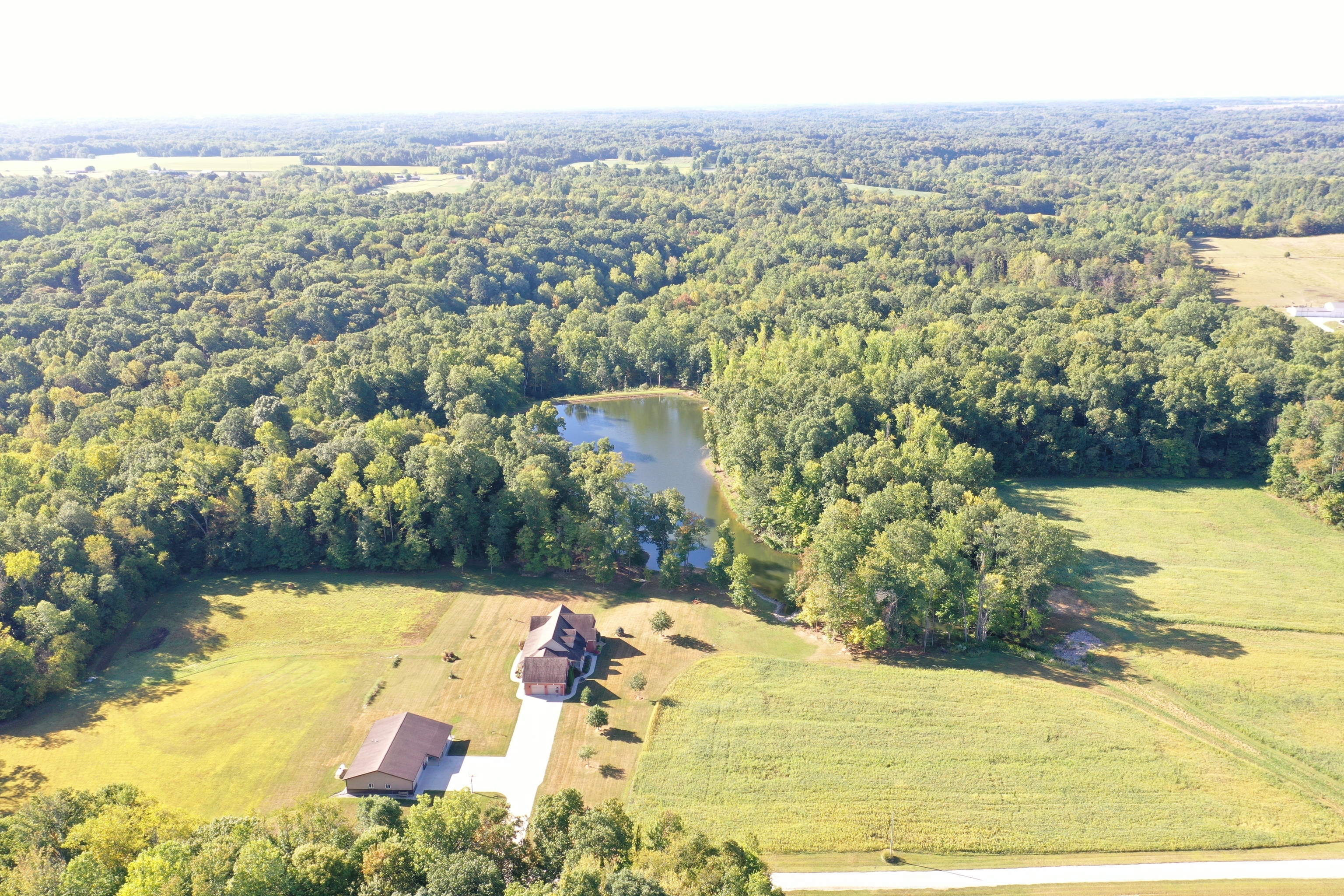 Breathtaking panoramic views of the 102 acres and 5-6 acre stocked pond! Privacy and space is yours with 3 bedroom, 3.5 bath, Brinkman-built brick ranch. Open floor plan with split bedrooms. Ample kitchen cabinets with large walk-in pantry and solid surface countertops. Geothermal heat and air. Oversized two-car garage with an unfinished 26×13 bonus room above garage. Full walkout basement with finished walls, full bath and large storage room under covered porch. Pole building has 1,200 sq. ft. of living quarters which include a 15×11 kitchen, 14×23 living room, 15×15 bedroom, 7×7 laundry room and full bath. There is also 1,200 sq. ft. of garage and storage area which also includes a cooled hanging room for deer. Drive is shared.