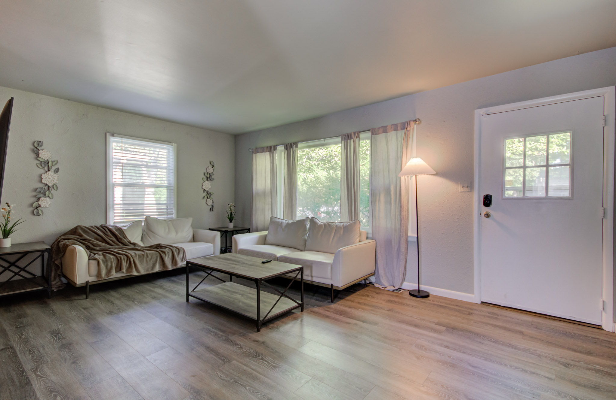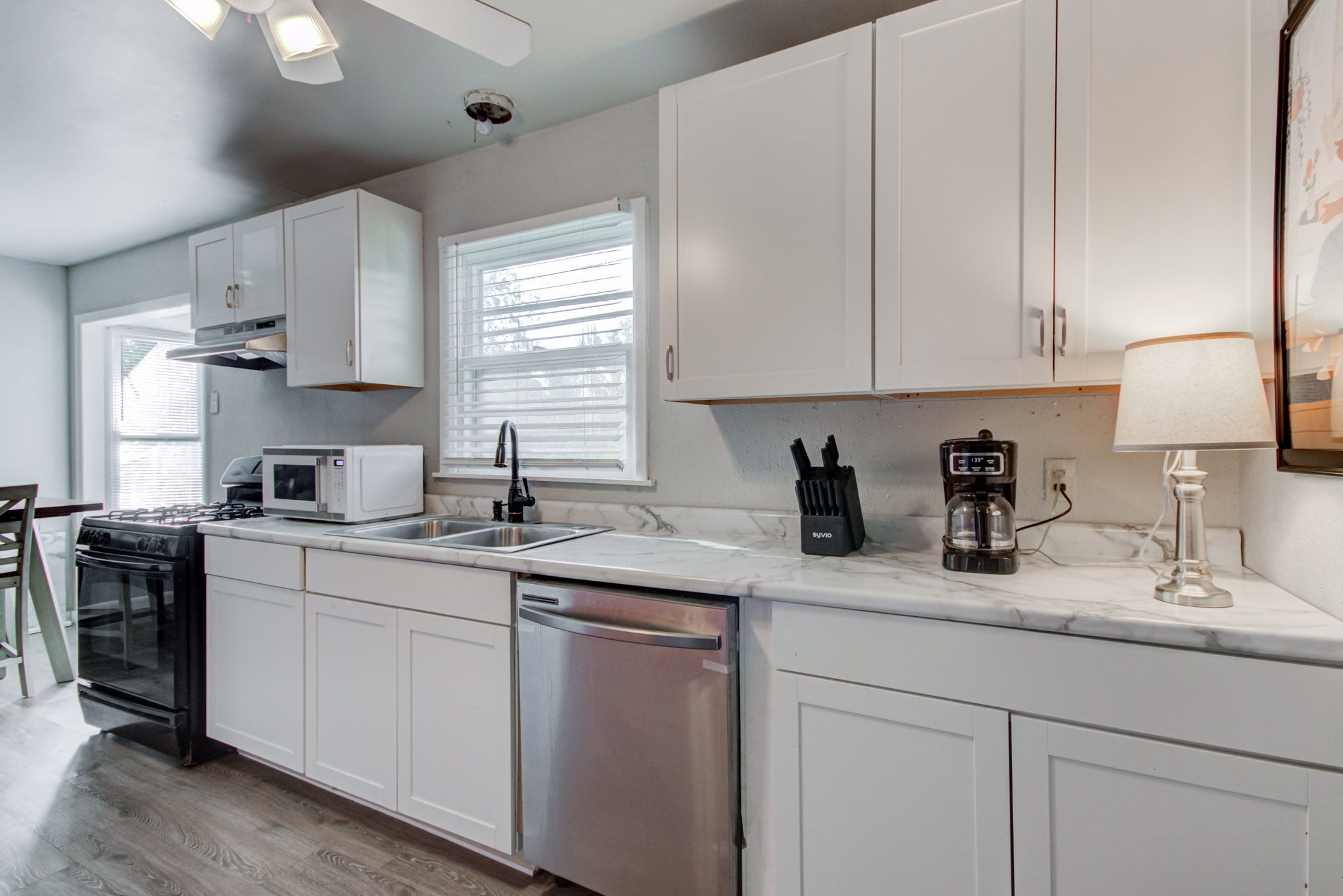 Welcome to this ready to move in, beautifully renovated and updated 5 bedroom home conveniently located just minutes from many amenities! You will enter into the large living room, then go through into the spacious eat-in kitchen. Further in, you will find 3 bedrooms and 1 full bath to the left of the kitchen and 2 additional bedrooms and 1 full bath to the right. All new kitchen and baths, new roof 2023, new paint and LVP flooring throughout 2022, newer HVAC (3 years), new light fixtures and blinds, and new ceiling fans in every bedroom. All appliances stay, including washer and dryer! Covered patio in the private, fenced in back yard. The storage shed was damaged by the recent fallen tree and conveys as-is. The garage was converted into 2 large bedrooms and additional full bath in 2022.