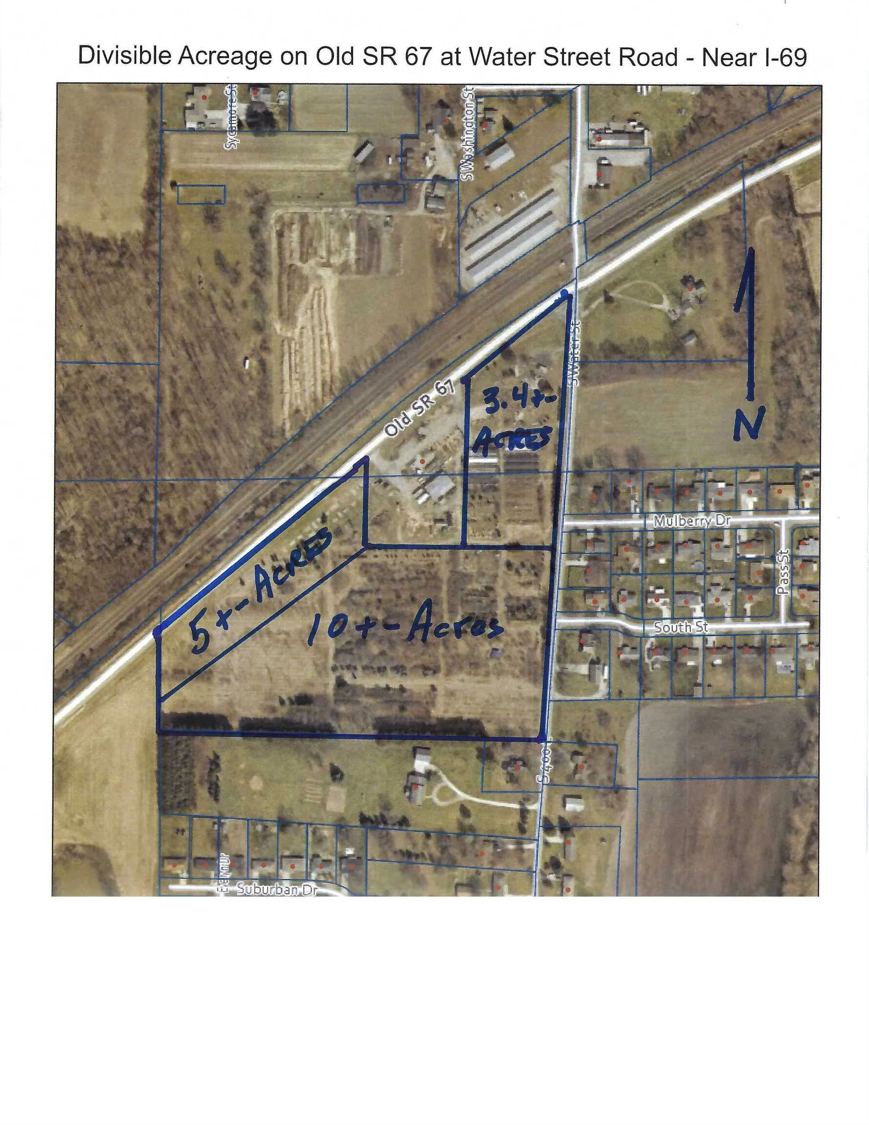 This Prime 18.4+- Acre DIVISIBLE Commercial Development Site is at the Southwest Corner of Old Sr 67 and Water Street (400E), just 1.5 Mile West of I-69 Exit 234. There is a prime 3.4+- acre CORNER parcel ($275,000), 5+- acres of divisible commercial frontage along Old SR 67 ($29,885 per acre) just west of Jazzi’s, and a 10+- Acre Parcel south of Jazzi’s that is Zoned Agricultural for $13,885 per acre. Utilities Are Nearby. Excellent Commercial or Possibly Residential Development Site. Seller reserves the Jazzi’s site and parking lot and they are not for sale. Exact lots sizes to be determined by survey that is currently under way.