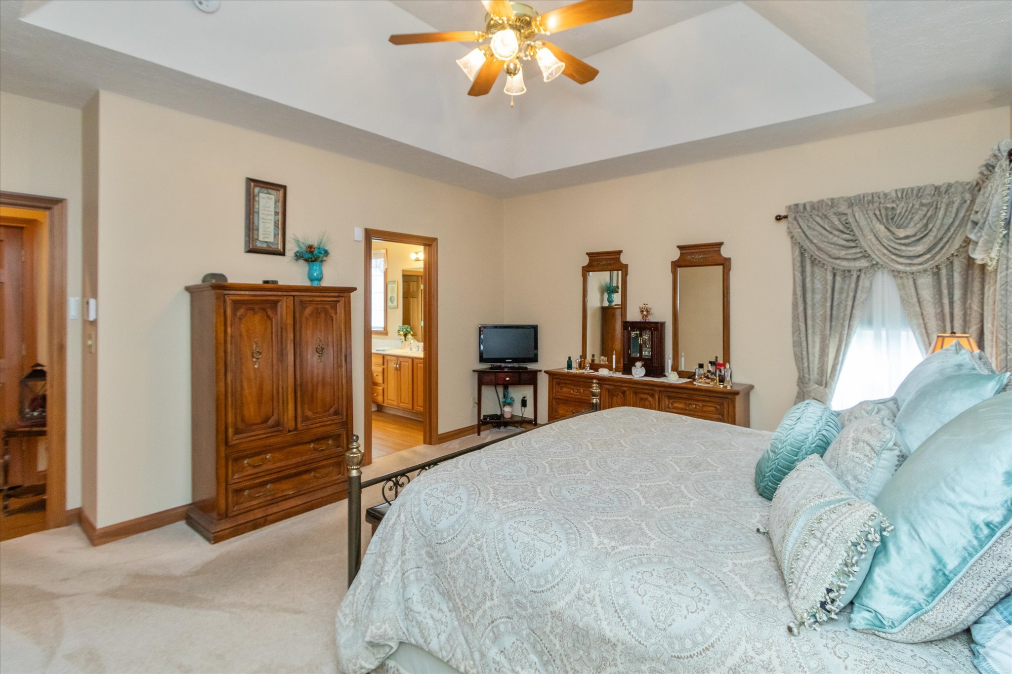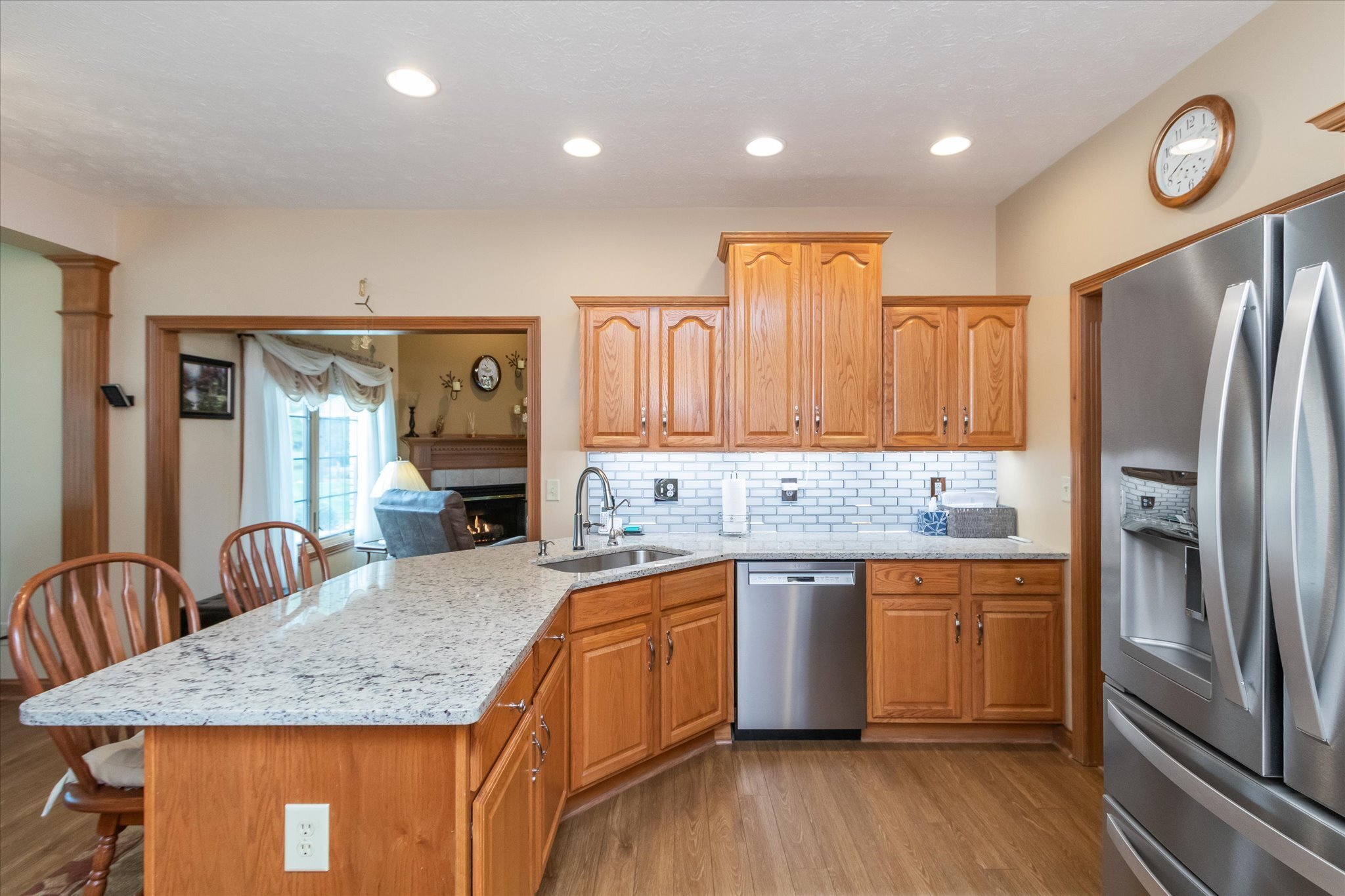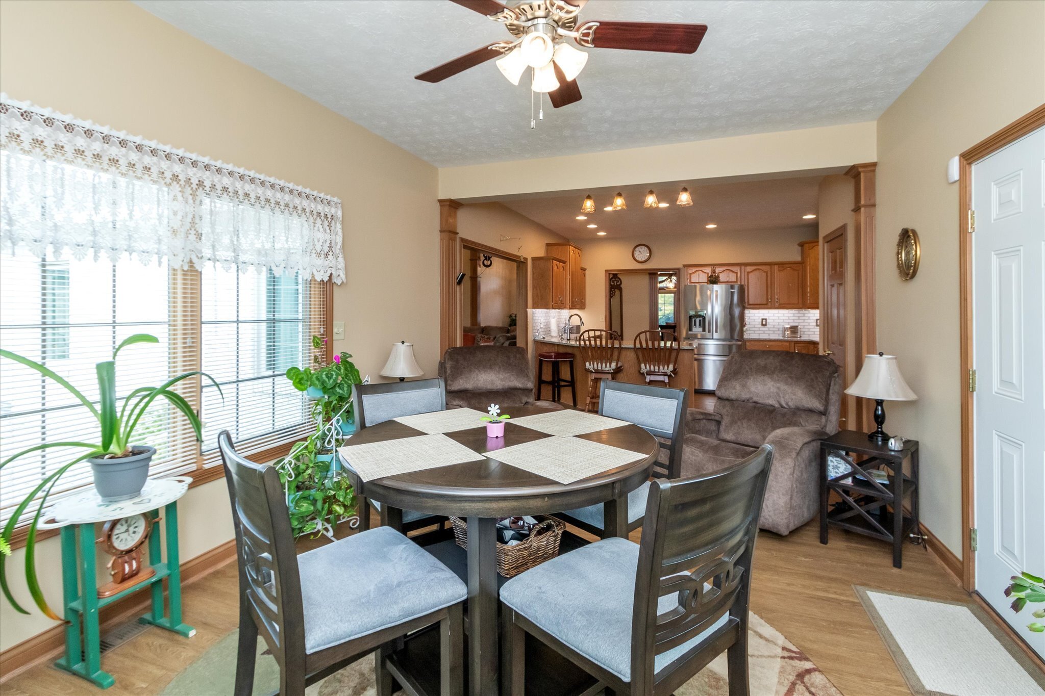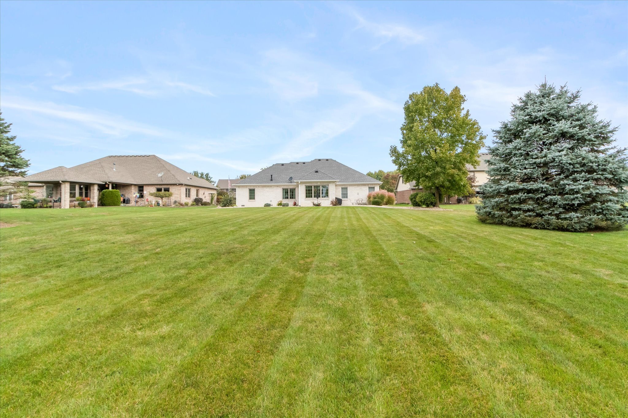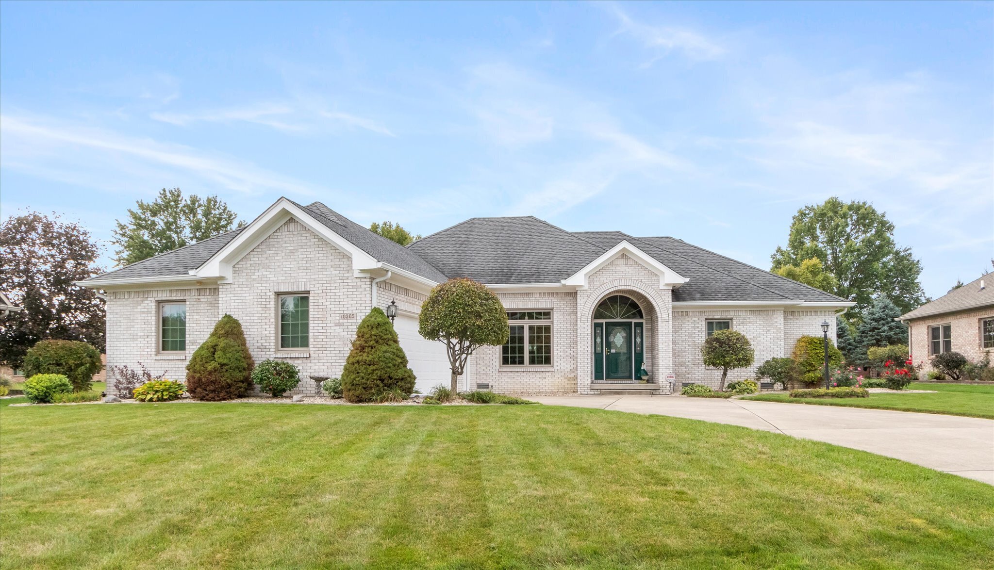 Exquisite all brick custom built ranch home on large lot in popular Whispering Pines addition. Pride of ownership truly shows in this beautiful well maintained home. Walk into the welcoming foyer with 11′ ceilings that continue into the dining room and great room, 9′ ceilings throughout the rest of the home. Gorgeous updated kitchen with lots of cabinets, granite countertops, tiled backsplash, and stainless steel appliances. Custom features such as tray ceilings and crown moldings, gas fireplace in great room. Relax in the sunroom off the kitchen or walk out to the patio that overlooks the wonderfully landscaped yard. Oversized two car finished garage. This home is a must see, too many updates to list.