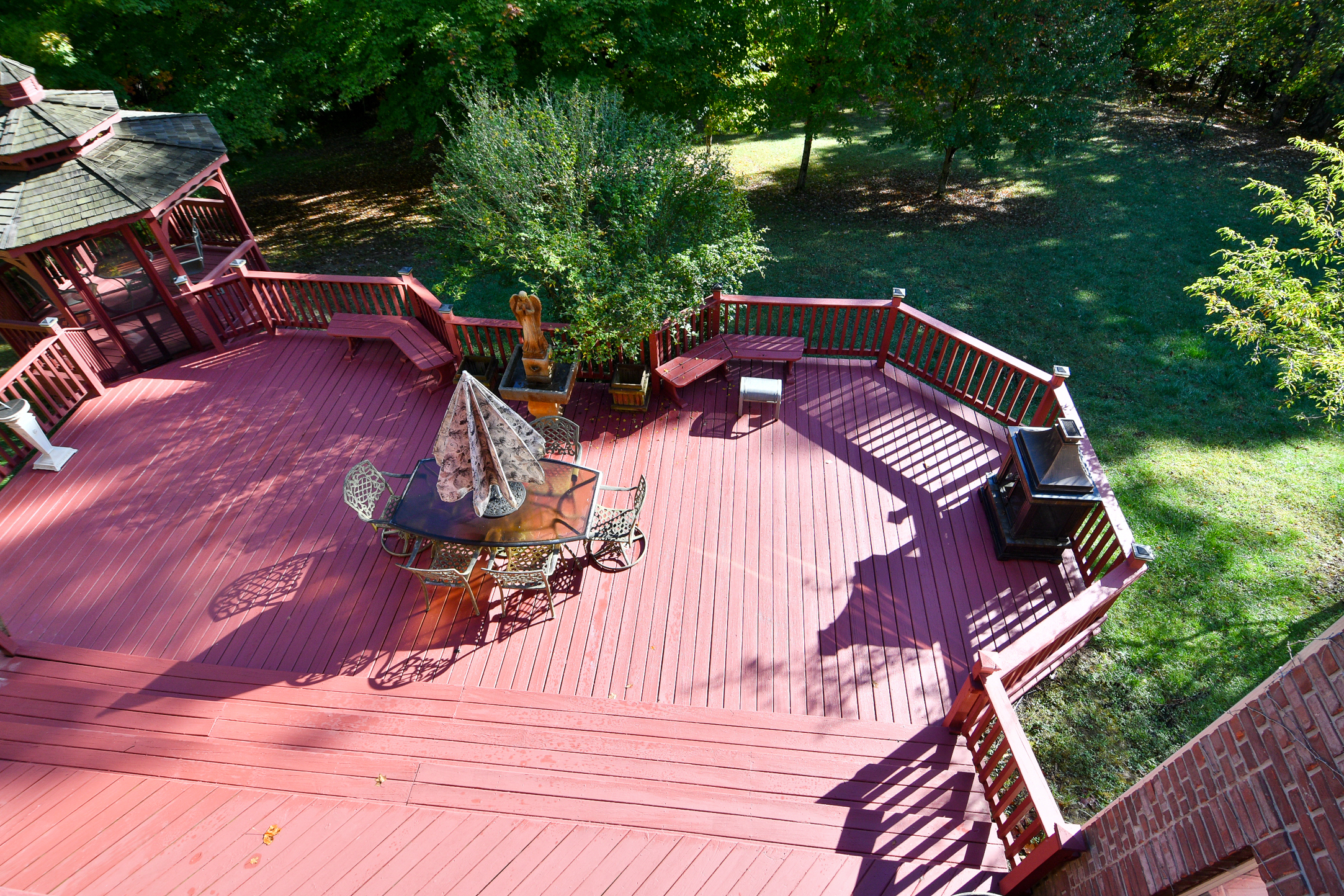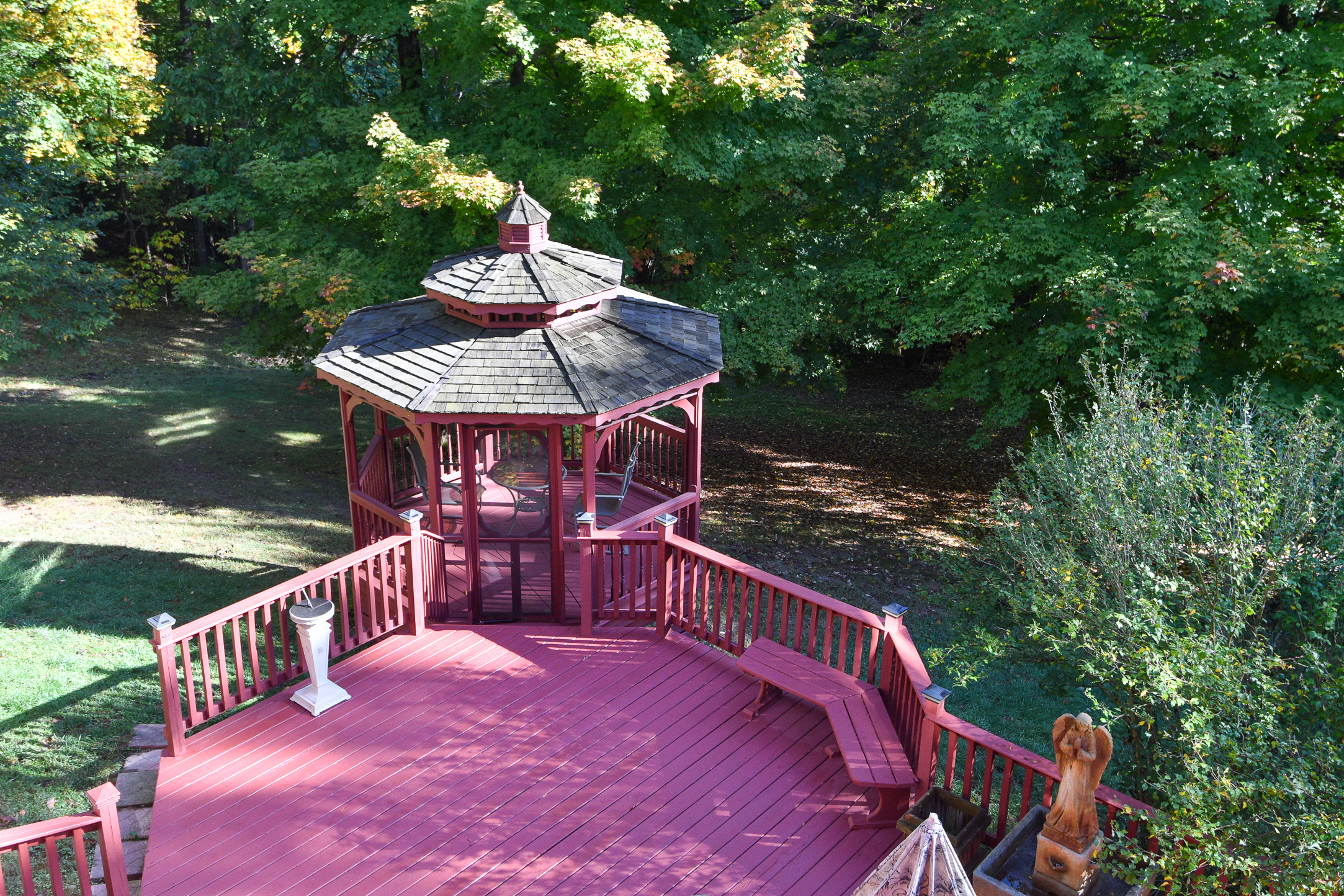 Picture perfect custom home w/w-o basement on 10+ wooded “Brown County like” acres. Featuring new roof, kitchen w/Granite counter tops, island, porcelain floor & custom backsplash, formal LR w/fireplace, formal DR, family rm, all w/hardwood floors, crown molding & ceiling fans. Primary BR features 2-sided fireplace, custom stain glass above Jacuzzi tub. 2 additional BRs share Jack & Jill bath; oversized pristine 3-car garage & additional 1-car detached gar; basement w/spacious 13′ ceilings, fireplace, 4th BR, office, exercise room, ample storage & room to add 2nd Kitchen/bar & media room. Balcony overlooks stunning view, 2 level deck and gazebo providing ample space for entertaining/relaxation & enjoying nature in this “must see” retreat!
