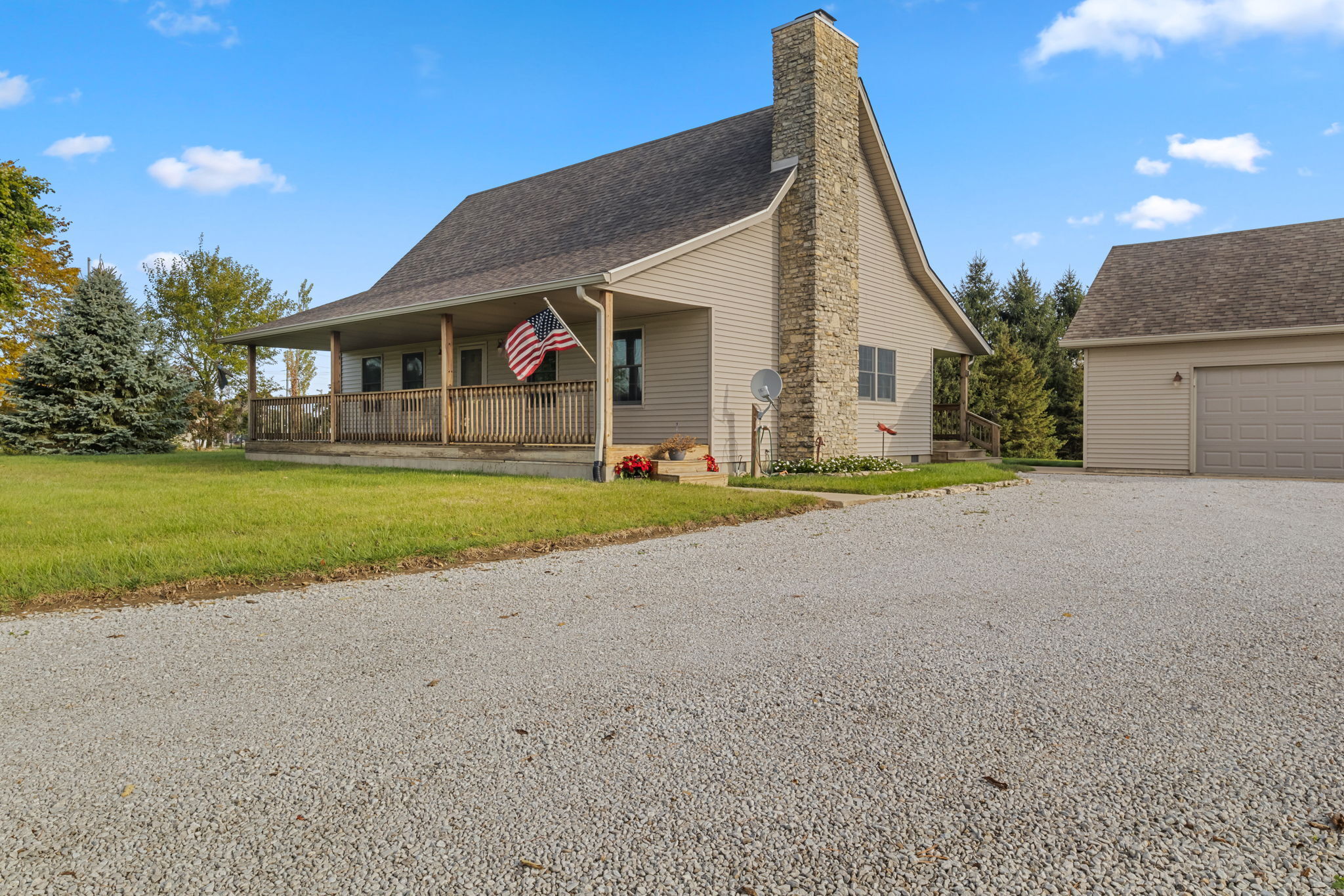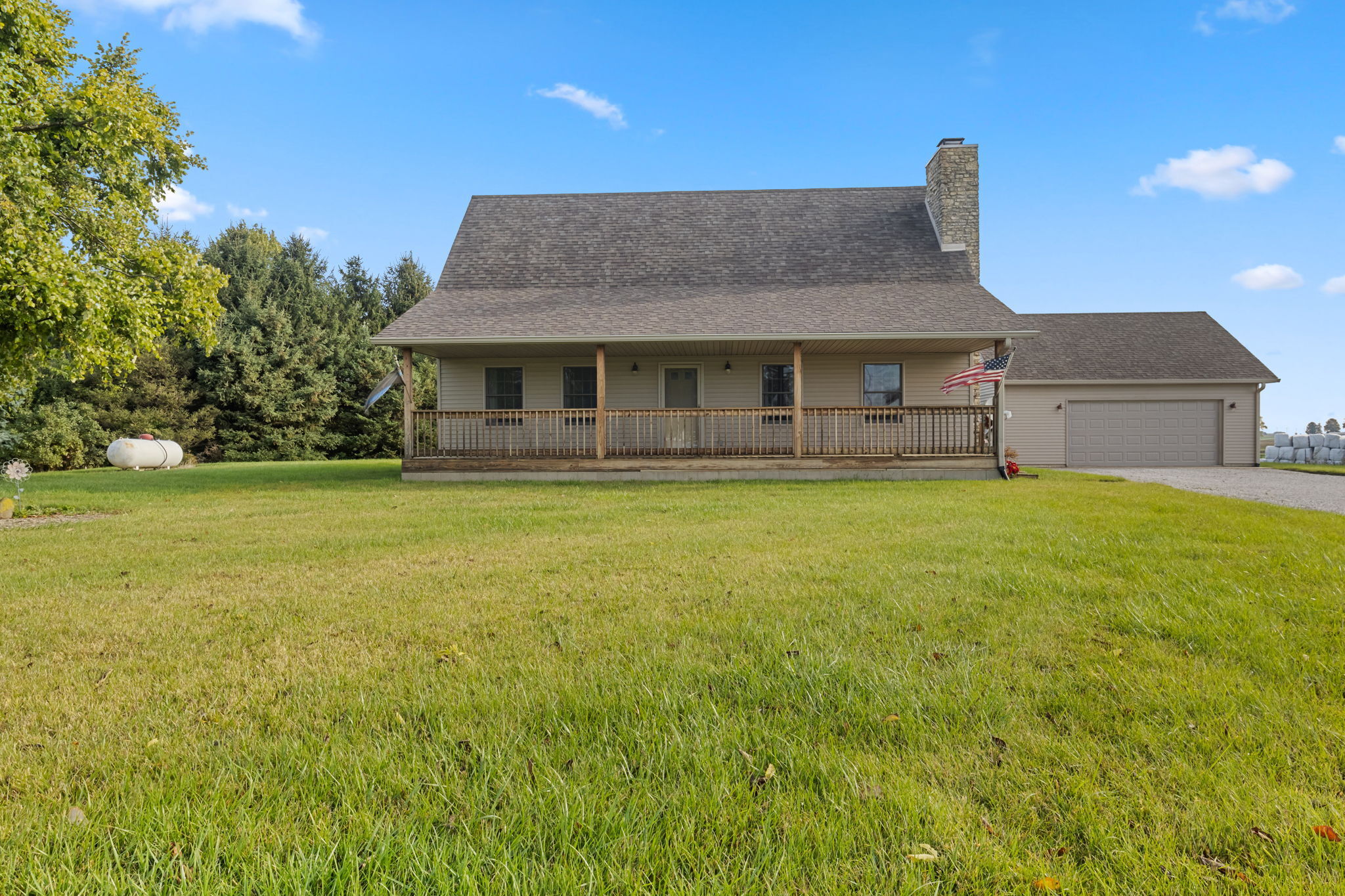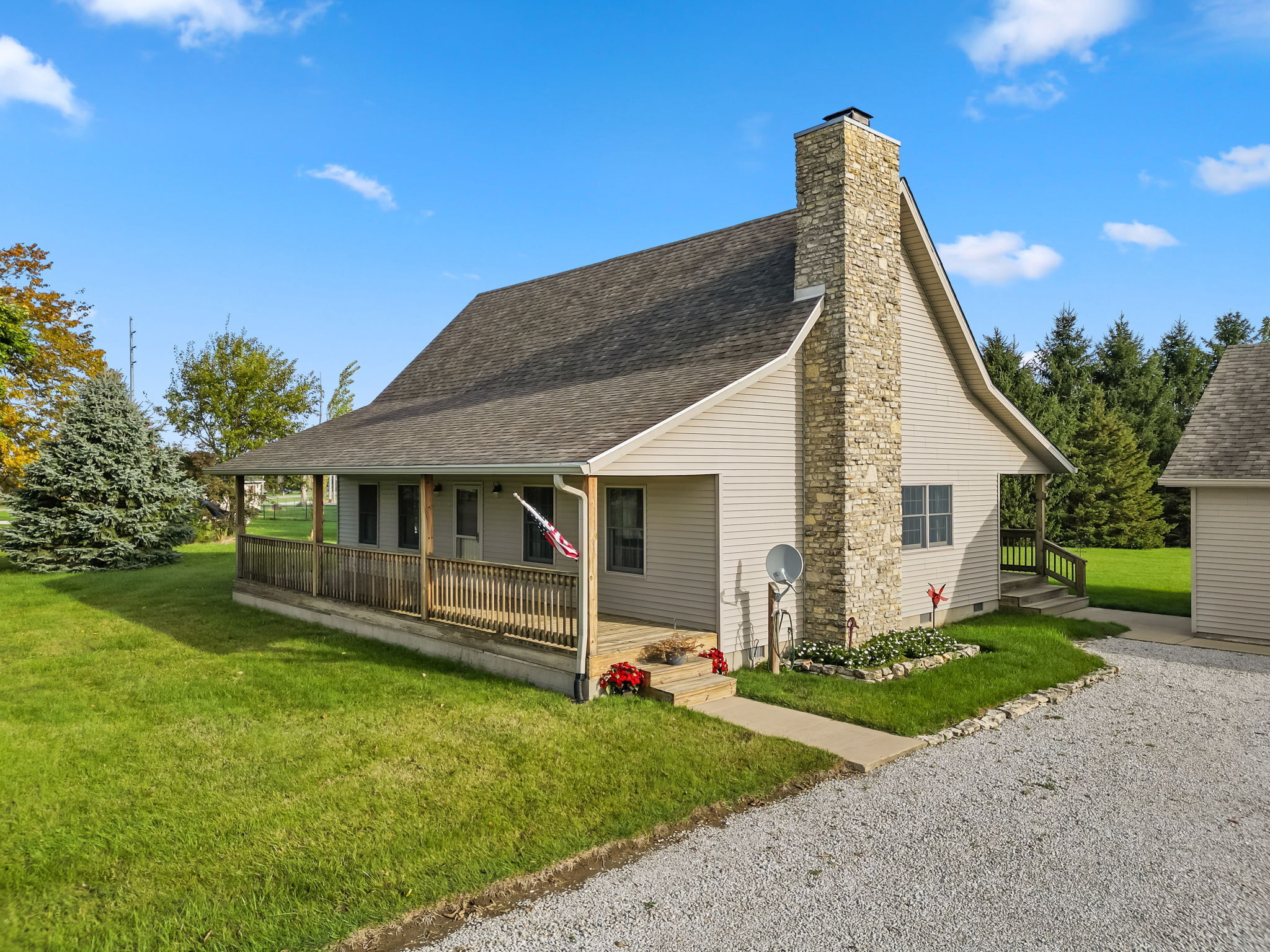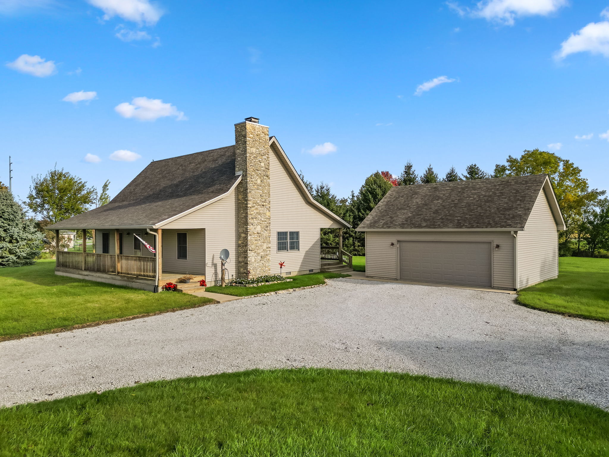 Beautiful Cabin Style Home with a floor to ceiling Stone Fireplace! Located in Southwestern Boone County across from Granville Wells Elementary and only 3 minutes north of I-74 Jamestown Exit northwest of Indy. Home has 6 inch walls providing excellent insulation. All new siding and roof in 2018! A wide stairway in the Great Room with beautiful hardwoods through the open kitchen leads to the loft which is the 2nd BR with its own private bath. The primary BR is on the main with a small walk-in. The bath is across the hall which serves as the downstairs bathroom. The 3rd smaller BR is currently an office. Utility room with owner owned water softener, water heater, furnace and washer and dryer are inside the back door. The home has a great covered front porch deck 8×40 and also the same sized deck at the rear of the home for great summer entertainment. The Detached 2 car 26×24 garage has electric and lots of room. The 40×30 Barn is a dream for the mechanic as well as tall vehicles with its big over 11′ wide x 13′ high commercial door. It features a furnace, air compressor, and 220 volt outlets and workshop area. The beautiful cared for yard with 2.23 acres makes this well cared property with amazing views a great country home and only minutes to nearby shopping in Brownsburg, Lebanon, or Crawfordsville. as well as 20 minutes from west Indy, via I-74 or I-65