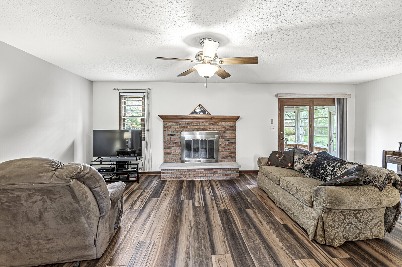 Are you looking for an all Brick Ranch with no HOA in an Intimate quiet neighborhood? You found us! Located on a corner lot and walking distance to the community center across the street; this home has been well maintained. Features:reverse osmosis, water softener. Roof is only 8 years old, windows are under 5 years old, water heater 2020. The backyard has a deck off the sunroom and is completely fenced. Cozy up by the fire in the Great Room or enjoy dining/relaxing in the Sun room. Room sizes are estimated. Please note that the seller indicates backyard has an additional 8-10 feet beyond the back fence.