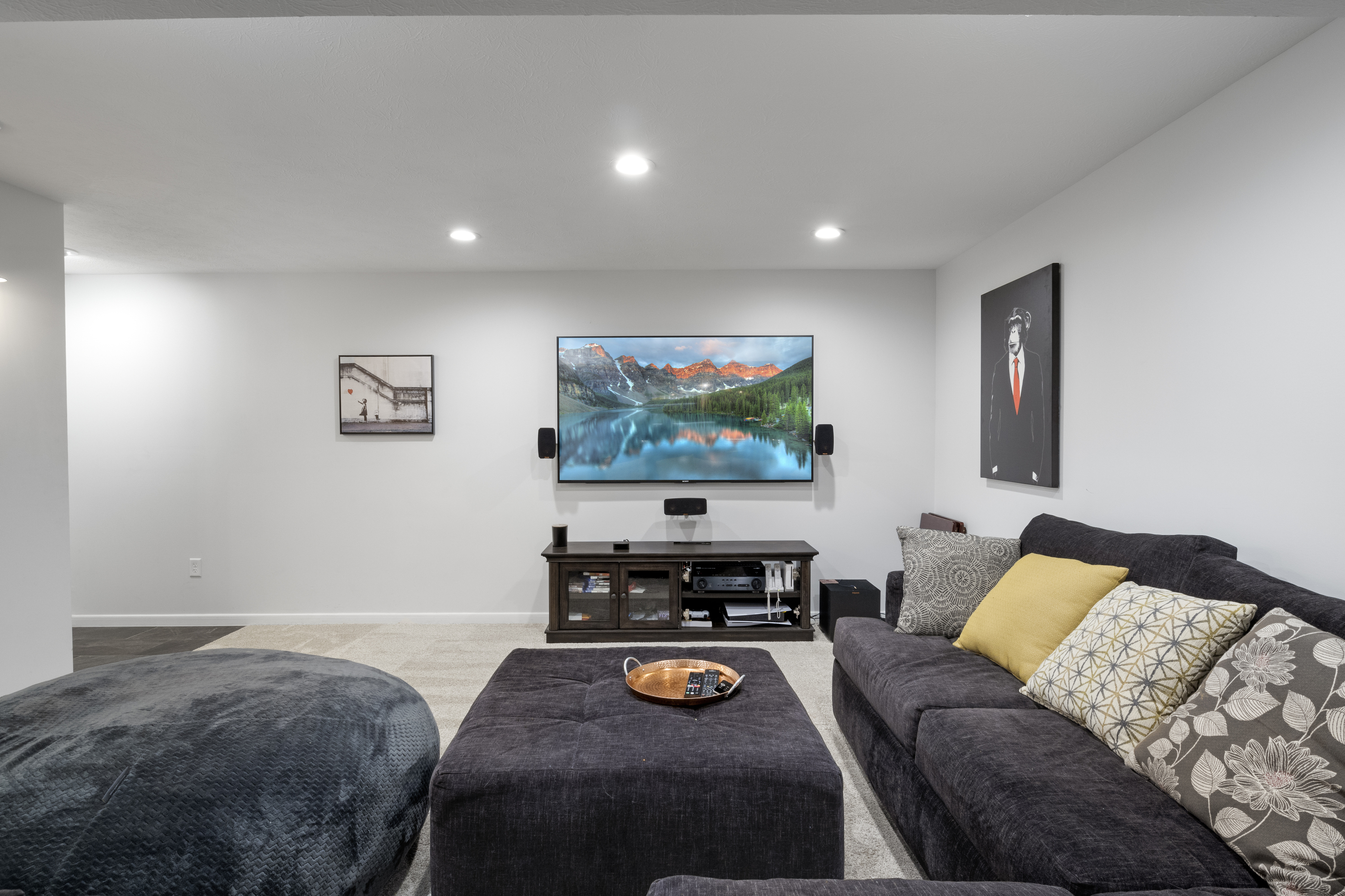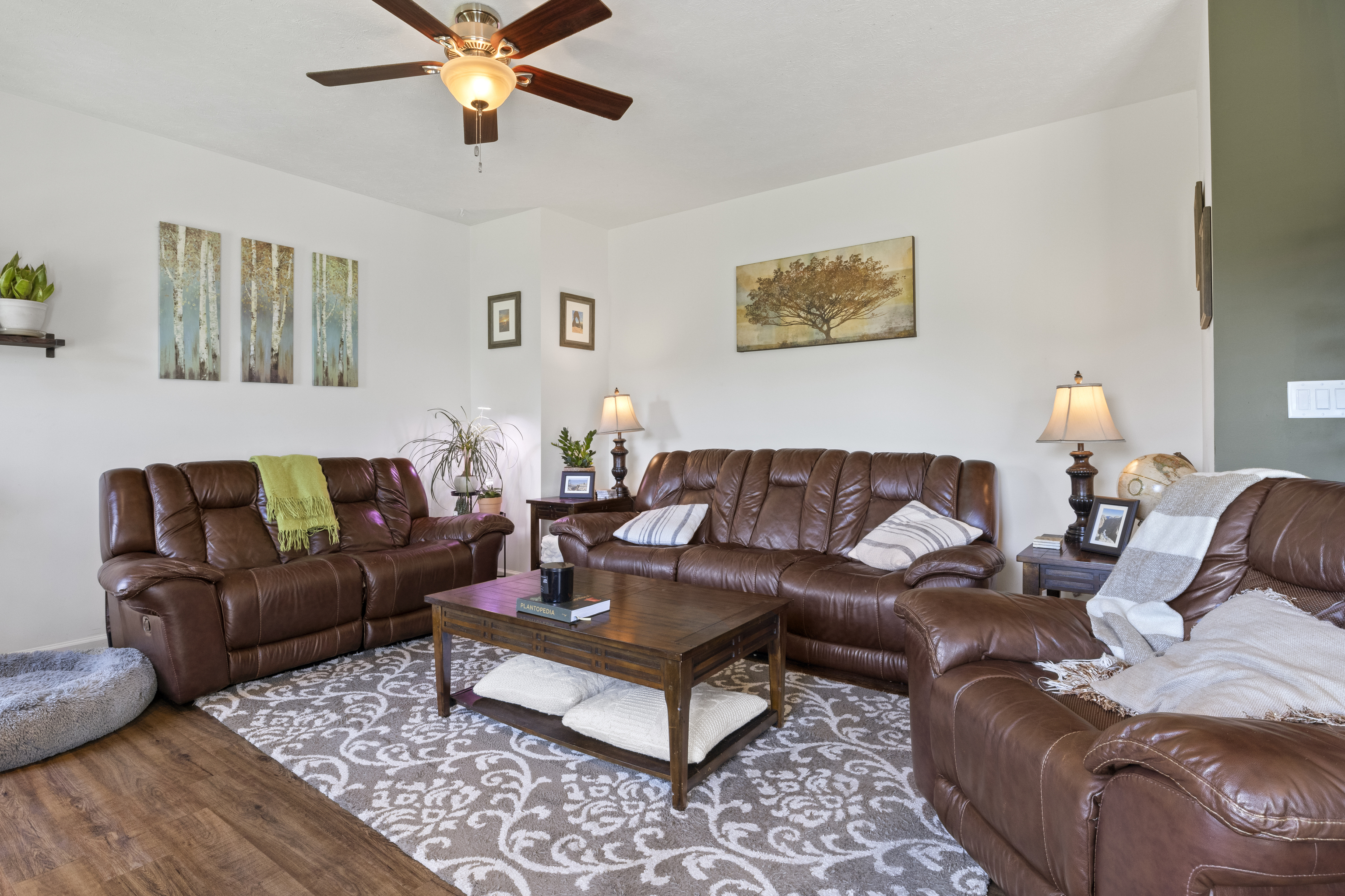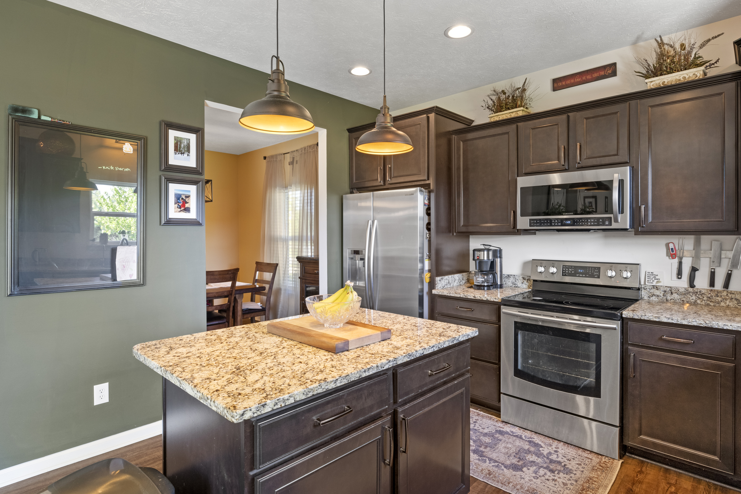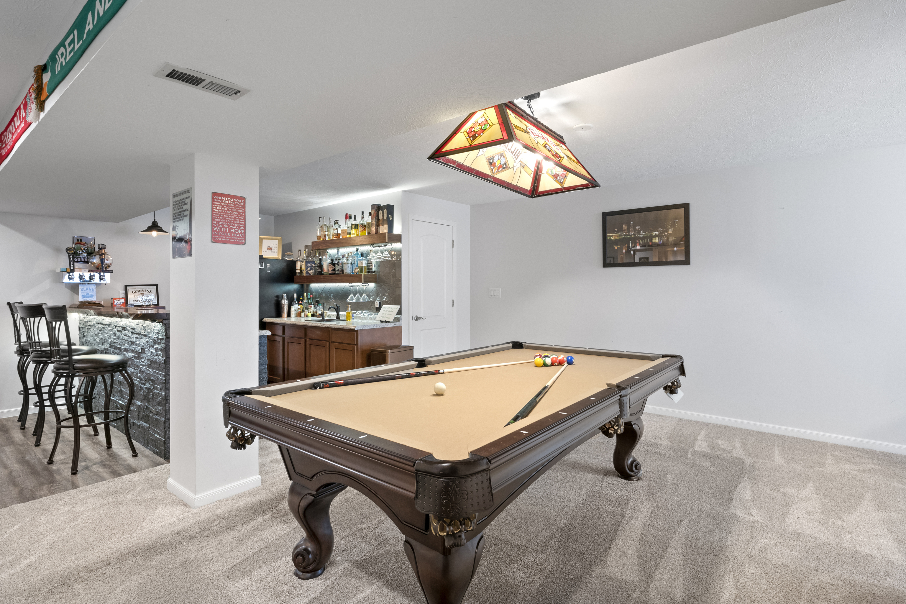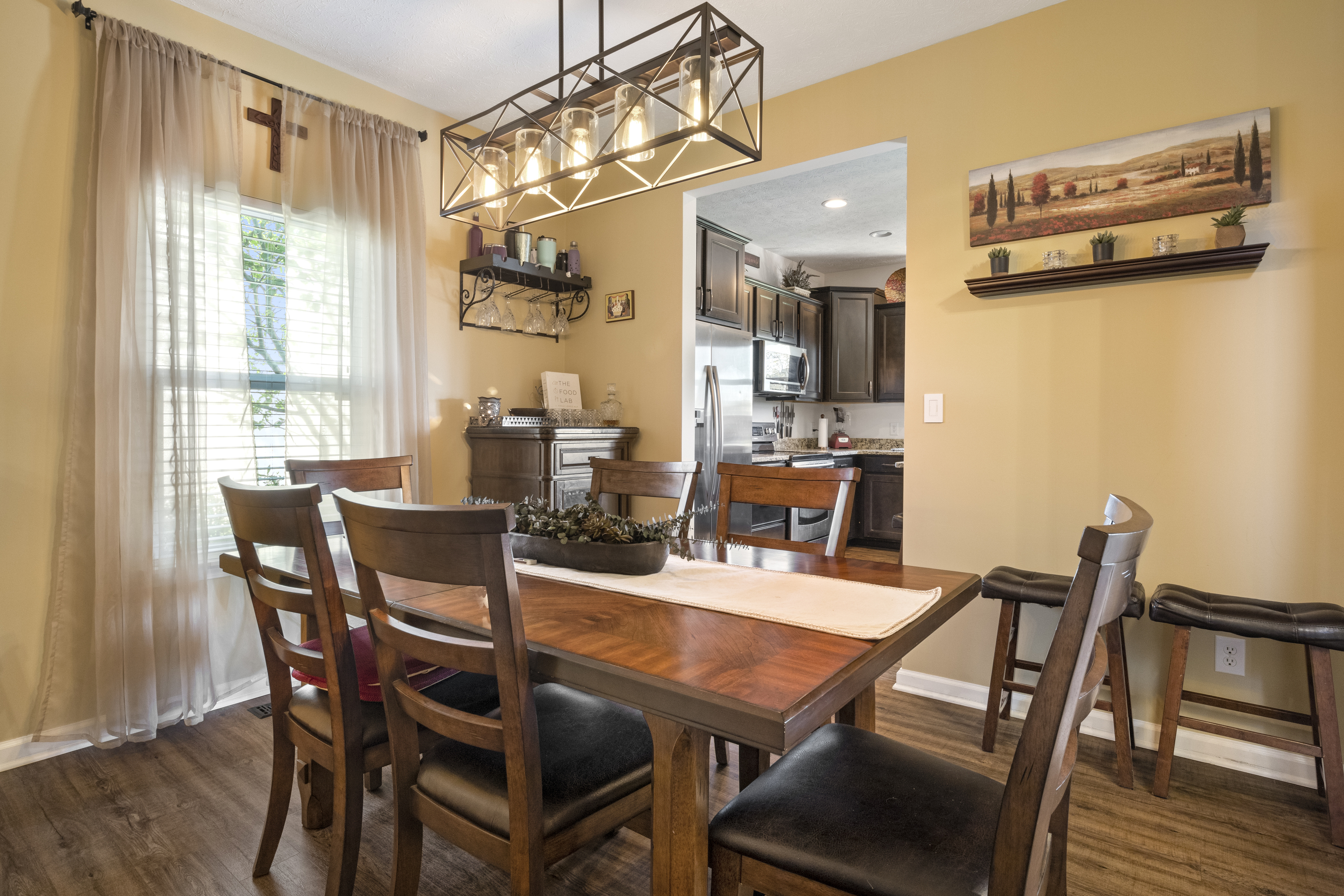 Welcome to this stunning 4 bedroom, 3.5 bath home with large 3 car garage in desirable Glen Ridge Estates! A 2-story grand entry opens into 9 ft high ceilings throughout. Luxury vinyl plank flooring seamlessly guides you past the main level office and into the spacious open floor plan. A gas fireplace warms the bright and open family room. A designer kitchen boasts sleek stainless steel appliances, granite countertops, and large island. Contemporary light fixtures upgraded throughout. The finished basement with a custom wet bar, theatre room, and full bathroom provides a cozy retreat for gatherings. The primary bedroom features vaulted ceiling, a walk-in closet, and large garden tub with separate shower and dual sinks. Custom upstairs laundry room offers convenience. Step outside to the lush backyard with a firepit and large concrete patio, creating an inviting outdoor oasis. Exterior landscape lighting illuminates extensive mature landscaping in the front and back yard. An invisible dog fence ensures peace of mind. New roof in 2023. Impeccably clean and warmly welcoming, this move-in ready home offers the perfect blend of style and comfort in a sought-after neighborhood walking distance to highly rated Franklin Township schools.
