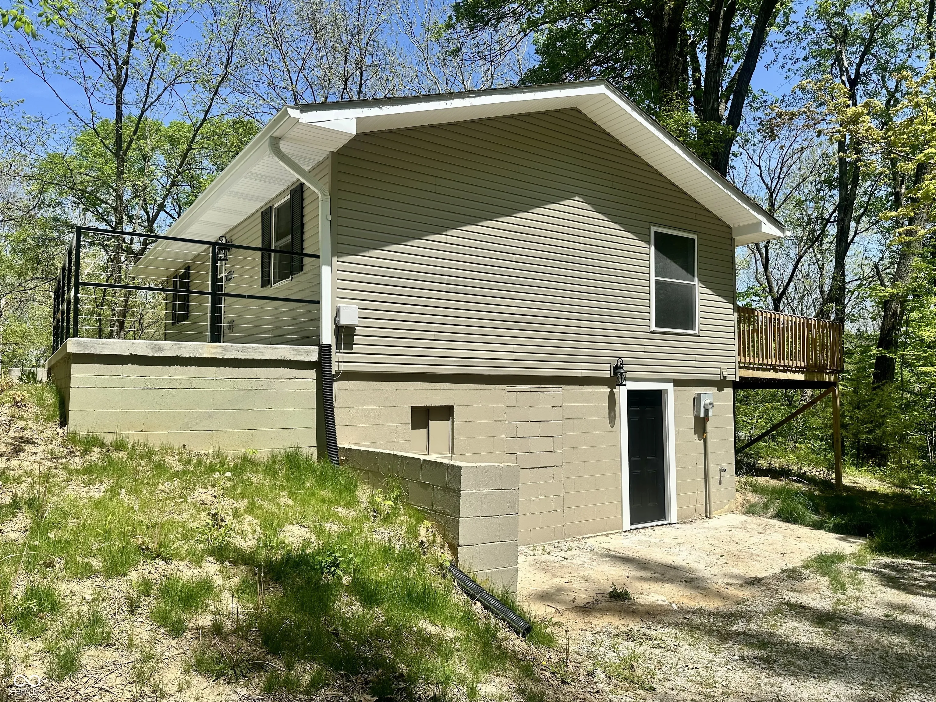 This beautifully remodeled home is nestled in a peaceful wooded setting across from Lake Waveland, offering tranquil surroundings. The main level of the home is bright and airy with an open concept kitchen/dining or kitchen/living space. The kitchen boasts white cabinetry, a center island where the sink looks out into the room, brand new appliances, and sleek countertops. The main floor also feature a master suite w/a giant walk in closet, bath w/walk in shower, and doors that lead out to a deck that spans the entire back of the home. Downstairs, the full walk out basement provides additional living space, two more bedrooms, and a laundry closet. Don’t miss your chance to own this charming retreat with recreation and golfing nearby. A few of the updgrades include a new septic, wiring, drywall, windows, roof, siding, water heater, deck, plumbing, cabinetry. kitchen, and baths!