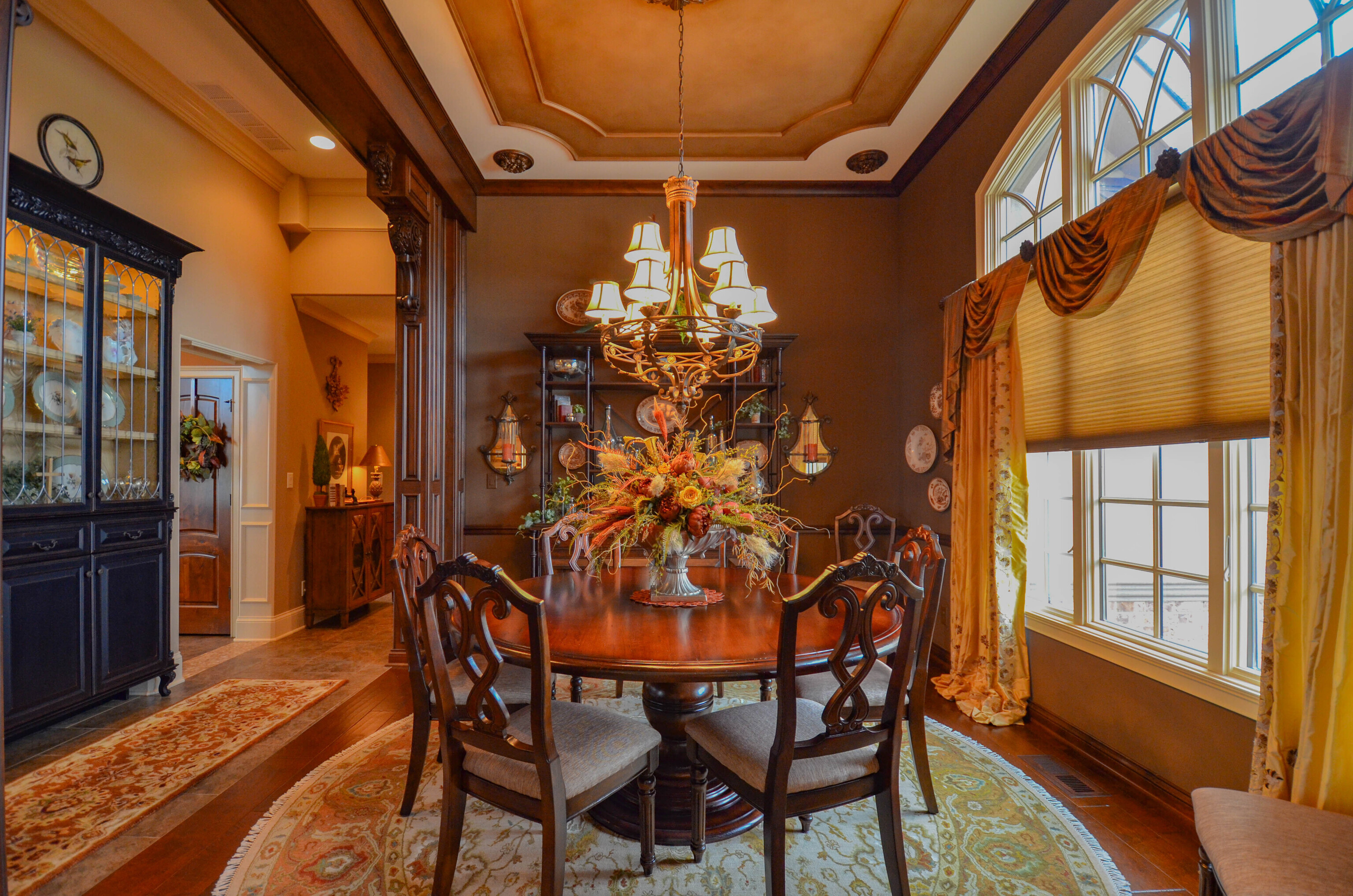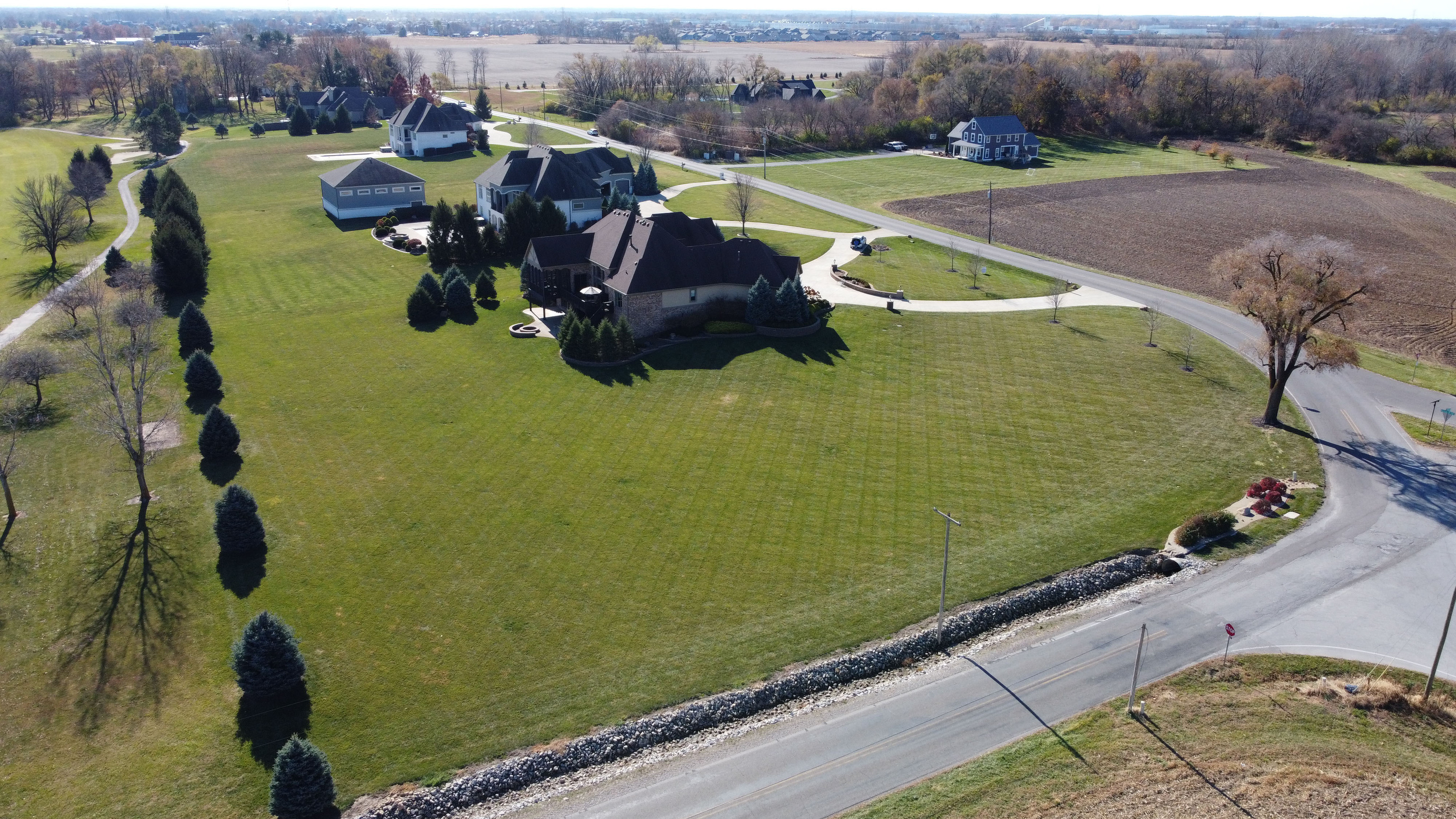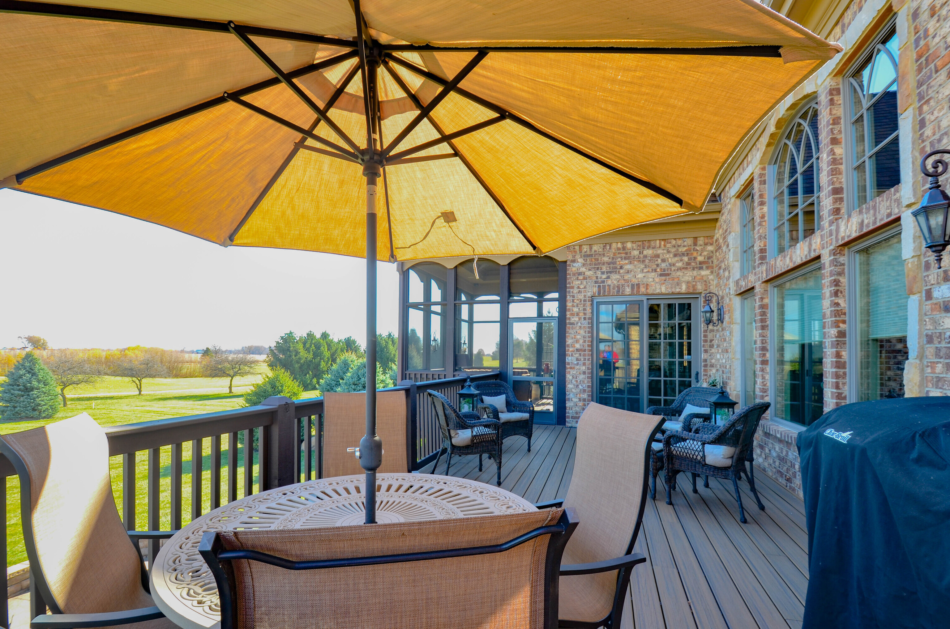 The moment you step foot into this home, you feel the warm & inviting atmosphere. It has an elegance about it, but not in a formal setting. Open floorplan, but also cozy & intimate areas. Knotty alder cabinets & doors make it unique. Molding finishes are extra special. Great for entertaining w/a large kitchen & great room that open up to screened porch & deck. Spectacular views looking onto a golf course setting w/farm land surrounding it. Main level includes large master bedroom, large walk-in shower & oversized walk-in closet w/lots of cabinets. The additional 2 bedrooms share a jack and jill bath. Formal DR, den & large laundry rm. The daylight basement is entirely finished w/a suite for family or guests. Large bar area w/built in ice maker, dishwasher and beverage refrigerator are the focal points. Lots of activity room, including pool table, tv viewing & card playing. There is a 40×16 bonus/safe room and lots of storage throughout the home. Two 2 car garages. Landscape is mature and has seasonal colors surrounding the home with firepit and lower patio area.