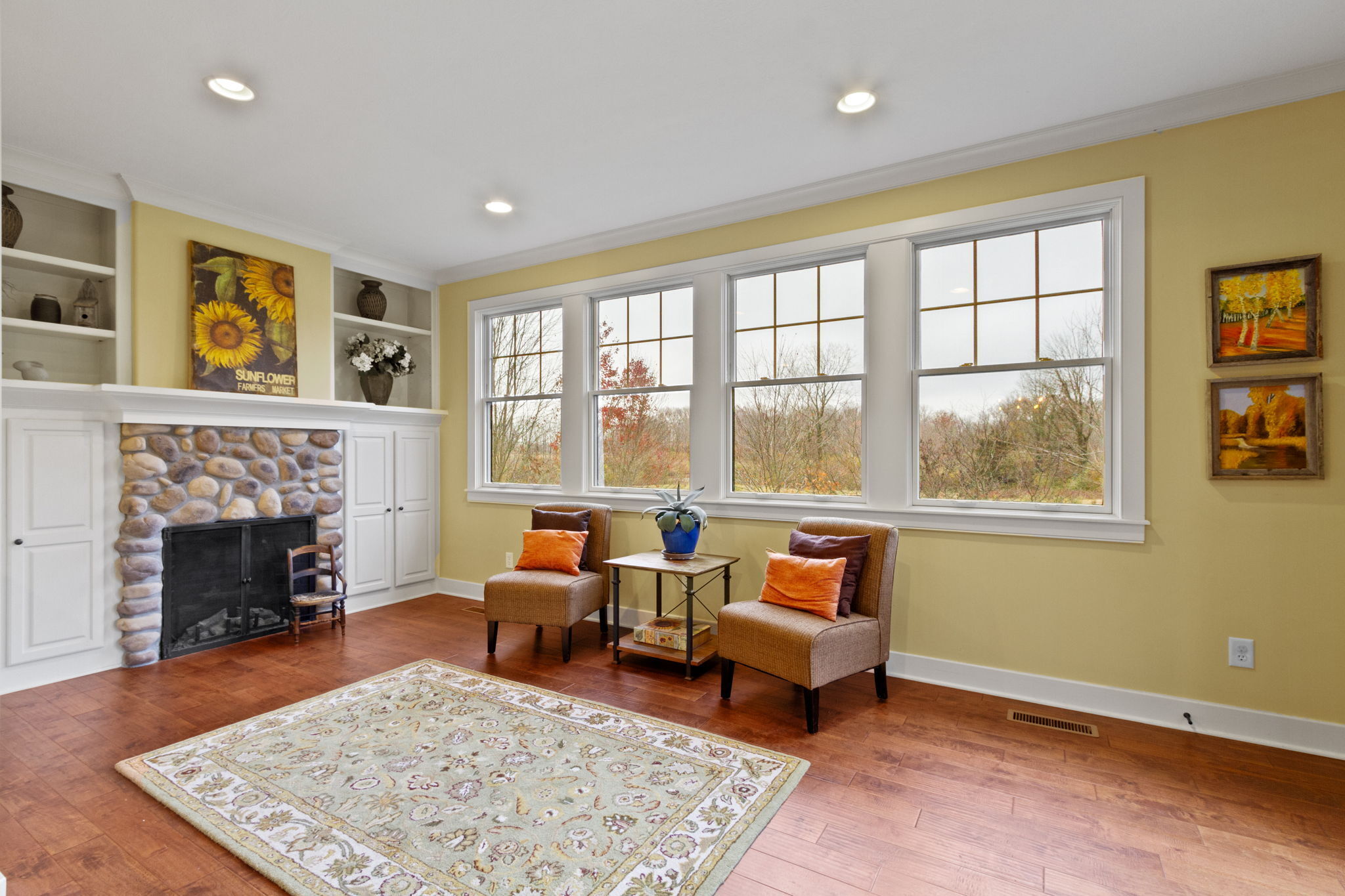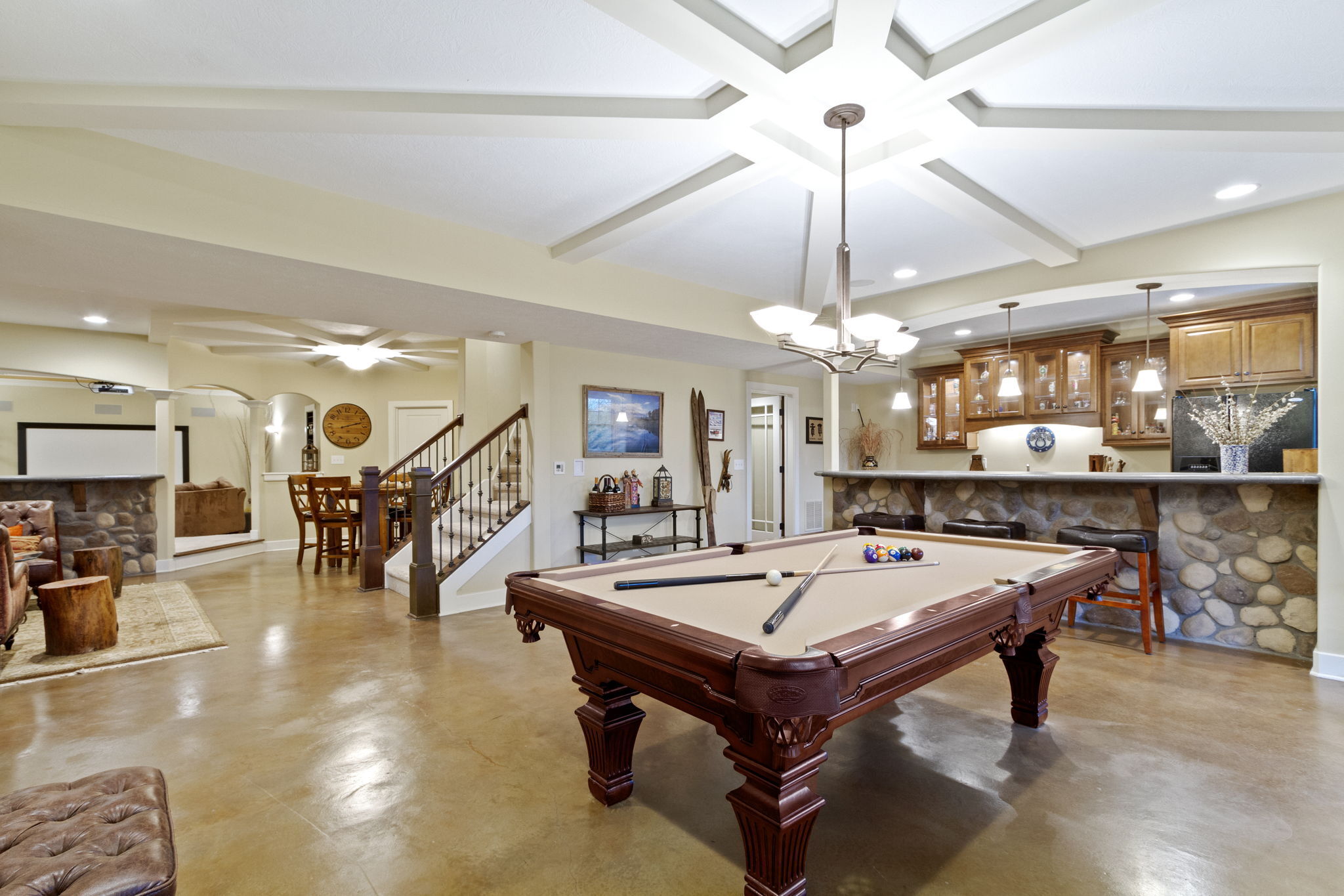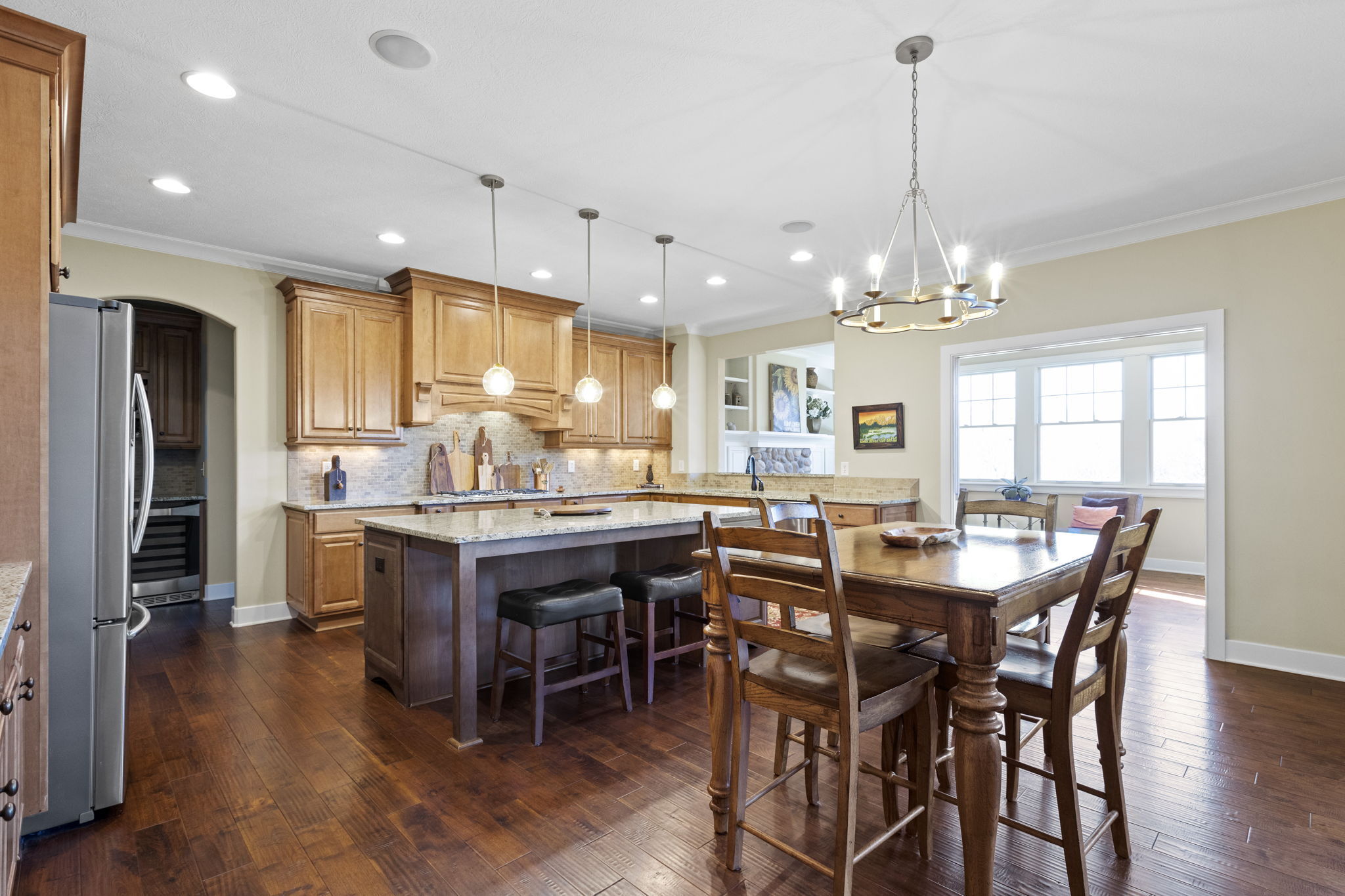 Custom home by G&G Custom Homes. Discover luxury in west Carmel on a private lot. This stunning residence offers the perfect blend of elegance, comfort, and unparalleled craftsmanship. The focal point of the living area is the floor-to-ceiling stone fireplace, complemented by a spacious kitchen with a gas range and walk-in pantry. Relax by another fireplace in the sunroom. The upper level boasts a library that provides a cozy and peaceful space for relaxation and four large bedrooms with a “secret room” for play or storage. The lower level is an entertainer’s dream, featuring a theater room, wet bar, wine cellar, and a bedroom suite. Outside, multiple entertainment areas and a firepit await. Custom touches abound, from elegant stonework to Pella windows and coffered ceilings. Wake up to breathtaking sunrises in this exceptional home.