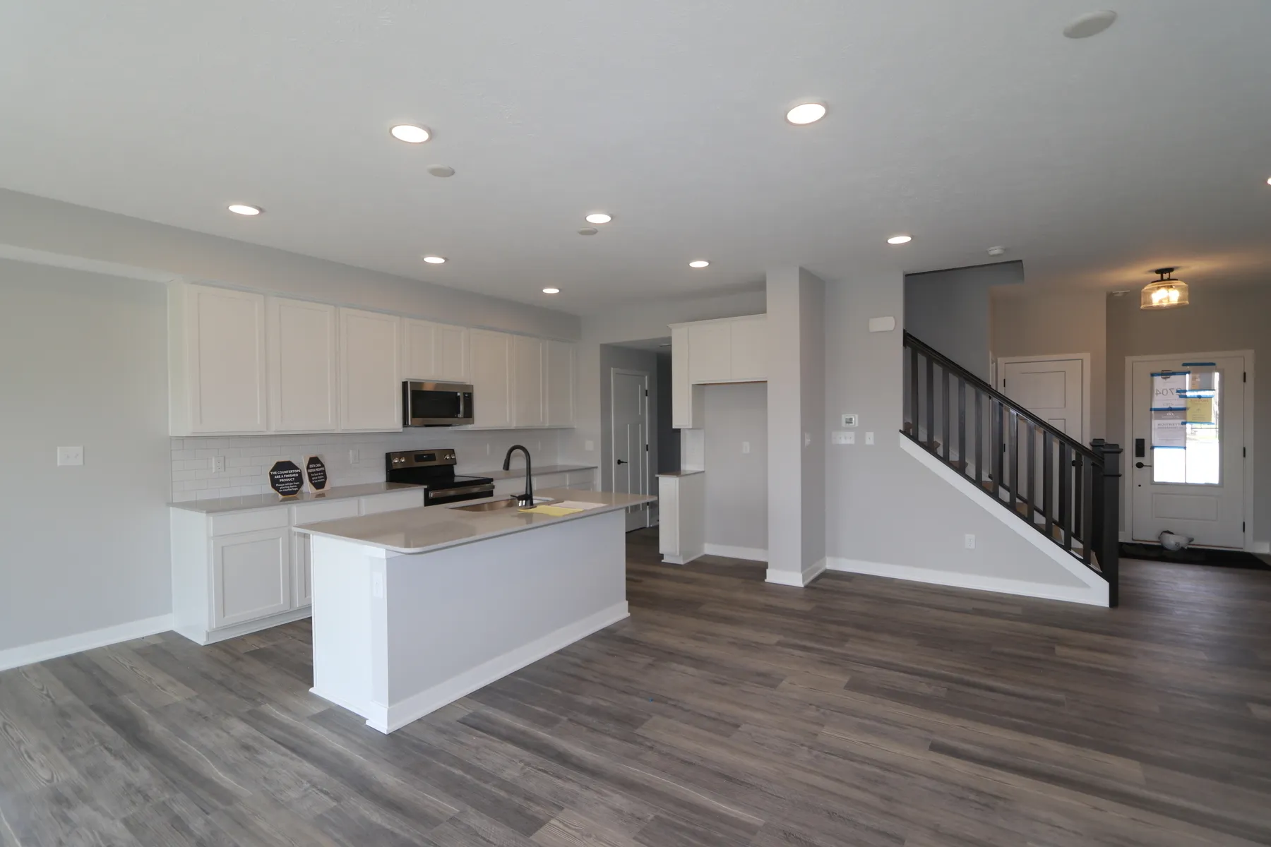 This 2-story, 1,560-square-foot townhome comes with 2 bedrooms, 2.5 bathrooms, brilliant natural lighting, an open-concept kitchen, and beautiful finishes throughout! The white vinyl siding with sleek black accents matches the modern layout you’ll love inside! Find a half bathroom and a coat closet just off the foyer, and pass the steps to the second floor as you make your way into the wide-open gathering room and kitchen. With 13’2″ x 21’9″ of space and an electric fireplace, there are so many ways to transform the gathering room in this townhome to fit your personal design style! You could go with a neutral boho theme or opt for a modern farmhouse look. The kitchen island overlooks the family room, so you can still watch a show on the TV after work while getting dinner ready. You’ll have more than enough room to prepare each dish in this well-equipped, on-trend kitchen! Set up a dining table in the breakfast area nearby, where you’ll also find the sliding glass doors to your back patio. Head upstairs to find the laundry closet at the top with a full bathroom across from it. The owner’s bedroom, bathroom, and walk-in closet are just around the corner. The bedroom next door makes the ideal space for a bright home office or spacious guest room. There’s even an attached 2-car garage, so you’ll have plenty of room for your vehicles. With an under-the-stairs storage closet and other storage solutions throughout, there’s tons of space for your seasonal decorations and other keepsakes.
