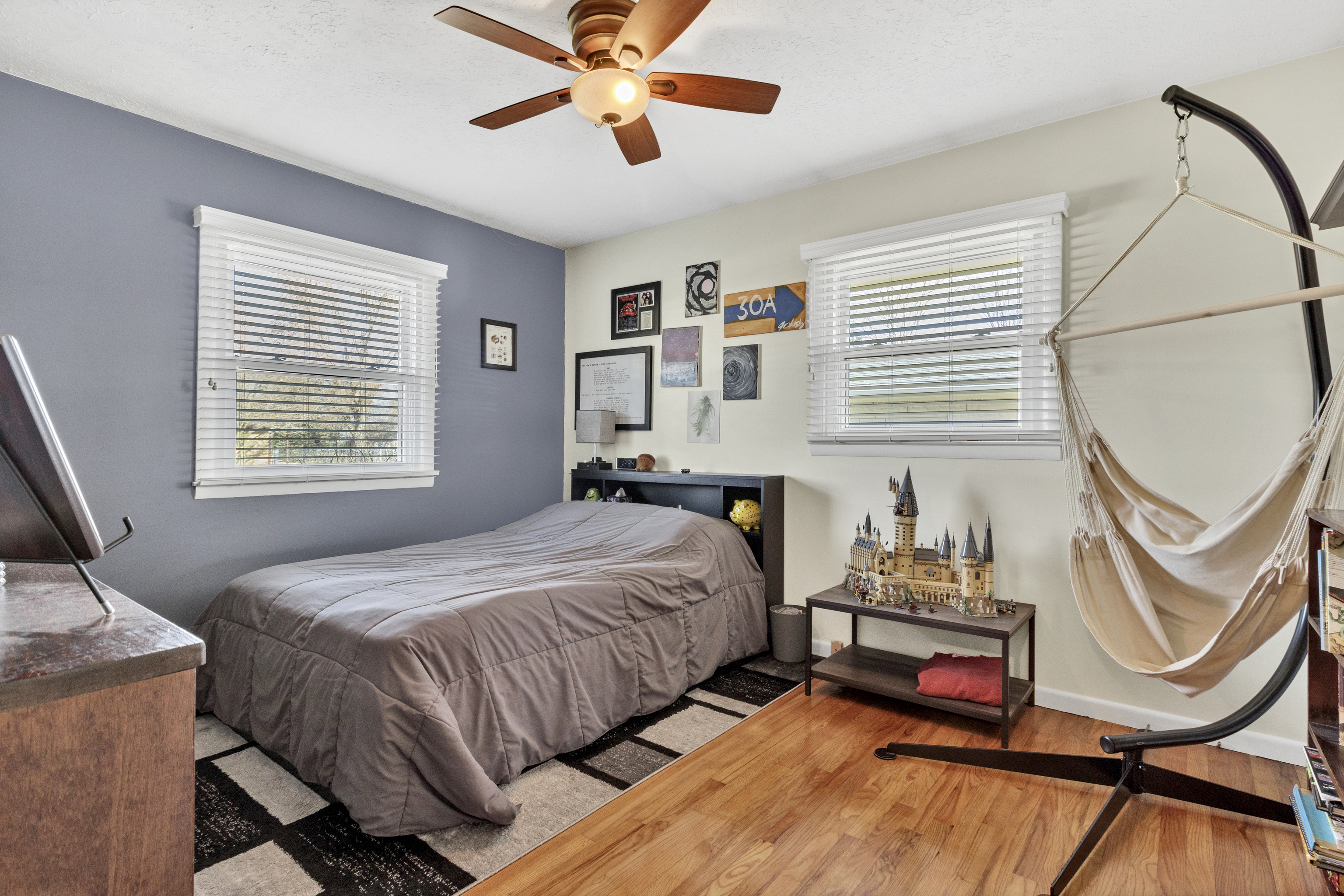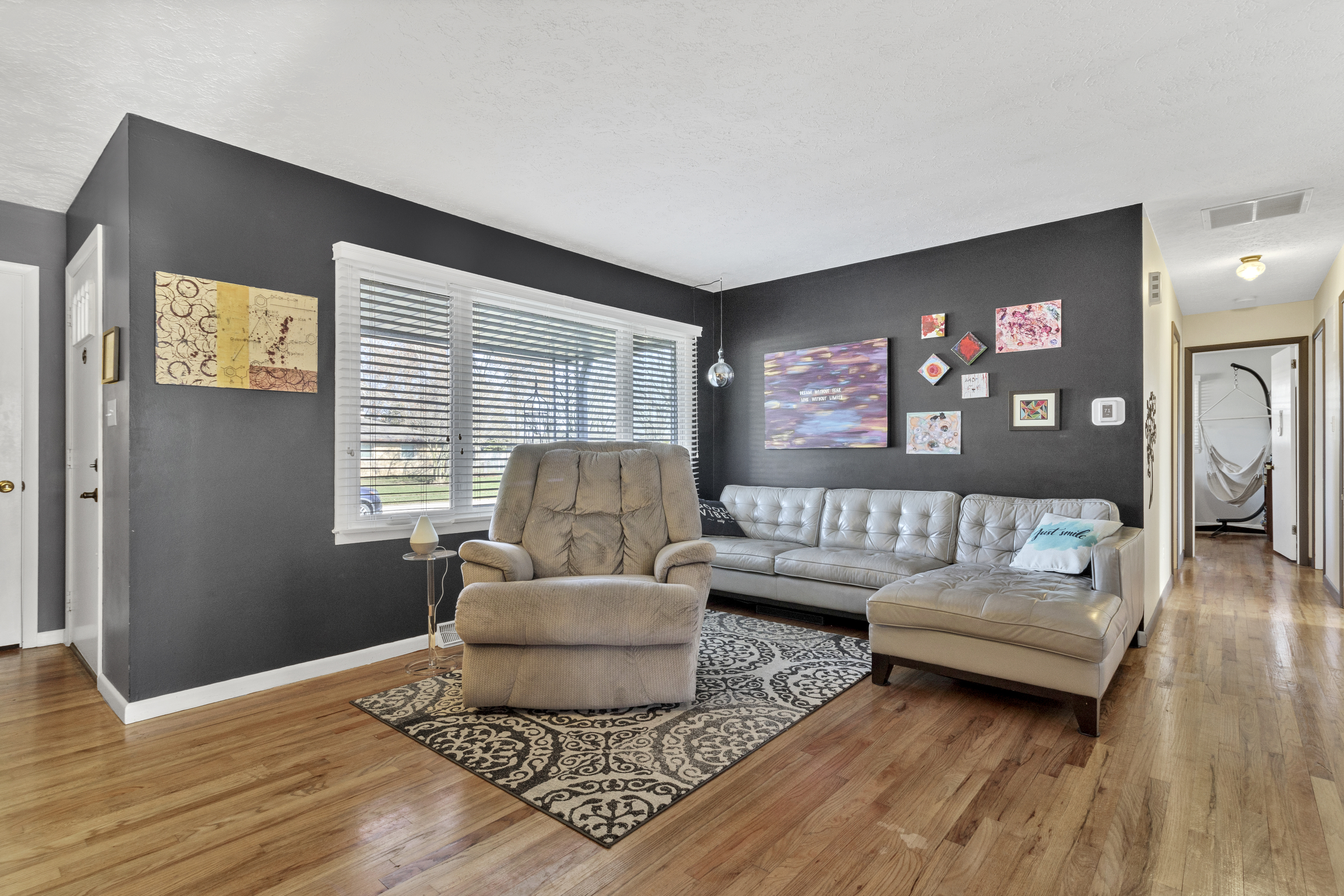 This lovingly maintained 3-bedroom, 1.5 bath ranch (with original hardwood floors) offers a fantastic location and important updates. Nestled into the classic Brownsburg neighborhood of Hornaday Heights and within walking distance of the nearest coffee shop, this cozy home awaits its next owner. UPDATES include ROOF (2017), HVAC (2022), WINDOWS (2018), WATER HEATER (2021), CUSTOM BLINDS (2016), GUTTERS, (2018/2019), and MORE… ask your agent for our updates sheet! The full bath was updated in 2021 with beautiful black and white ceramic tile, a wide vanity, toilet, light fixture, and subway tile. The main bath also offers a bathtub with shower *and* a separate shower stall. Each bedroom closet has been outfitted with a California Closets organization shelf system – as well as the pantry (look for it in the laundry room). Enjoy the spacious backyard with maintained mature trees, a storage shed, and an open patio area, or sip your morning coffee on the covered front porch. Enjoy NO HOA FEE in this established, well-cared-for neighborhood. Come take a look at 1039 E. Logan Street!