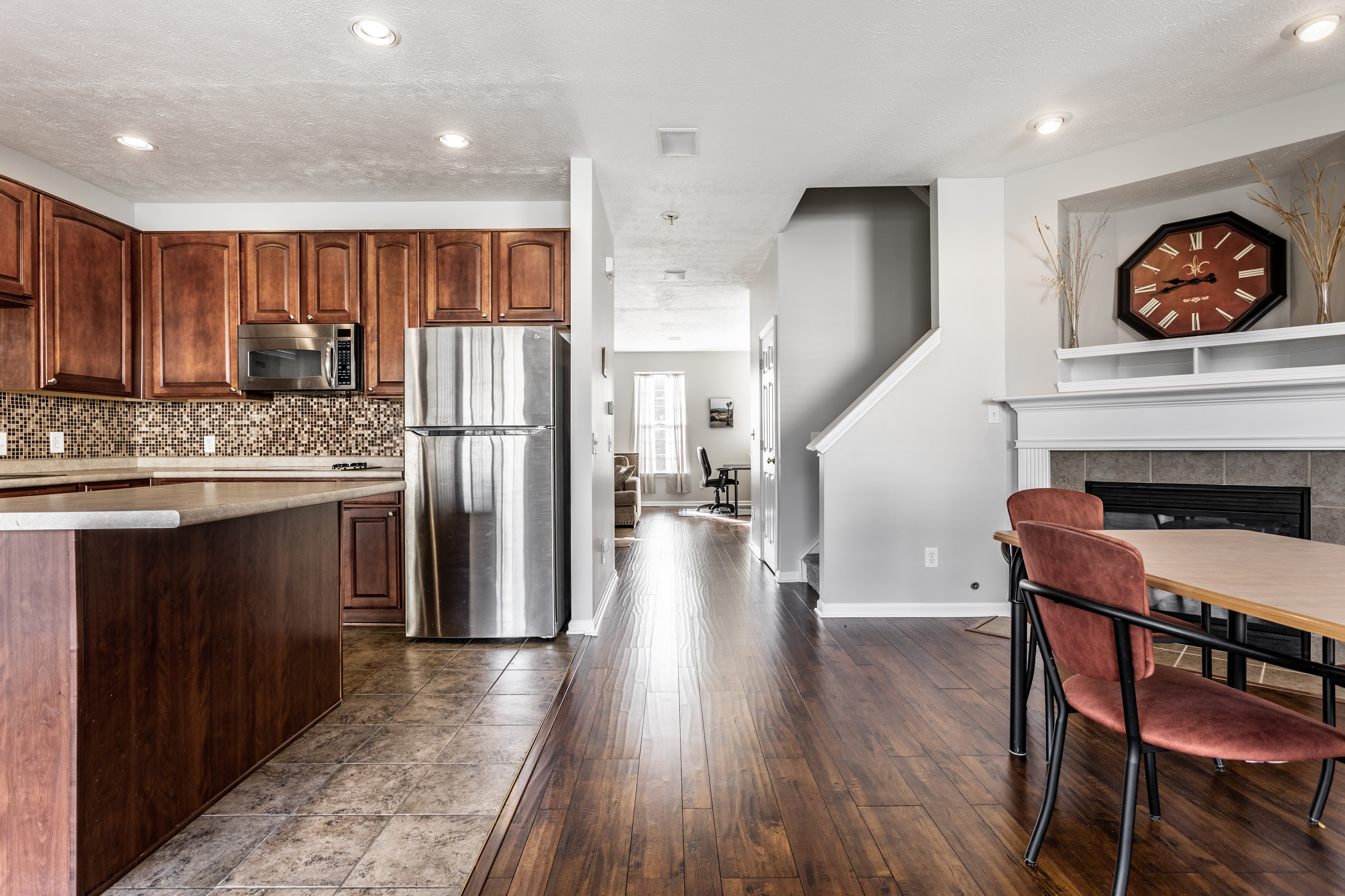 Ideally situated between Castleton and Fishers, this 3 bed/2.5 bath townhome offers 3 levels of expansive and comfortable living with quick access to I-69 and shopping. Inside, each floor exudes smart and elegant design through the sprawling rooms, soaring ceilings, and modern touches. On the 2nd level, encounter an oversized main living area with updated flooring and fresh paint. The kitchen is built for entertaining with tons of storage, double ovens, and a large center island. You’ll also find two features perfect for guests – a dining room equipped with a fireplace and a balcony overlooking the community greenspace. Half bath also on main. The 3rd floor boasts a conveniently located laundry room (W/D stay) and two oversized bedroom suites, each offering walk-in closets and private space for retreat. The third bedroom – situated on the 1st floor, presents a versatile opportunity; use it as a bedroom, home office, or flex space. New LVP flooring in 2023. Parking is a breeze with the attached 2-car garage, which also provides additional storage options. Located in the small and quiet community of Berkely Place, this townhome is the perfect home for those seeking a harmonious blend of style, comfort, and practicality.