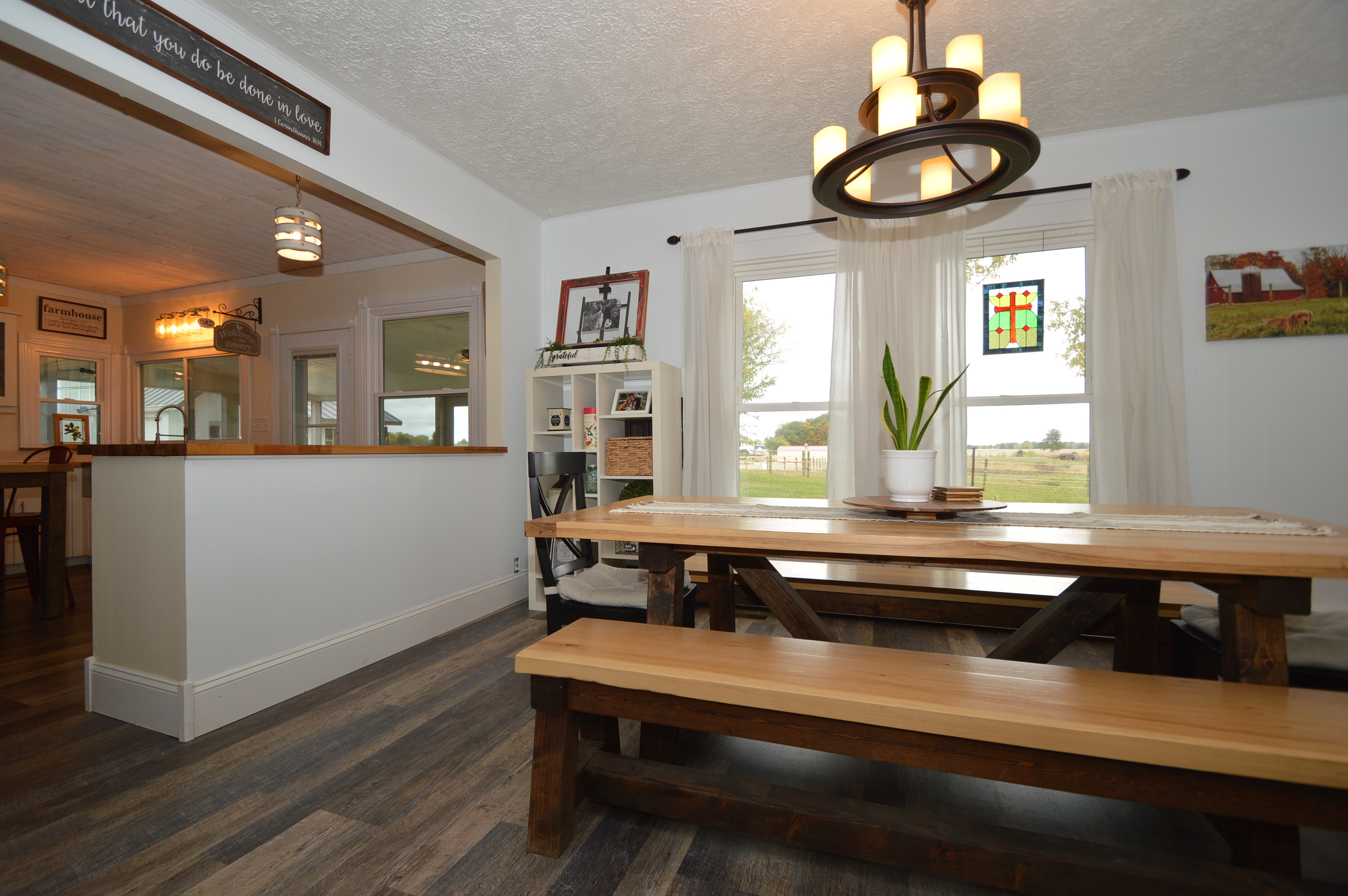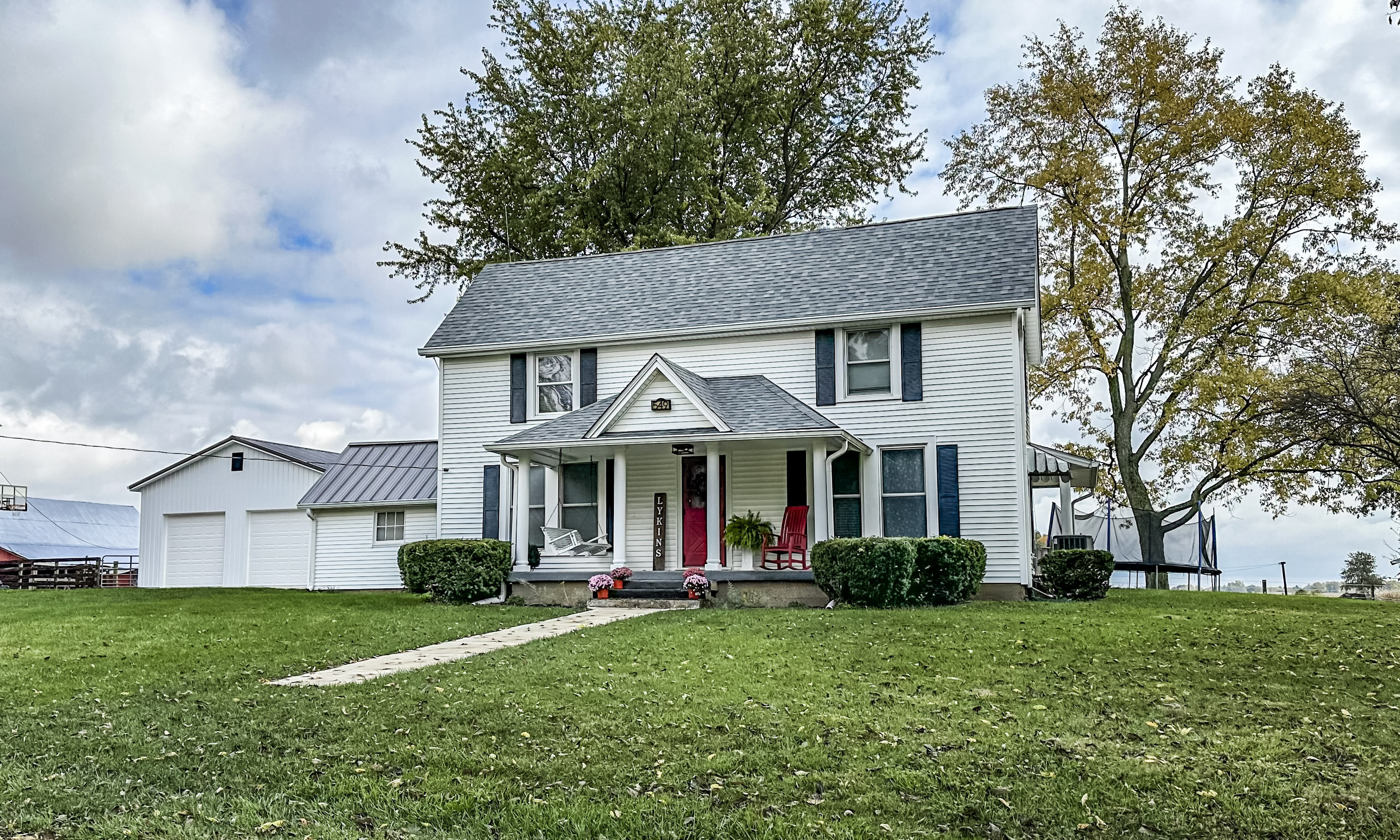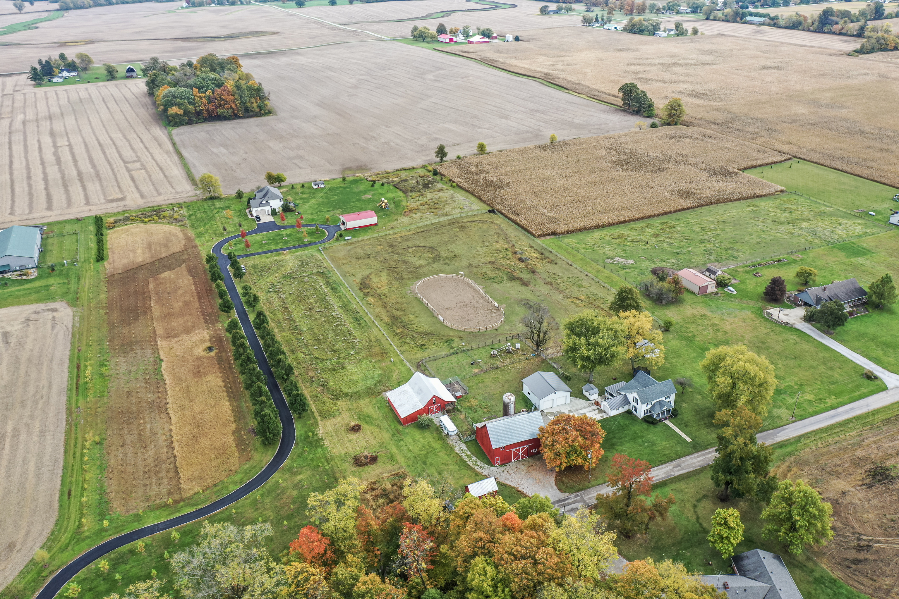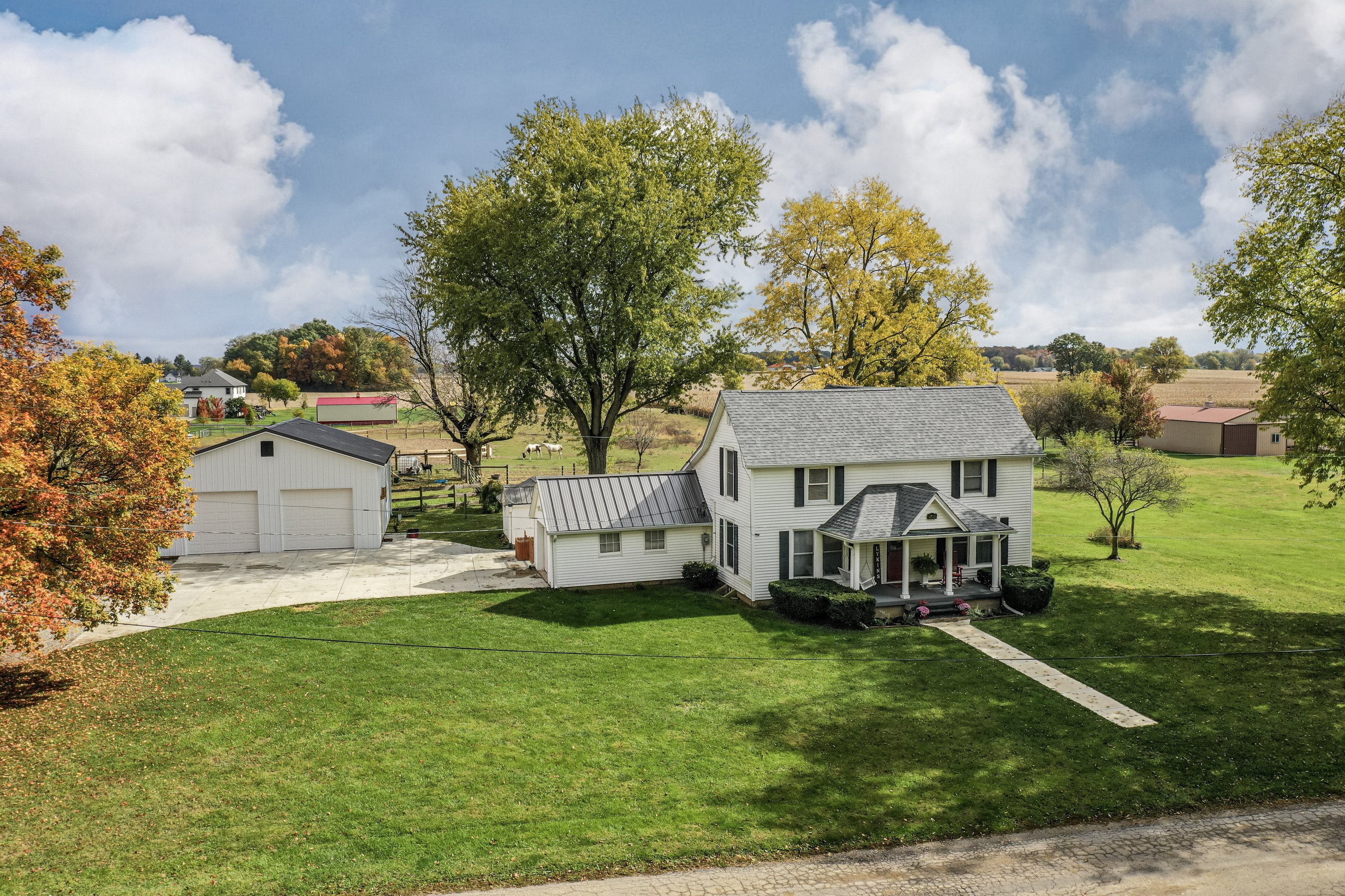 Your picturesque property awaits in this expansive 5-acre horse farm w/ arena that seamlessly blends rural charm, modern comfort and a splendid 4-bedroom farmhouse. As you approach the residence, you are greeted w/ a newly concreted drive & walkway, heated outbuilding w/ workshop potential, functioning barns w/ stalls & tack room, & lush pastures to house various animals. The house itself is a haven of good design, featuring a farm-style kitchen that beckons gatherings & culinary creativity. A butcher block bar for added seating leads to adjacent dining then family rooms where rustic accents create an atmosphere of comforting elegance. 4th bedrooms on the main level can serve as guest quarters or home office. Bathrooms newly remodeled. House has newer windows, tankless water heater, & variable speed heat pump. Come experience the magic of this idyllic property!