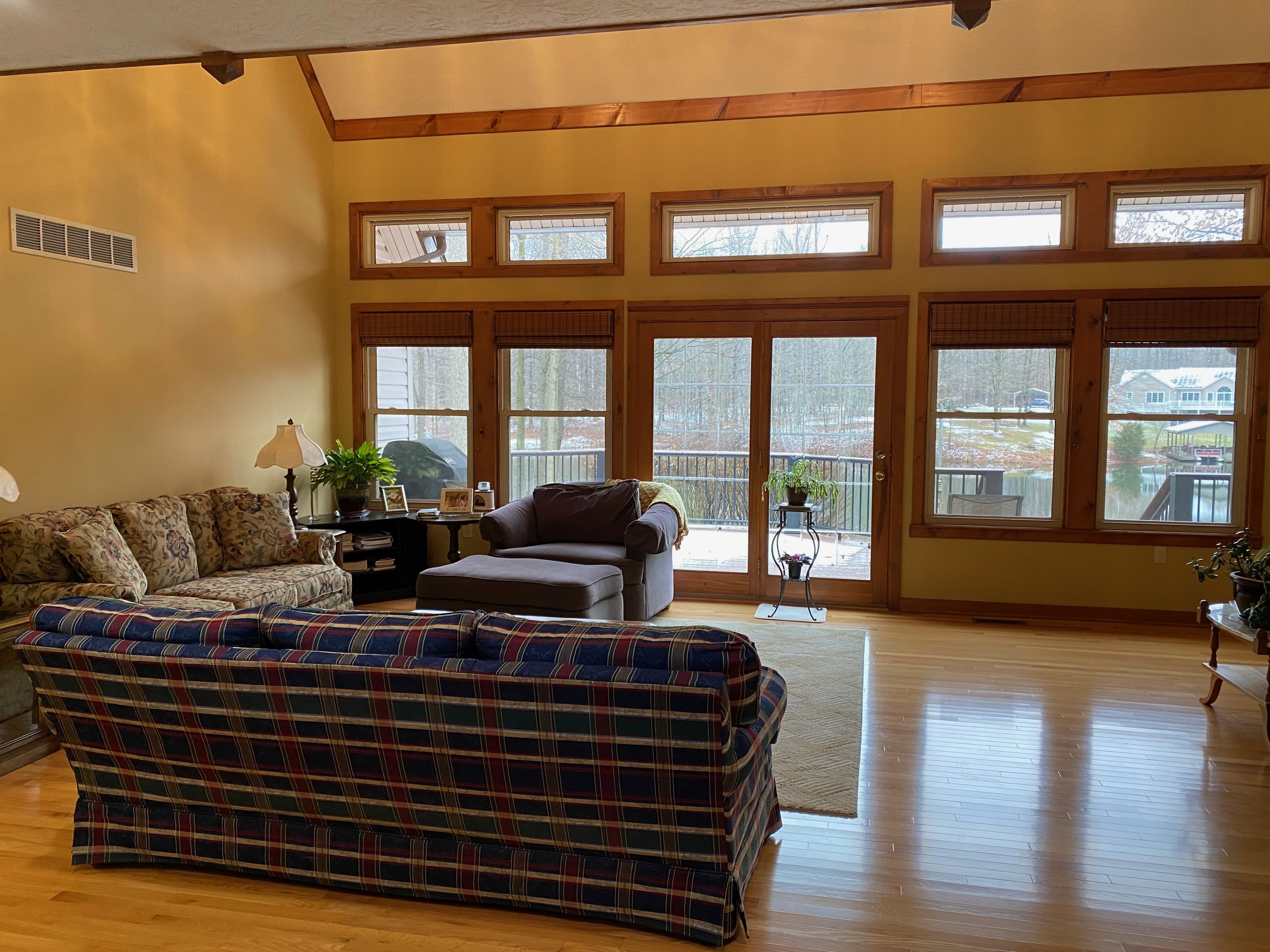 Great location on this 4BR 3.5BA home located on a 5+/- acre shared pond. This all brick home with vinyl trim sits back off the road with mature trees offering seclusion. Nice sized foyer welcomes you into the great room with cathedral ceilings and an abundance of windows offering an immediate view of the backyard and pond. Master bedroom has a private sitting room offering lots of options. Nice sized kitchen with appliances remaining. Lots of closet space and storage including a walk-in attic. Newer no maintenance back deck provides a perfect place to watch the wildlife. Two car attached garage with an adjoining 24×24 rec room. Endless possibilities with this space! Save money with GeoThermal! This beautifully built home is all ready for you to update to your style and enjoy!