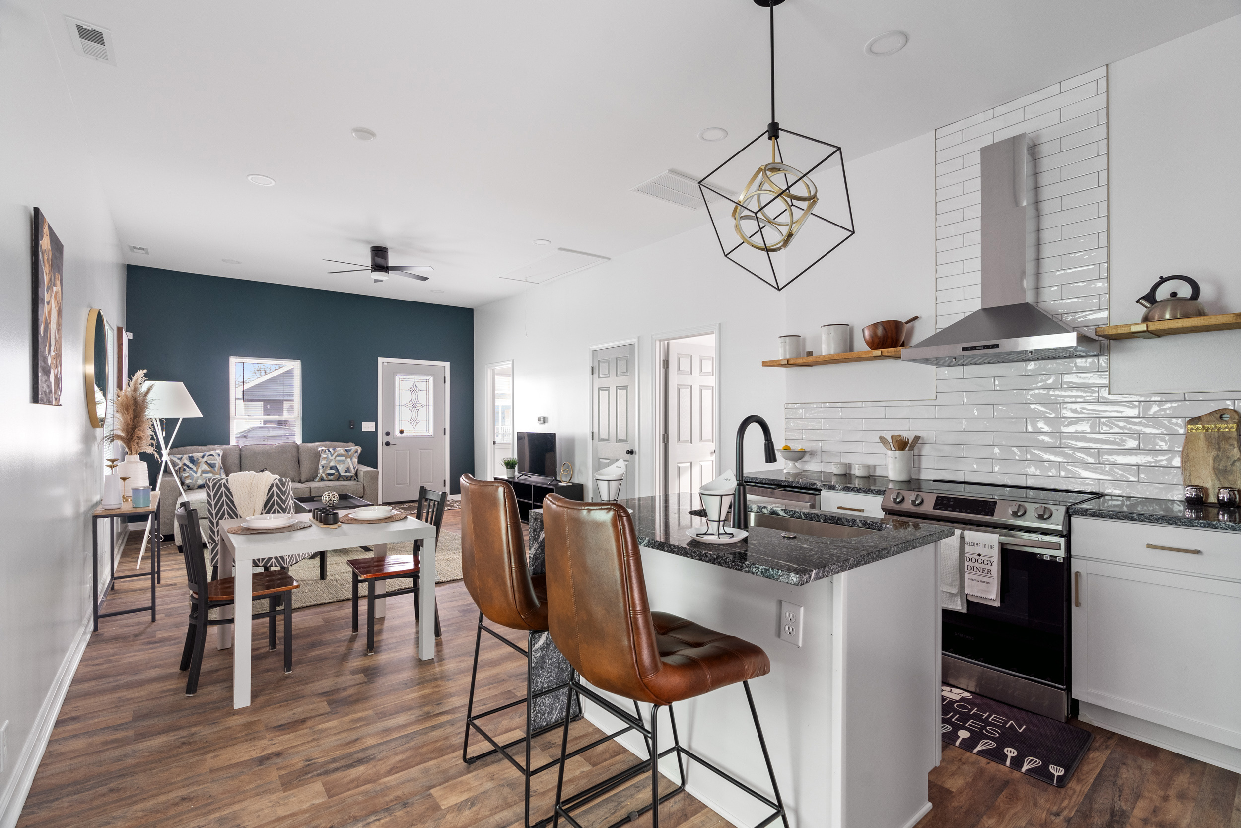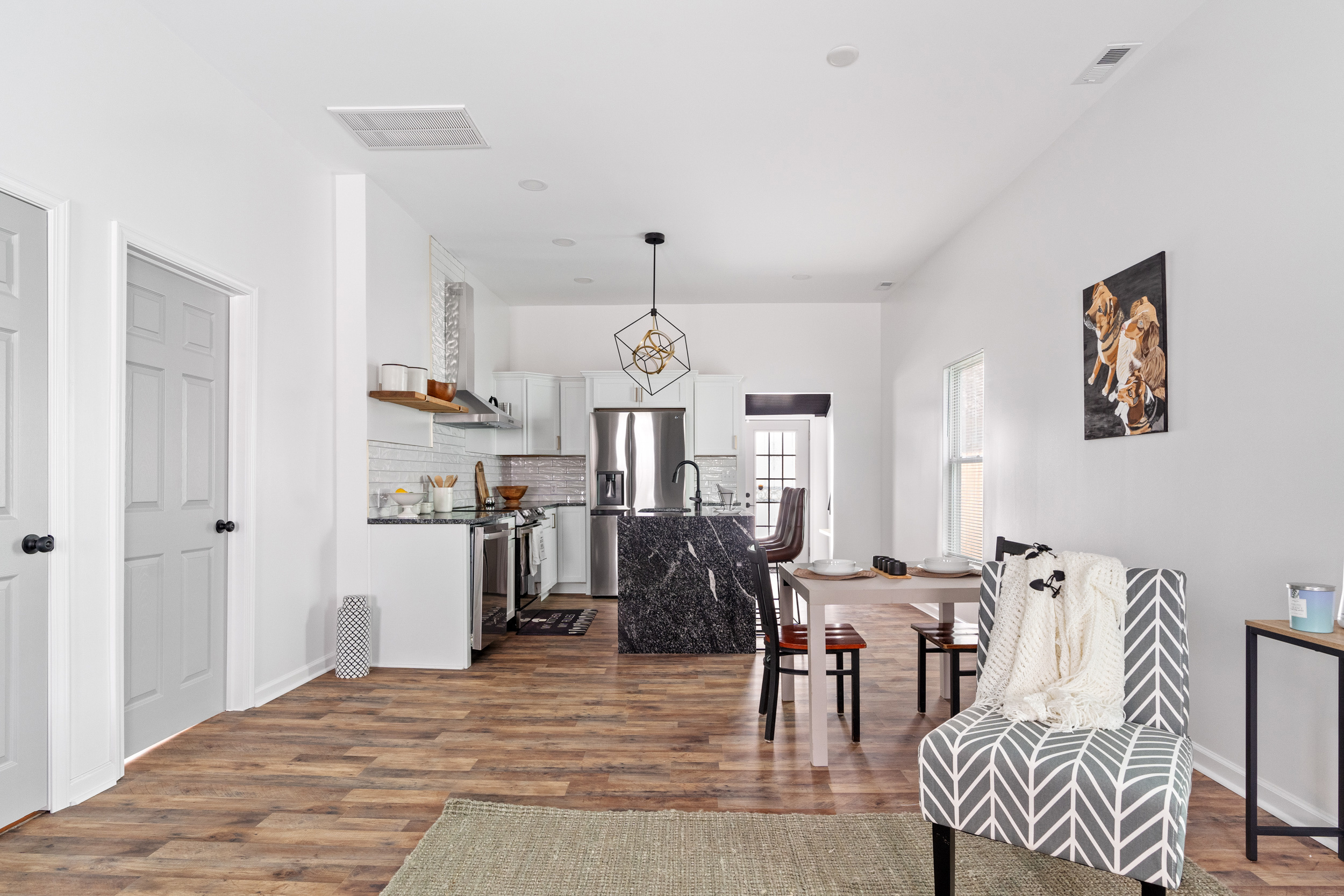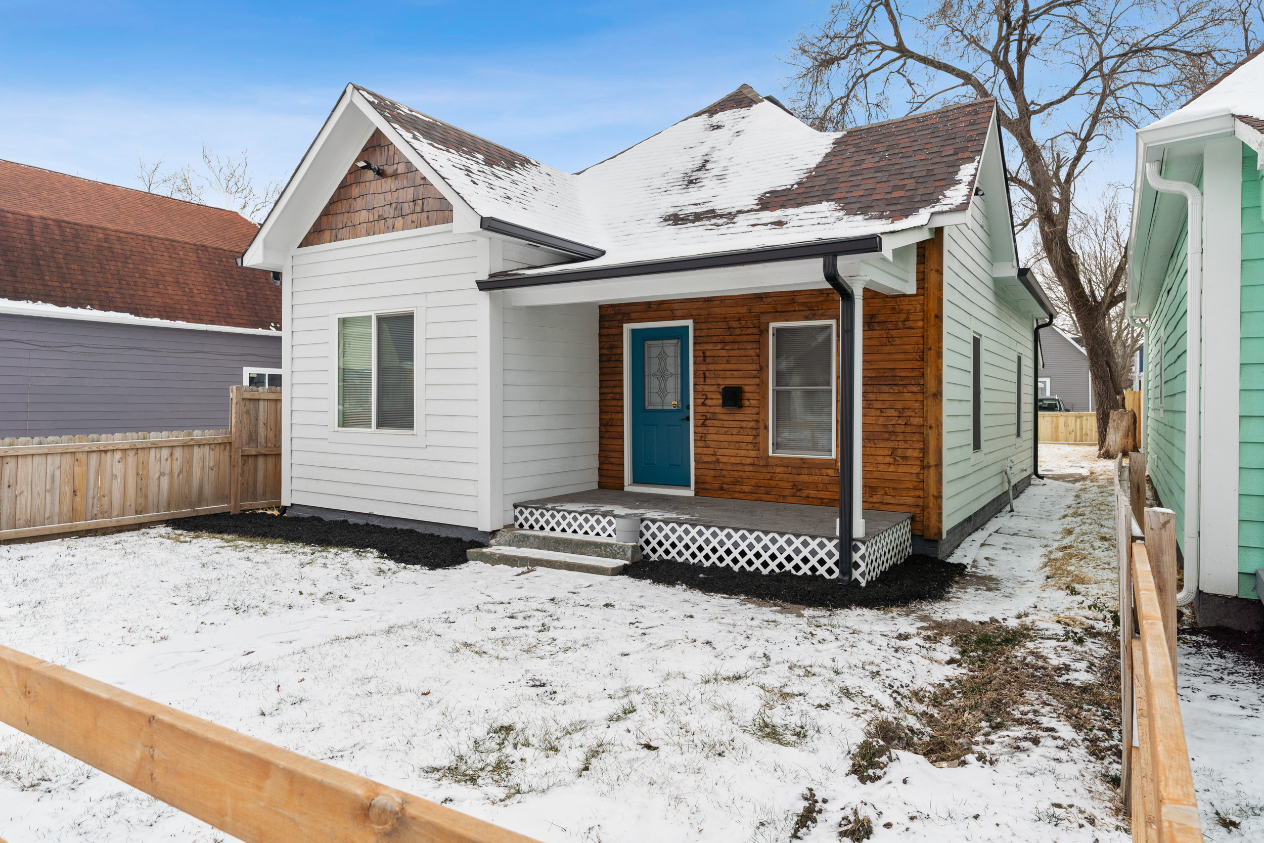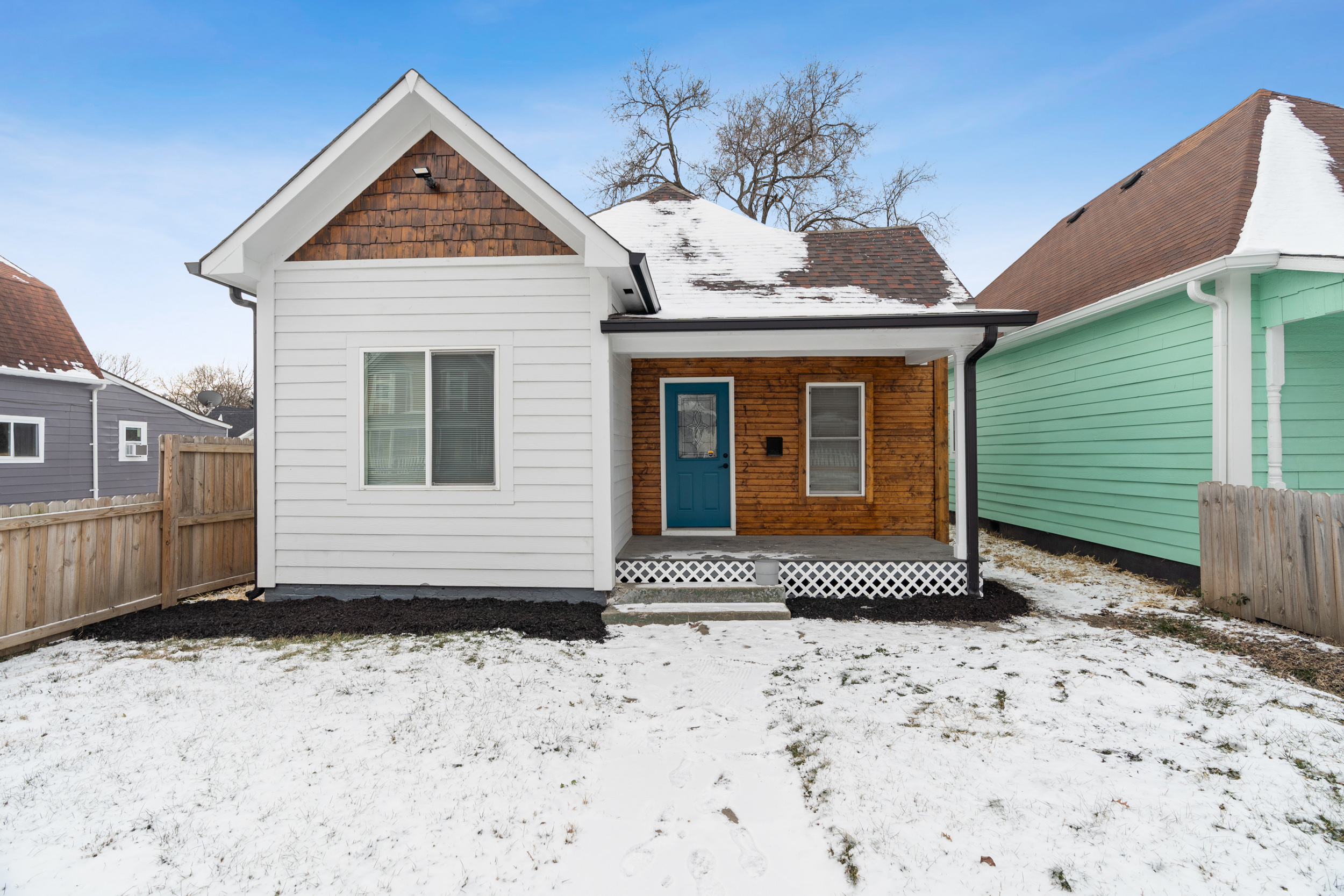 This pristinely renovated gem will exceed your expectations! Fenced front lawn leads to covered front porch. Inside, you’ll be wowed by the 10-ft+ ceilings, warm laminate hardwood flooring and freshly updated fixtures throughout. Open concept living, dining & kitchen allow you to host with ease. Sizeable island with waterfall edge and breakfast bar overlooks the custom tile backsplash and accent shelving. Brand new stainless steel kitchen appliances are included! Rare main level laundry/mud room includes washer/dryer and leads to the fully fenced backyard with a sizeable parking pad for 3+ vehicles! 2 comfortable main level bedrooms have access to 2 full bathrooms. Exquisite primary ensuite features double vanity, large walk-in shower & walk-in closet! New siding, windows, roof, electrical, plumbing & mechanicals. Enjoy low maintenance living just minutes from your favorite Fountain Square hangouts.