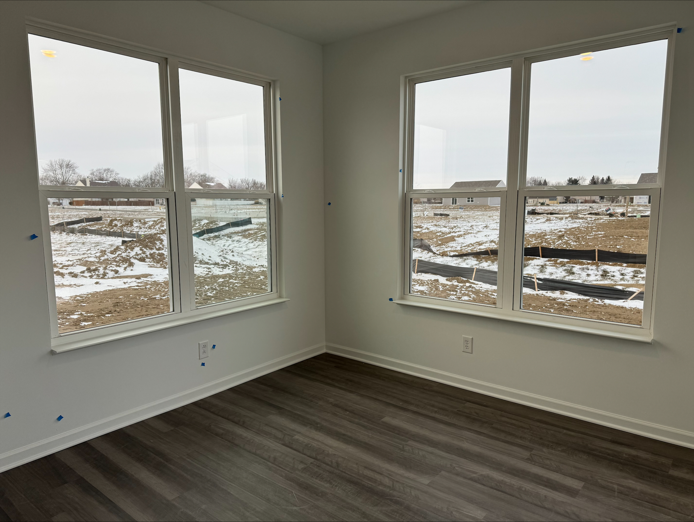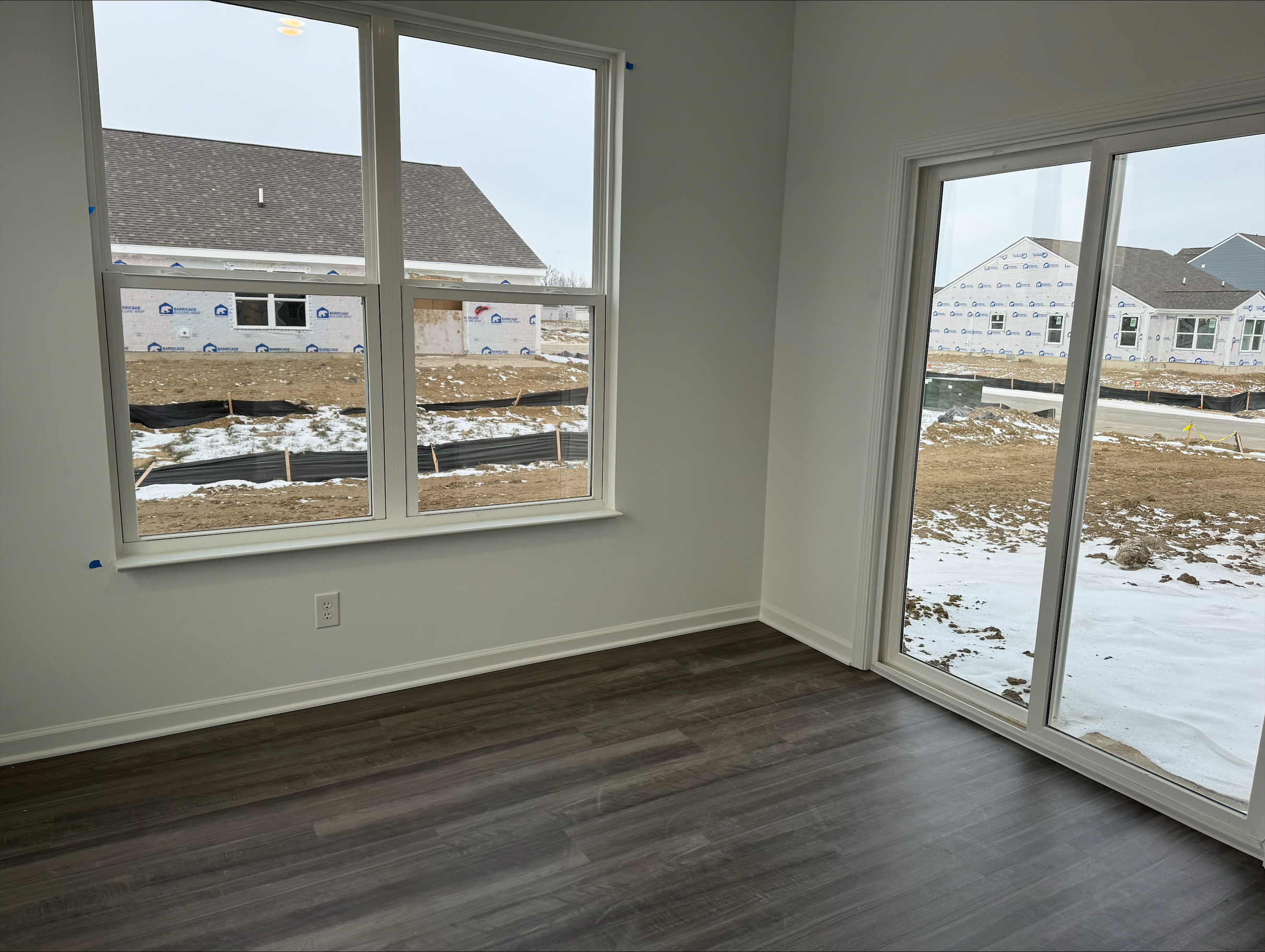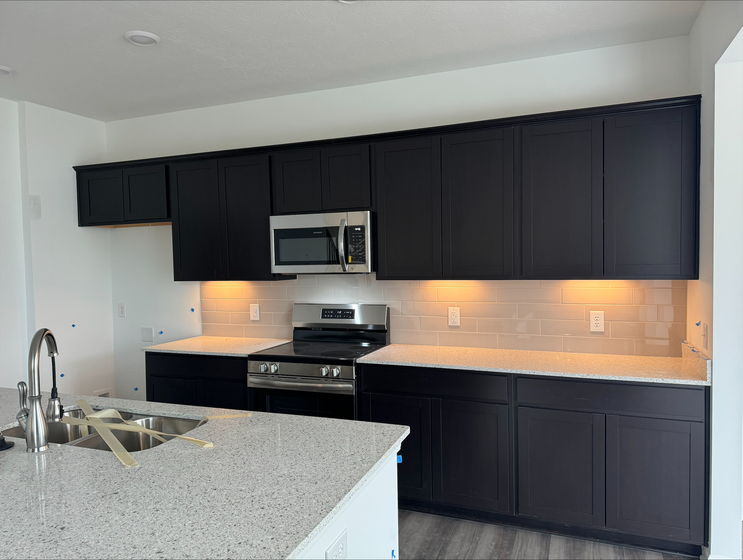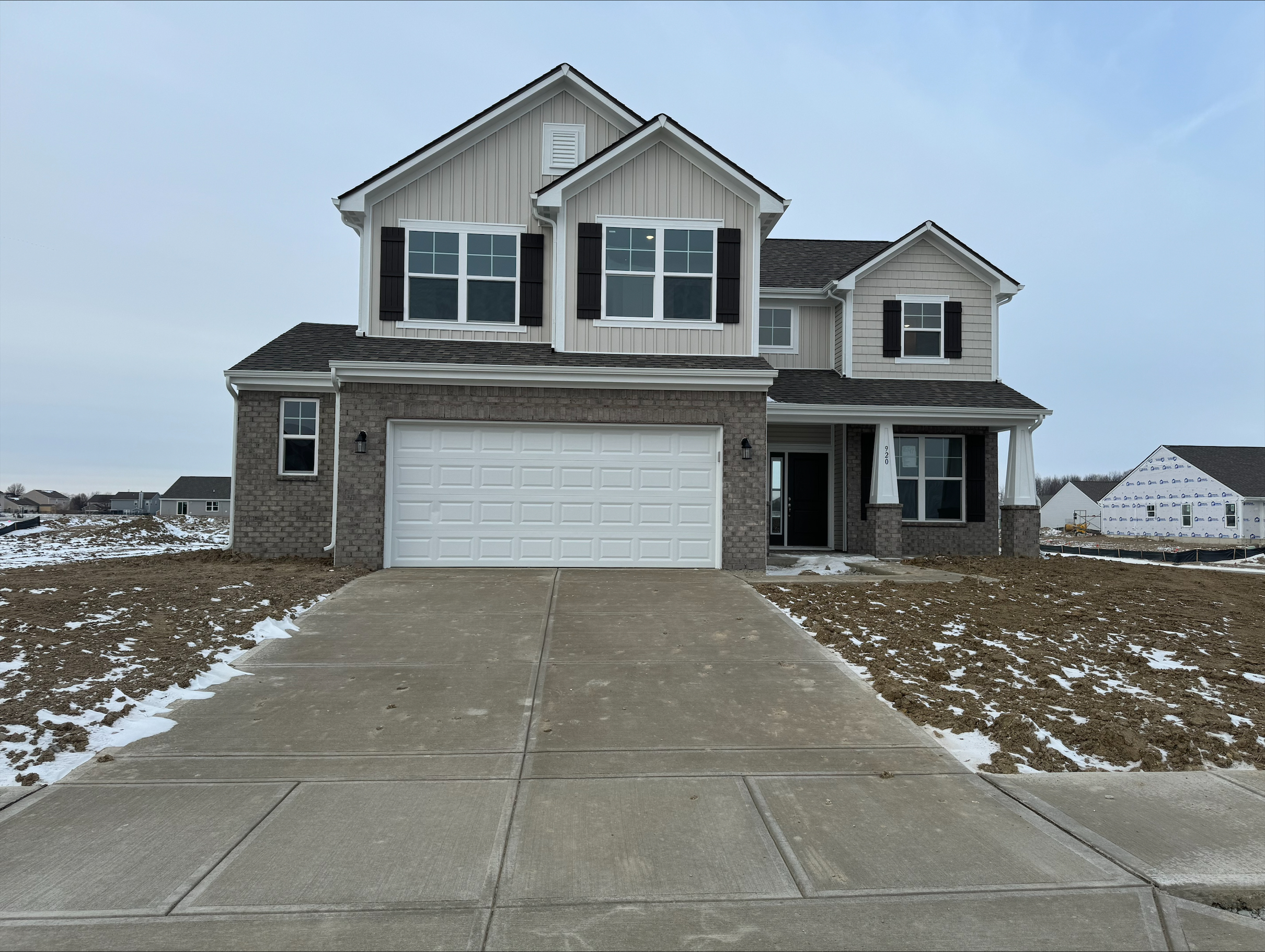 The Asepn II, a spacious 4 bedrooms, 2 and a half baths, and a 2-car garage home with keyless entry for your utmost convenience. Feature brick and vinyl siding, Board-n-Batten shutters, full front porch. Upon entering, you are greeted by 9-foot ceilings on the first floor, The flooring on the first level is with vinyl plank, providing both durability and a touch of elegance. The carefully designed layout encompasses a study, great room, dining room, kitchen and a convenient half bath featuring a tall, elongated toilet. The kitchen features a breakfast bar with 2CM quartz countertops complemented by 36-inch-tall straight cabinets and cabinets above the refrigerator for ample storage. The stylish tile backsplash adds a contemporary flair. High-quality Frigidaire stainless steel appliances, including a microwave, dishwasher, and electric range stove, elevate the kitchen’s functionality. Kitchen pantry included for additional storage. The breakfast bar contains 9” deep undermount kitchen sink adds practicality to the space. Adjacent to the kitchen is the a sunroom, through the sliding doors to a 3×3 concrete stoop. Venture to the second floor to the primary bedroom, featuring a step ceiling, attached bathroom with double sinks, a garden tub, a standing shower, and a spacious walk-in closet. Three additional bedrooms on the second floor come complete with individual closets, offering privacy and comfort for family members or guests. Hall bathroom on the second floor features a tub-shower combination and tall, elongated toilets. All bathrooms boast 2cm quartz countertops and standard cabinets. Second floor also hosts a well-designed laundry room with vinyl flooring. Home is equipped with an electric furnace and heat pump, complemented by a digital thermostat for easy temperature control. The 50-gallon electric water heater ensures a reliable supply of hot water for your daily needs