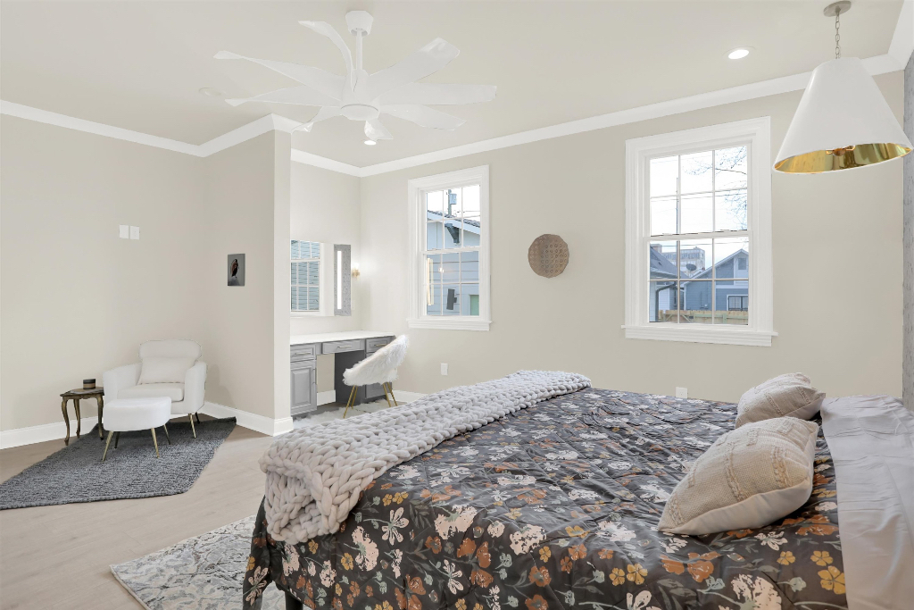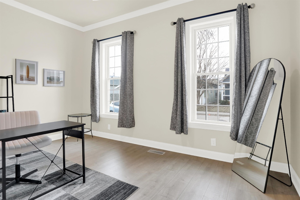 This home includes a Google Nest thermostat & video doorbell, super high-efficiency tankless water heater, & HVAC system. 9ft + ceilings, crown molding throughout. An open concept kitchen features a wet bar, wine cooler, high end cabinetry w/ soft-close doors & drawers, granite countertops, ss appliances w/gas range & a huge 6×6 island w/ an apron sink. All baths offer James Martin vanities The master suite offers a separate walk-in dual shower, shaving niche, & garden tub. Also featuring a built-in lighted mirror powder desk, a large walk-in closet as well. Beautiful 8 foot Pella French Doors lead out to a large deck for entertaining. 1st floor laundry room. Buried utilities. Polaris windows. An over-sized garage & fenced back yard! The house is quipped with a wireless SimpliSafe alarm system which is compatible with the other Smart Home features.