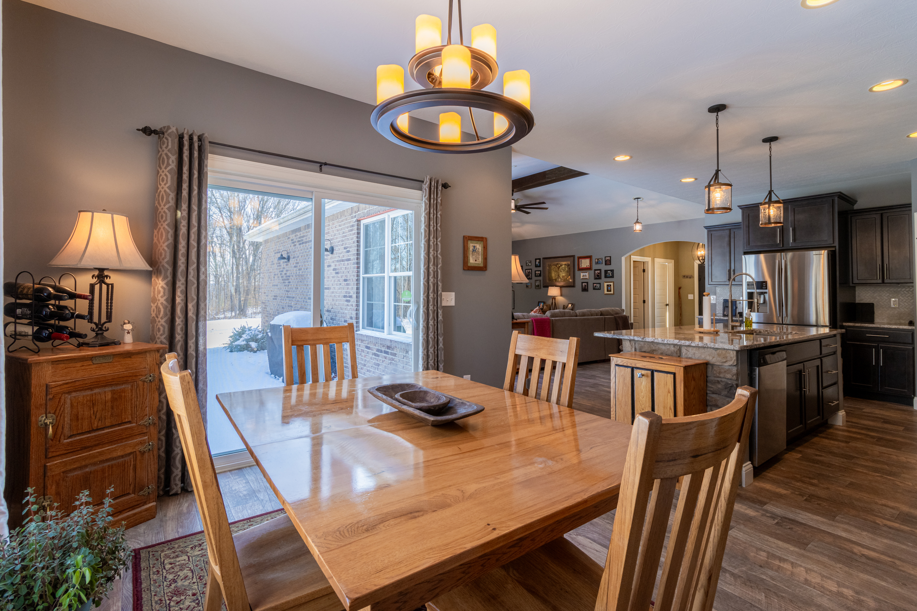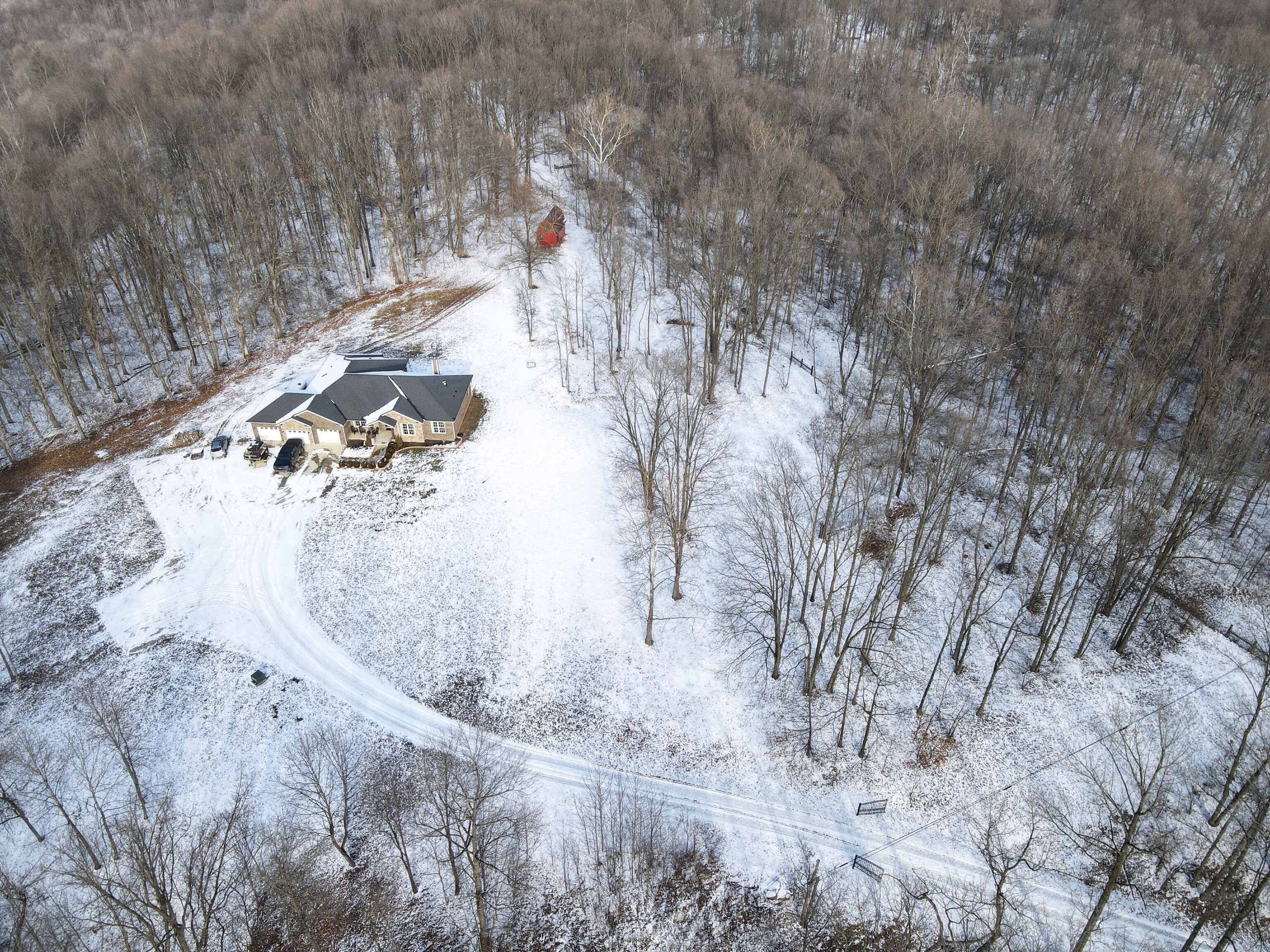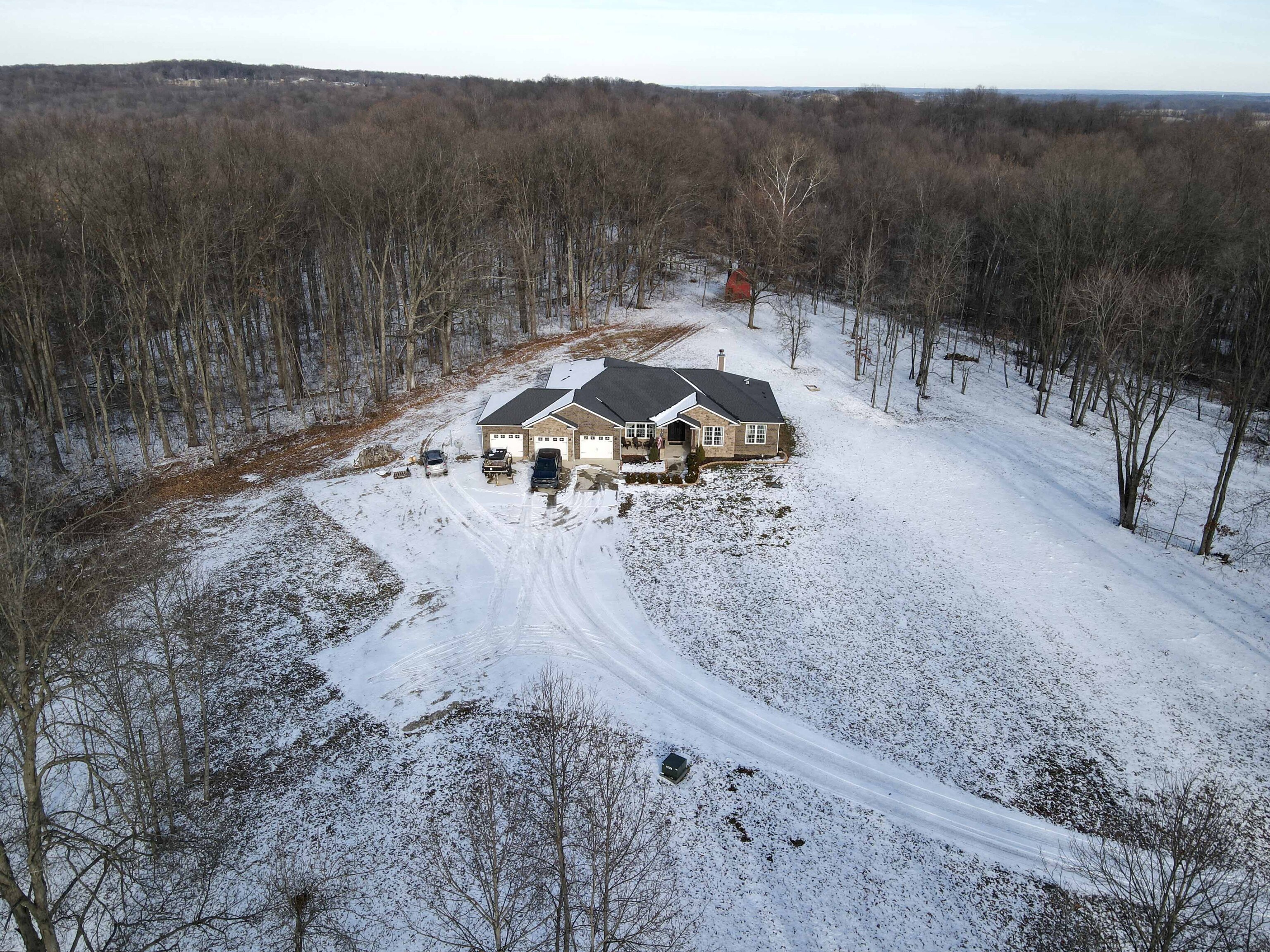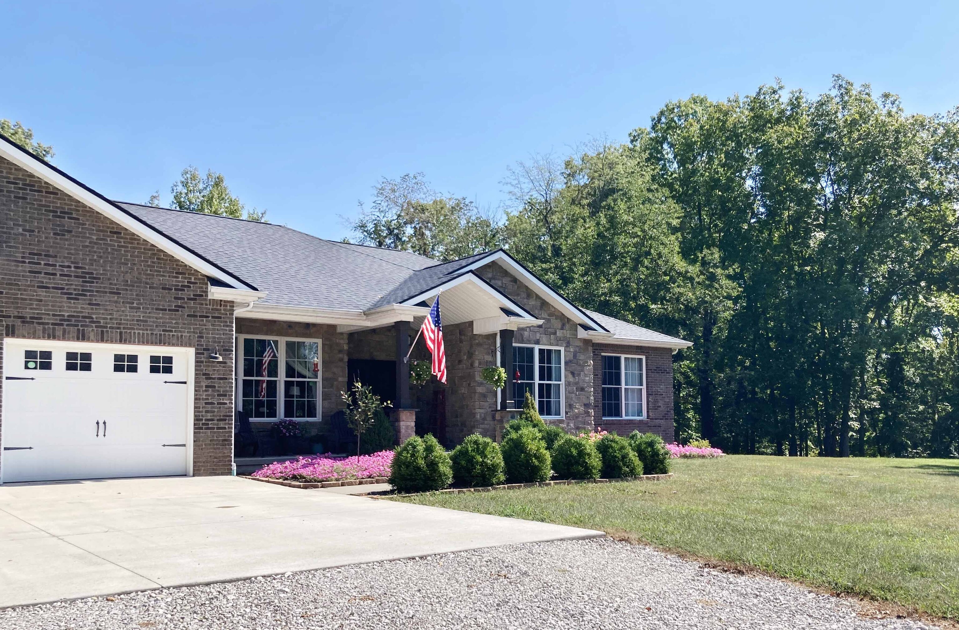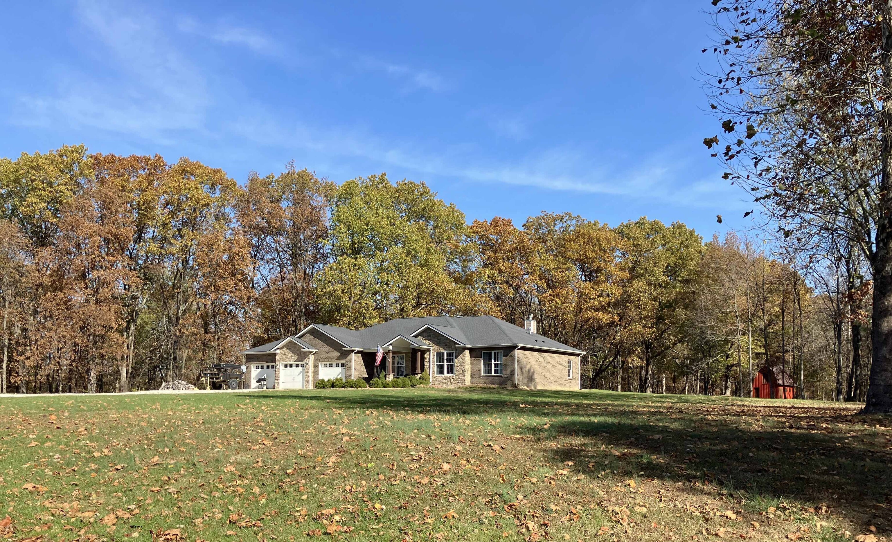 Discover the perfect blend of rural charm and contemporary comfort in this meticulously maintained custom-built ranch-style home on 5 wooded acres. The all-brick and stone residence features 3 bedrooms, 2.5 baths, a 3-car garage, and a private gated drive. Upon entering through ornate iron front doors, a foyer leads to an office and a versatile bonus room. The spacious great room impresses with vaulted ceilings, updated fixtures, and a natural stone wood-burning fireplace. The gourmet kitchen boasts granite counters, stainless appliances, double oven, propane cooktop with vented hood and a spacious pantry. Large windows and sliding patio doors offer spectacular views of wildlife from the dining area. The owner’s bedroom has an ensuite bath with a double vanity sink, tiled shower, garden tub and large closet with built-in shelves. Split floor plan ensures privacy with a separate bedroom area and full bath. Cleared woods provide stunning wildlife views, and a refurbished shed with a metal roof adds charm. Ideally located for Crane, Bedford, or Bloomington commuters. Starlink high speed internet available!