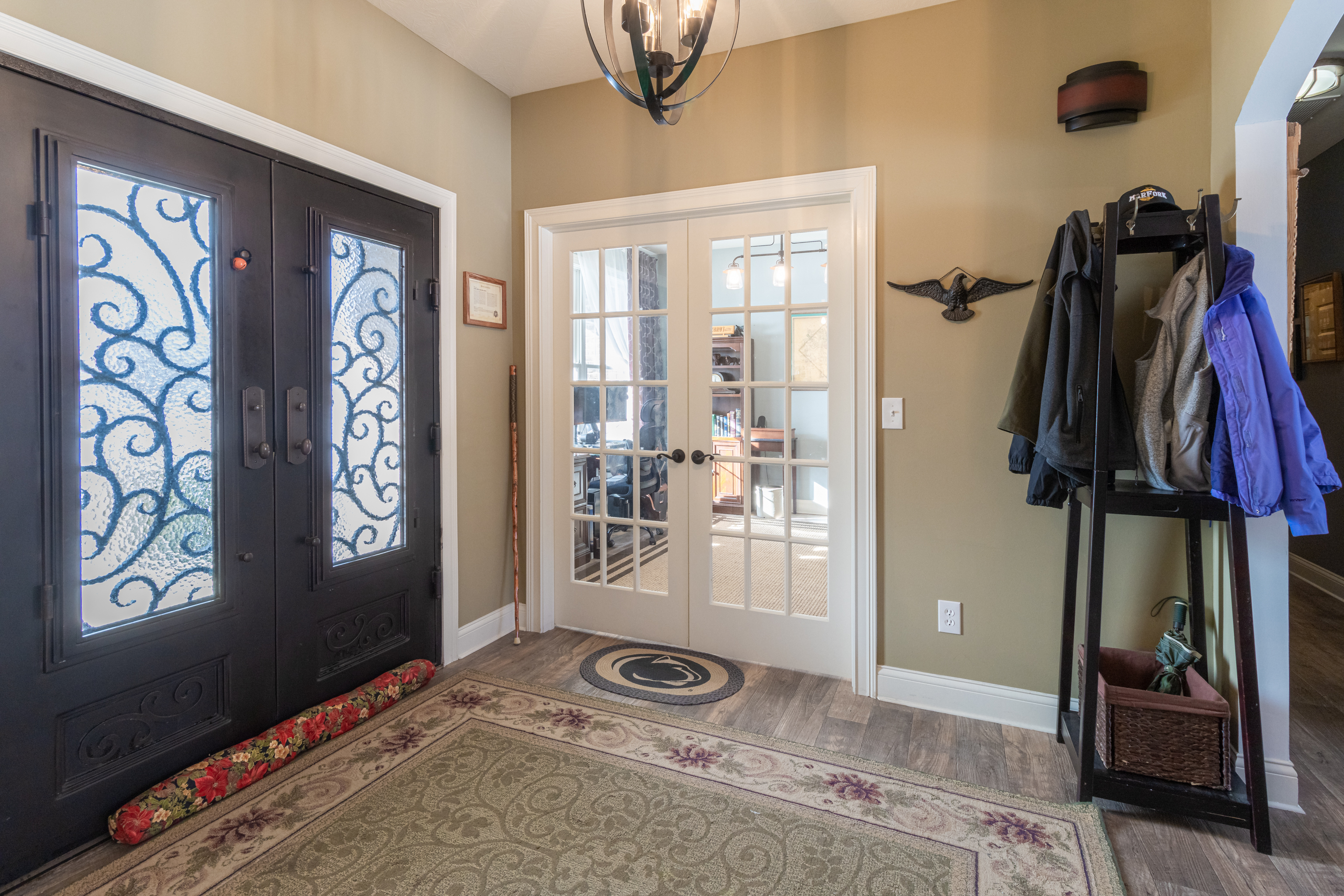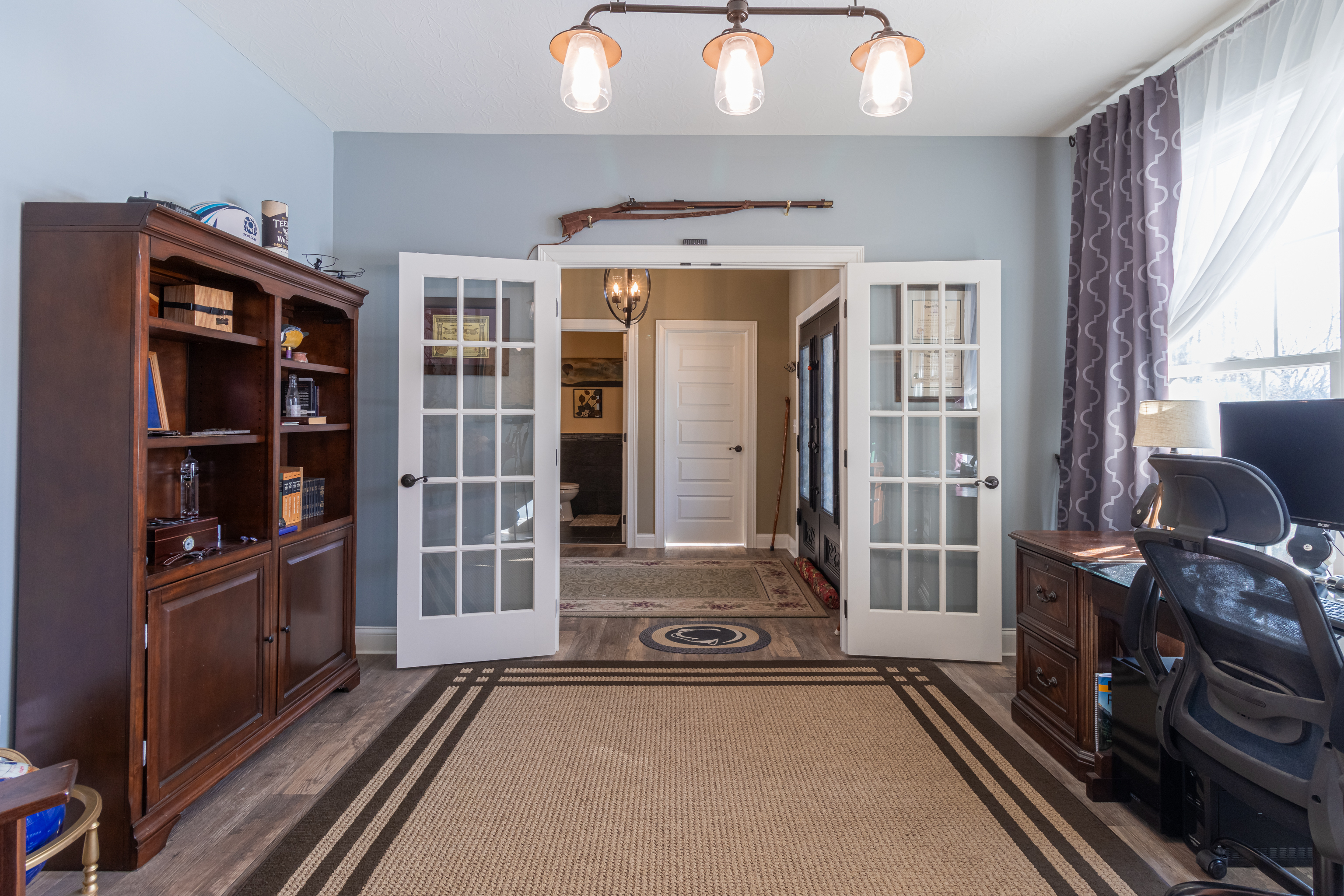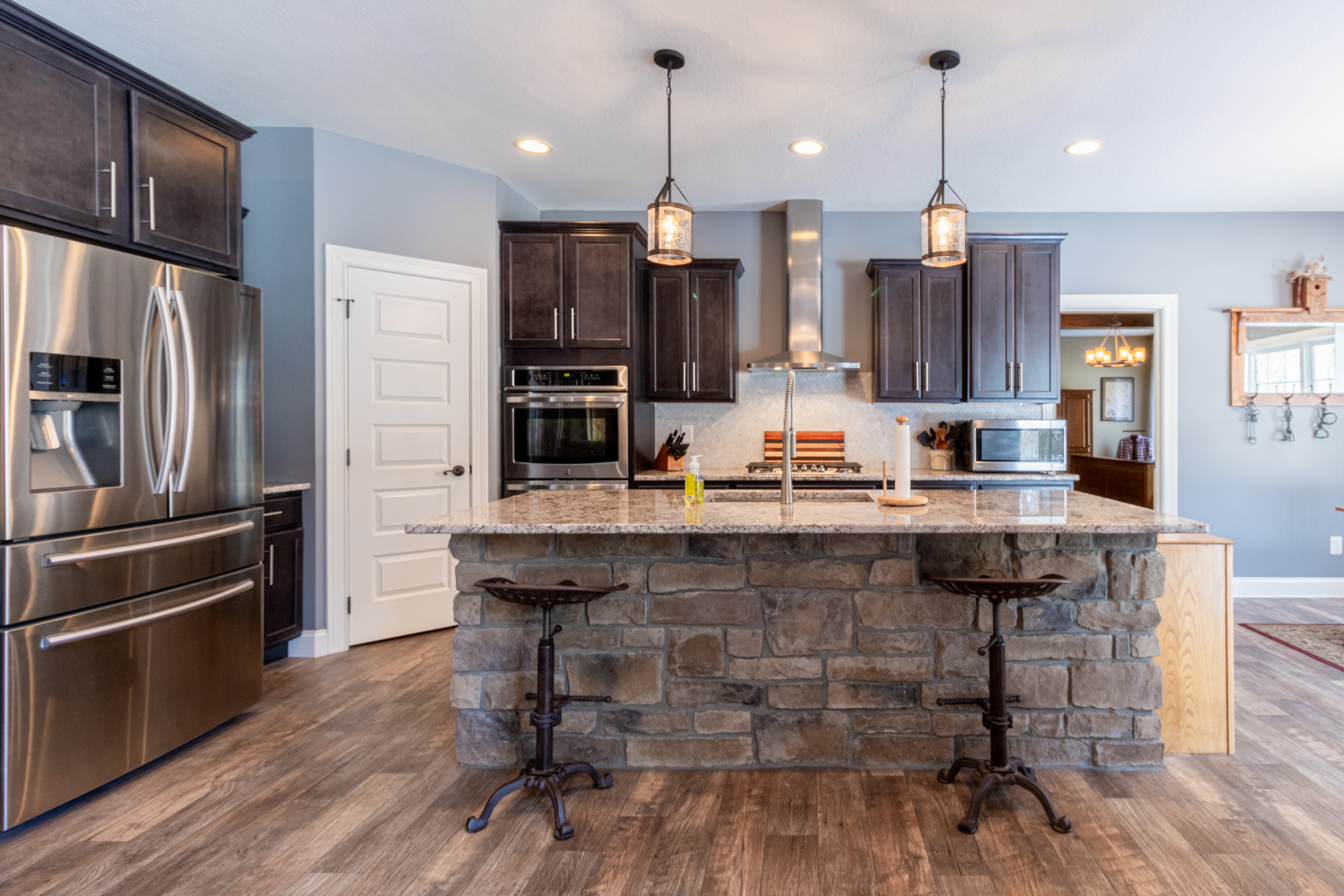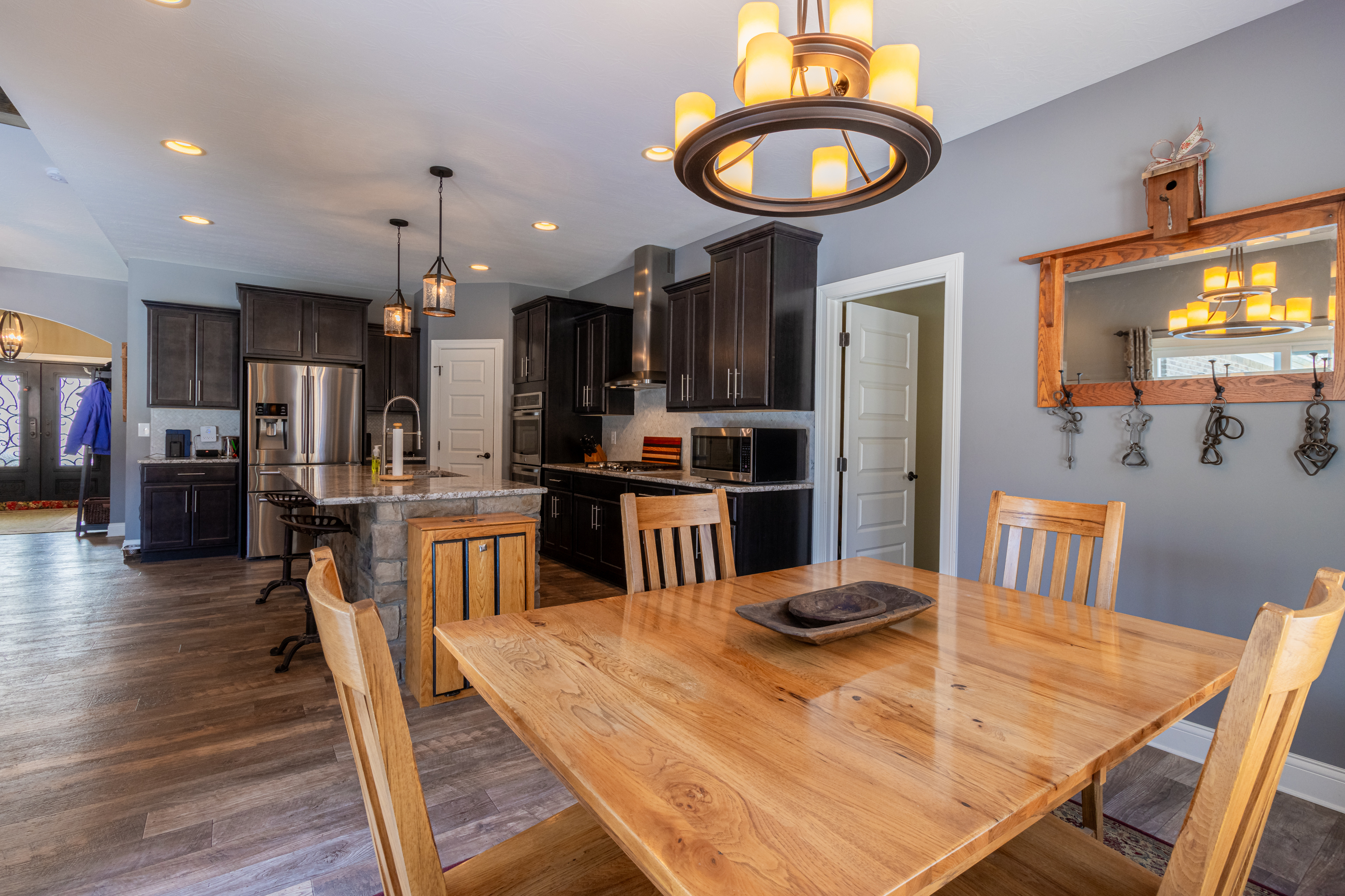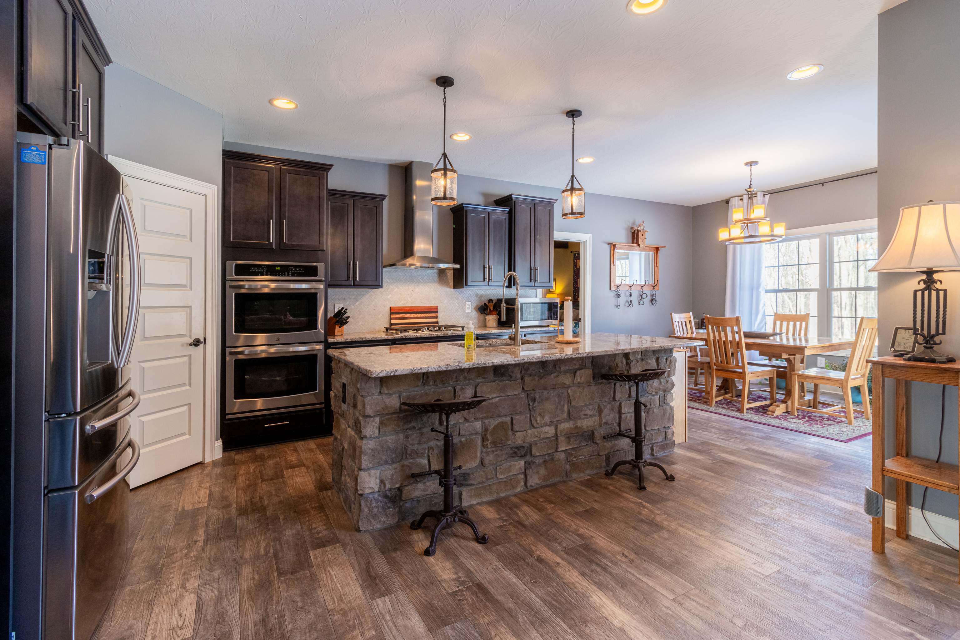 Discover the perfect blend of rural charm and contemporary comfort in this meticulously maintained custom-built ranch-style home on 5 wooded acres. The all-brick and stone residence features 3 bedrooms, 2.5 baths, a 3-car garage, and a private gated drive. Upon entering through ornate iron front doors, a foyer leads to an office and a versatile bonus room. The spacious great room impresses with vaulted ceilings, updated fixtures, and a natural stone wood-burning fireplace. The gourmet kitchen boasts granite counters, stainless appliances, double oven, propane cooktop with vented hood and a spacious pantry. Large windows and sliding patio doors offer spectacular views of wildlife from the dining area. The owner’s bedroom has an ensuite bath with a double vanity sink, tiled shower, garden tub and large closet with built-in shelves. Split floor plan ensures privacy with a separate bedroom area and full bath. Cleared woods provide stunning wildlife views, and a refurbished shed with a metal roof adds charm. Ideally located for Crane, Bedford, or Bloomington commuters. Starlink high speed internet available!