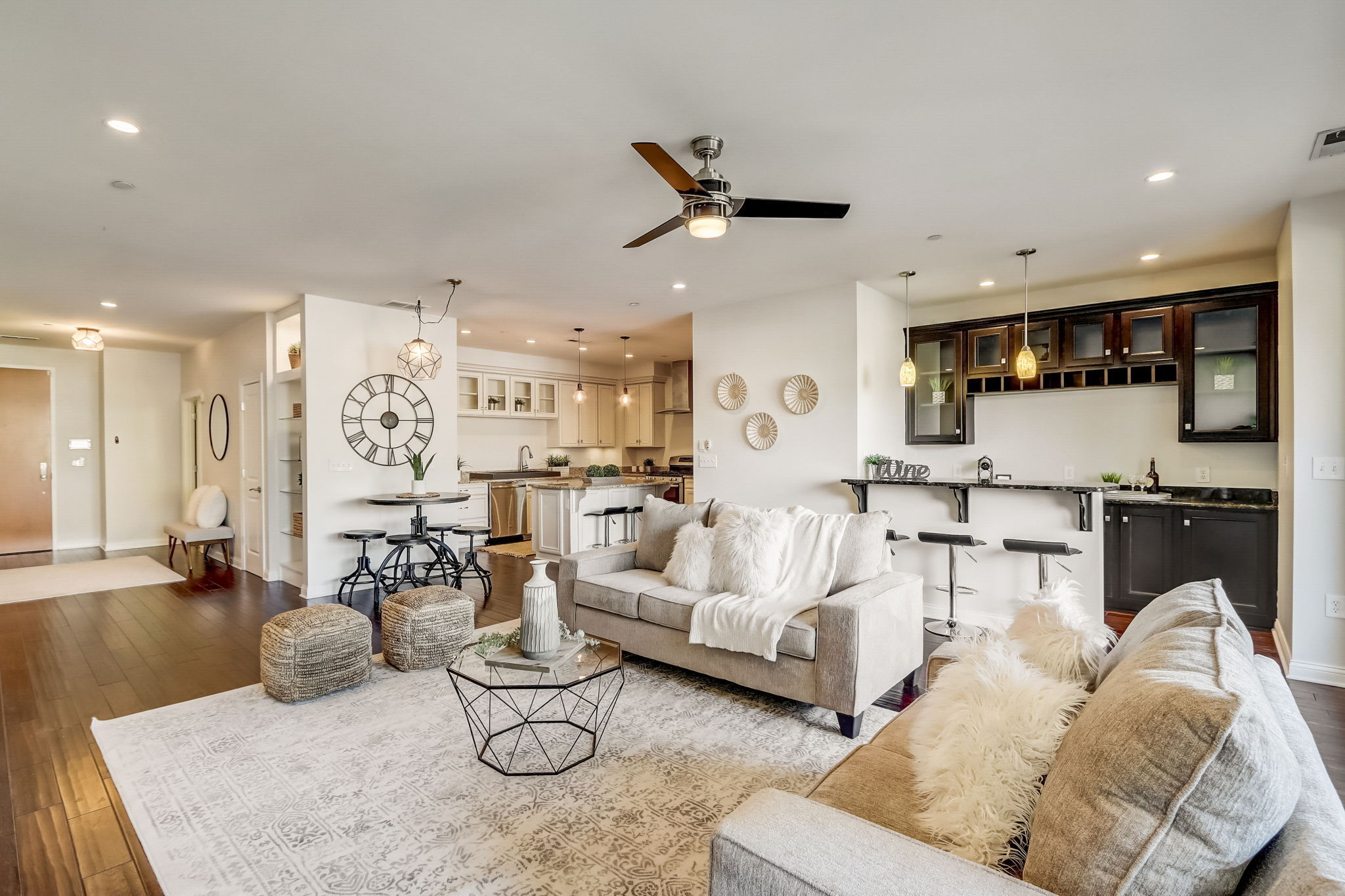 Welcome to city living at its finest! This luxurious residence boasts almost 2200 square feet of living space, overlooking the vibrant Mass Ave. With a modern open floor plan & hardwood floors throughout, the ambiance is both chic and inviting. Natural light floods the interior, highlighting the exquisite details. The gourmet kitchen is a chef’s dream, featuring high-end stainless steel appliances, a spacious island, and beautiful cabinetry. The entertainer’s great room is adorned with a custom bar, offering a perfect setting for gatherings with friends and family. Step out onto the 120 square foot private terrace, complete with a natural gas line for your grill, and soak in the breathtaking views of the cityscape. The primary suite is boasting a massive walk-in closet and a private bathroom with double sinks, a full tub, and an extra-large tile shower. Convenience is key w/private laundry in the unit. Included with the residence is one parking spot in the private garage and a spacious storage unit. Residents of 333 Mass enjoy access to a gym, rooftop patio, & temperature-controlled wine storage, adding to the allure of this exceptional urban oasis plus indoor-Garage Parking. Don’t miss your chance to experience the epitome of city living in this remarkable home!