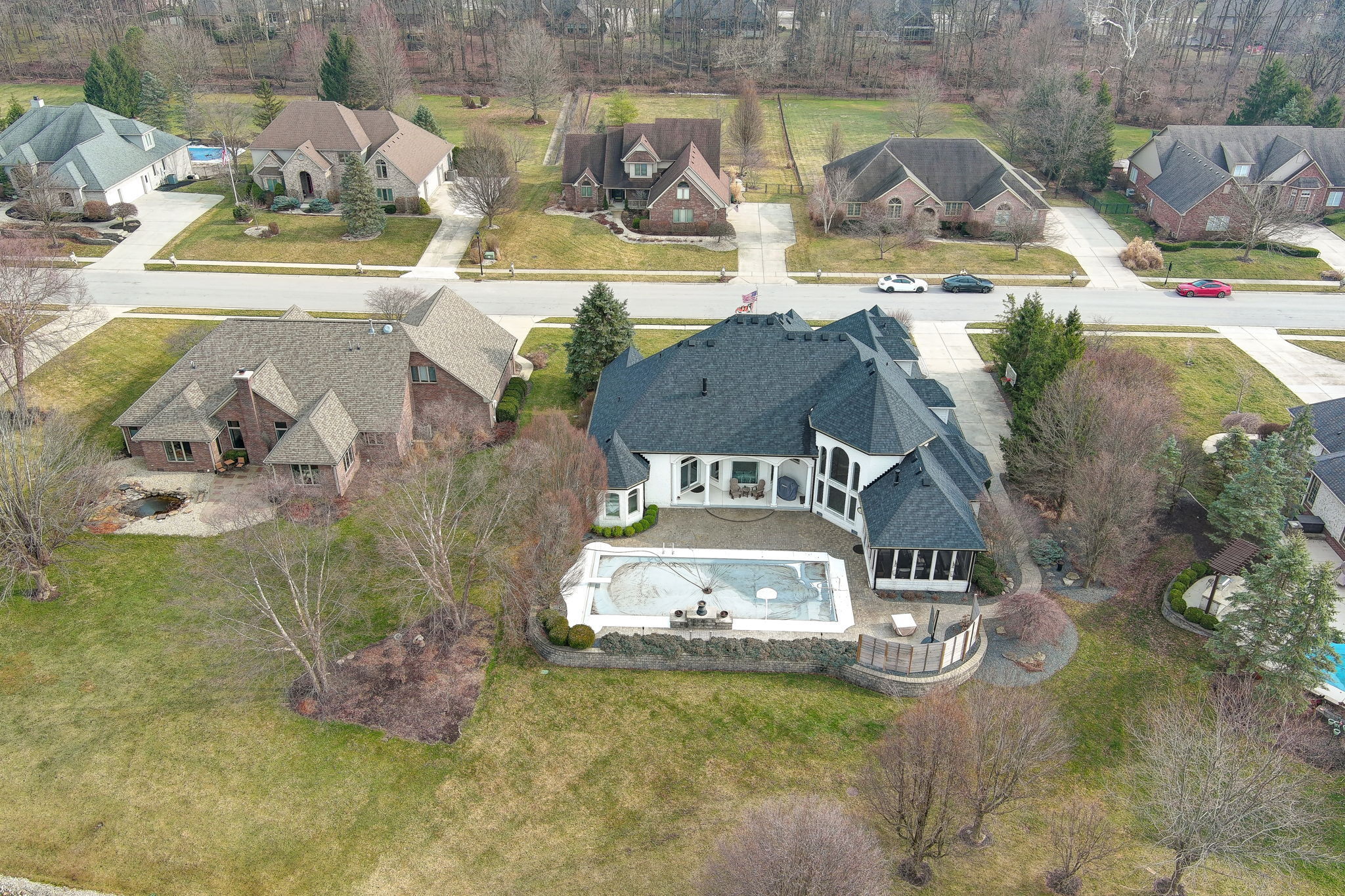 Welcome to your exquisite retreat nestled in the prestigious community of North Forest Commons of Avon. This magnificent 4-bed, 3 1/2-bath residence redefines luxury living, blending timeless elegance w/modern sophistication @ every turn. Upon arrival, be awe-struck by the grandeur of the Alba Pietra Quartz exterior, a testament to enduring quality & design. Durable & luxurious material sets the tone for the remarkable craftsmanship found throughout the home. Step inside to discover a sanctuary of light & space, floor-to-ceiling windows frame breathtaking views of the saltwater pool & scenic pond beyond. The flow btwn indoor & outdoor spaces creates an ambiance of sophistication, perfect for intimate gatherings & grand entertaining. The open-concept living & dining areas provide an inviting atmosphere for hosting guests, while a whole-home wired speaker system ensures seamless listening throughout. Retreat to the lavish Owner’s suite. Pamper yourself in the spa-like ensuite bath, featuring a soaking tub, dual vanities & a spacious walk-in shower. 3 additional bedrooms offer comfort & privacy for family & guests alike. Escape to your own private paradise. Lounge poolside on warm summer days, dine alfresco on the screened-in patio, or take a refreshing dip in the pool. W/ a full bath conveniently located poolside, leisure is truly uninterrupted. For the automotive enthusiast, the 3.5-car garage w/ epoxy flooring provides ample space for vehicles & storage, combining both convenience & style. Updates & upgrades abound, including a new roof w/ a 50-year manufacturer’s warranty, new pavers, pool concrete, diving board, & rails installed in 2023, as well as a new water softener, tankless water heater, digital thermostats, updated outdoor lighting, high streaming functions for all TVs, & replaced sprinkler heads. Located moments from Avon Schools, shopping, dining, recreational amenities, Saddlebrook Golf Club, the airport & DT Indy. Enjoy the epitome of luxury living!