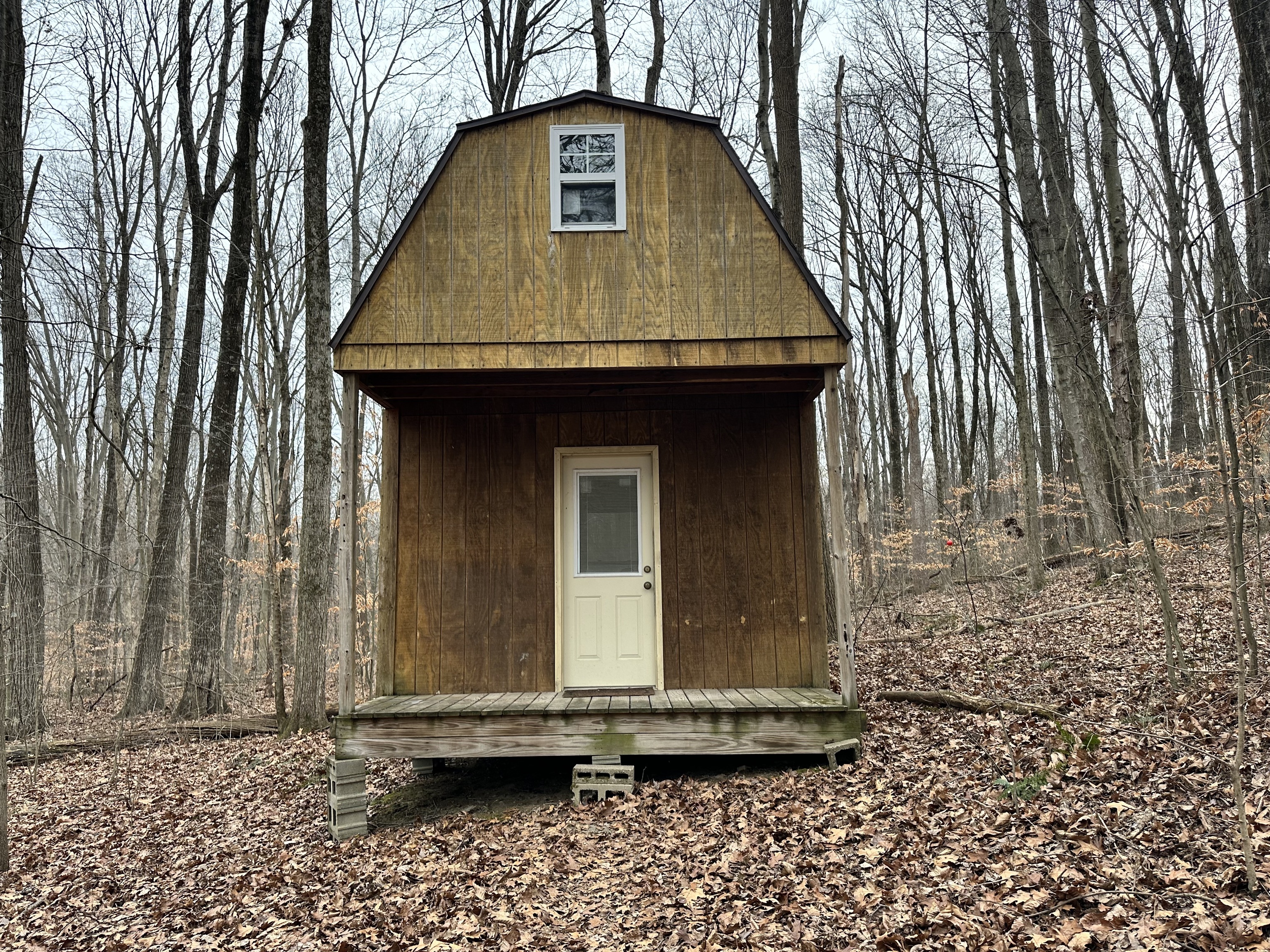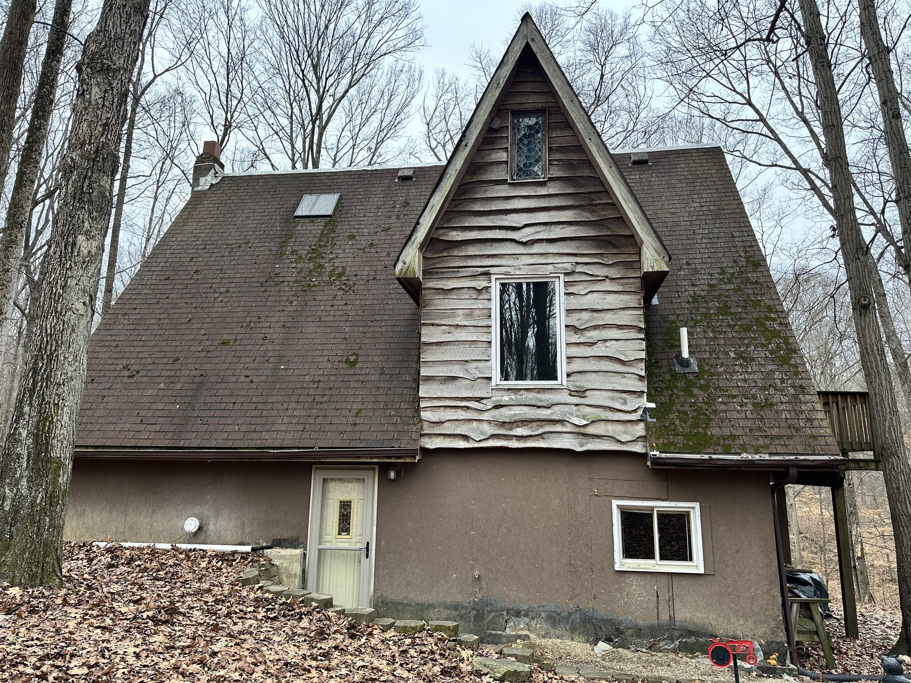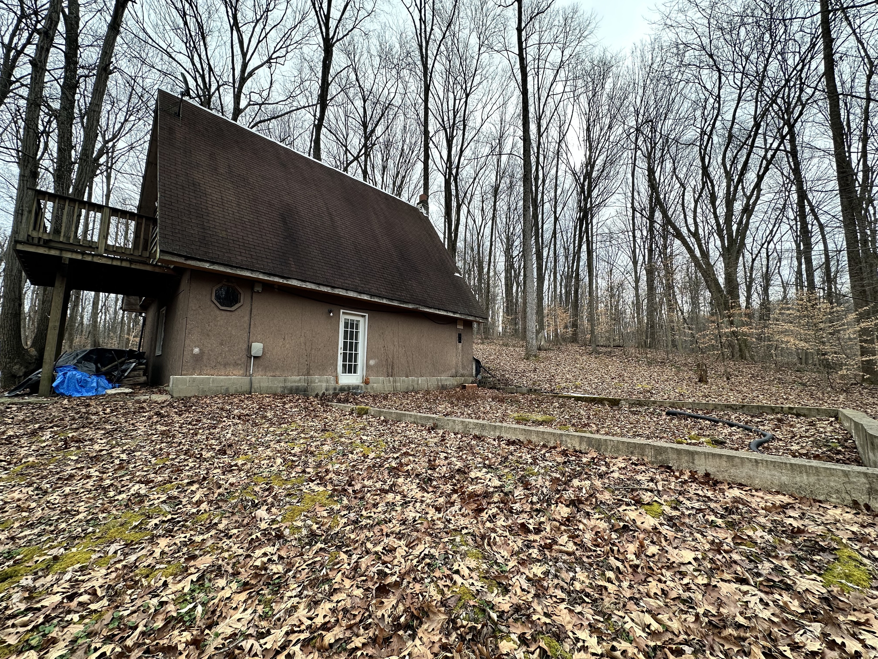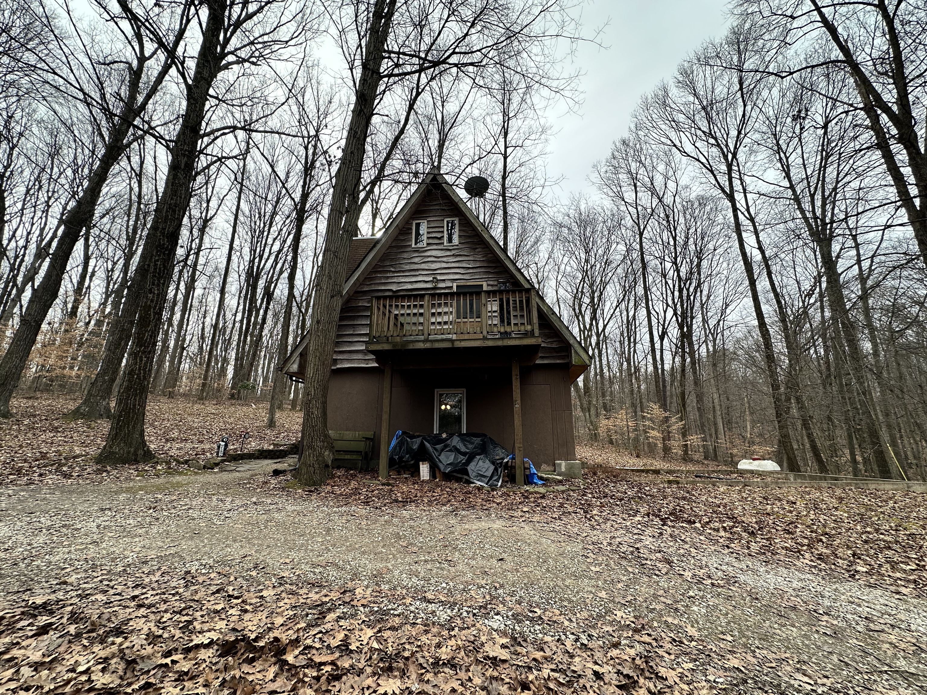 This A frame sits on approximately 8 Acres in the woods making for a peaceful spot to make your own. The property allows for great opportunities, including a 2 Car detached garage & two lofted outbuildings for your desired use. The inside of the home is an open concept on the main level with multiple storage closets. The upper level has a lot of natural light from the large windows, with a large room that could be great for entertaining. On the upper lever there is access to a balcony deck, as well as to an upper loft with loads of opportunities.