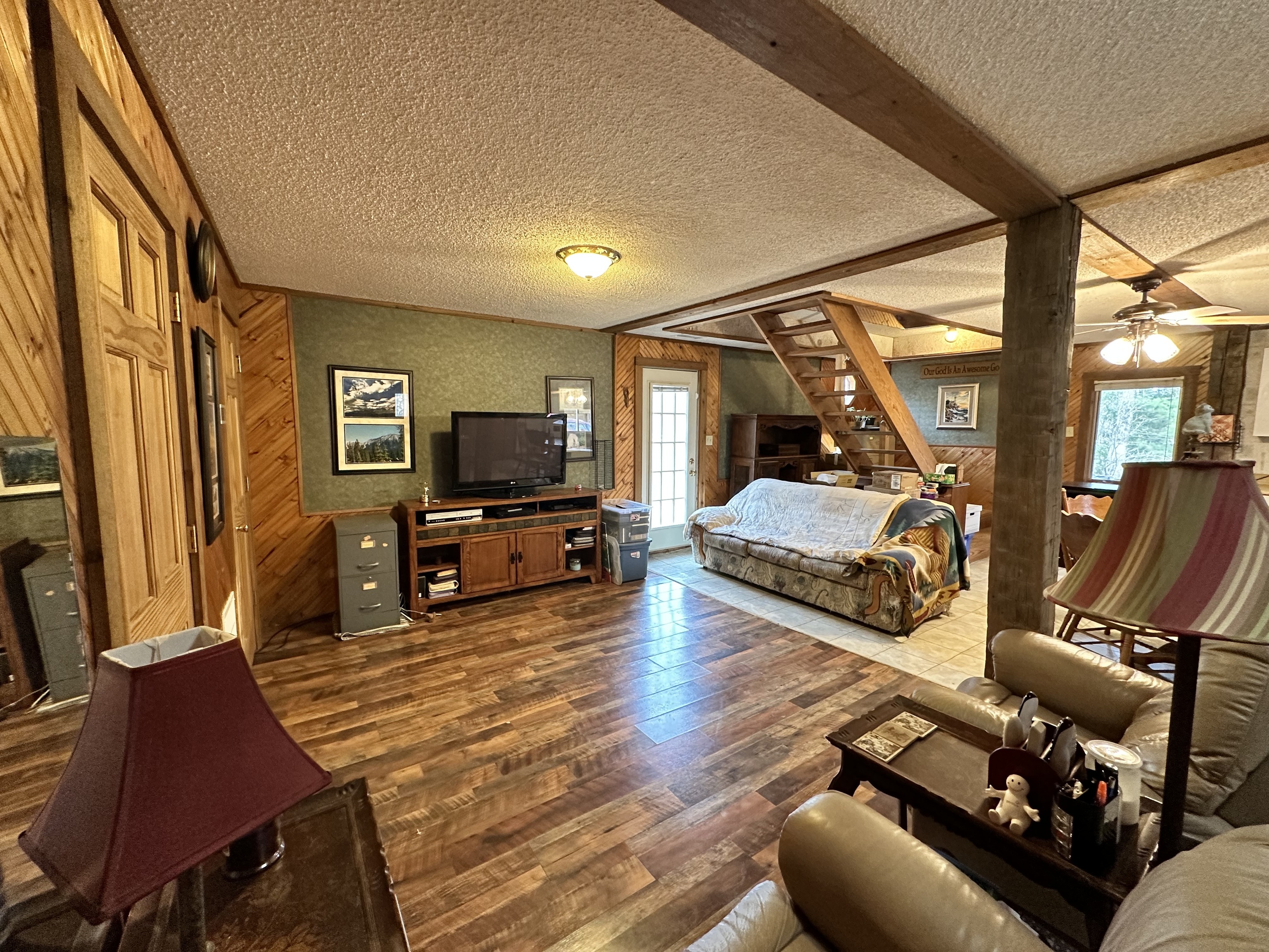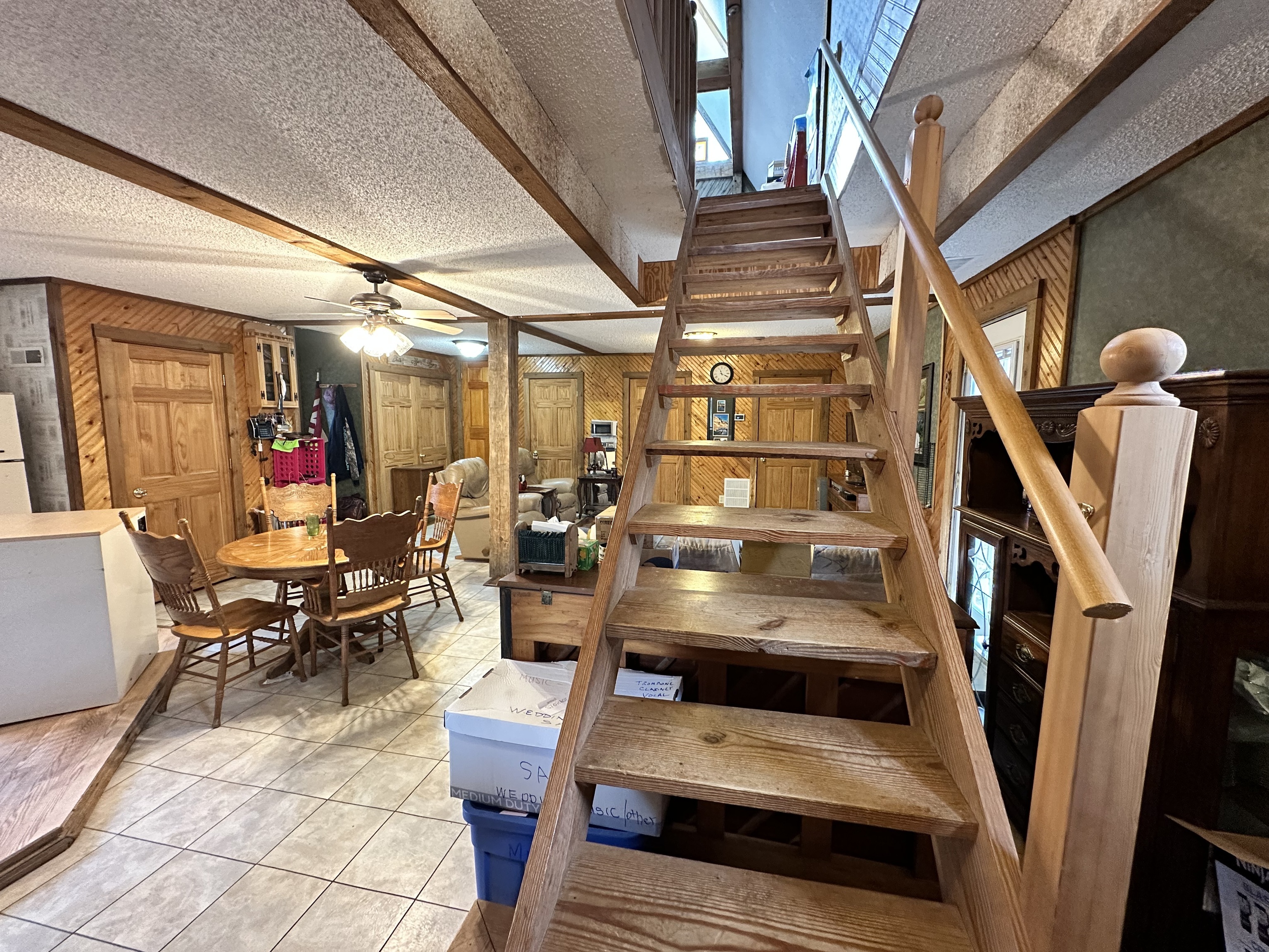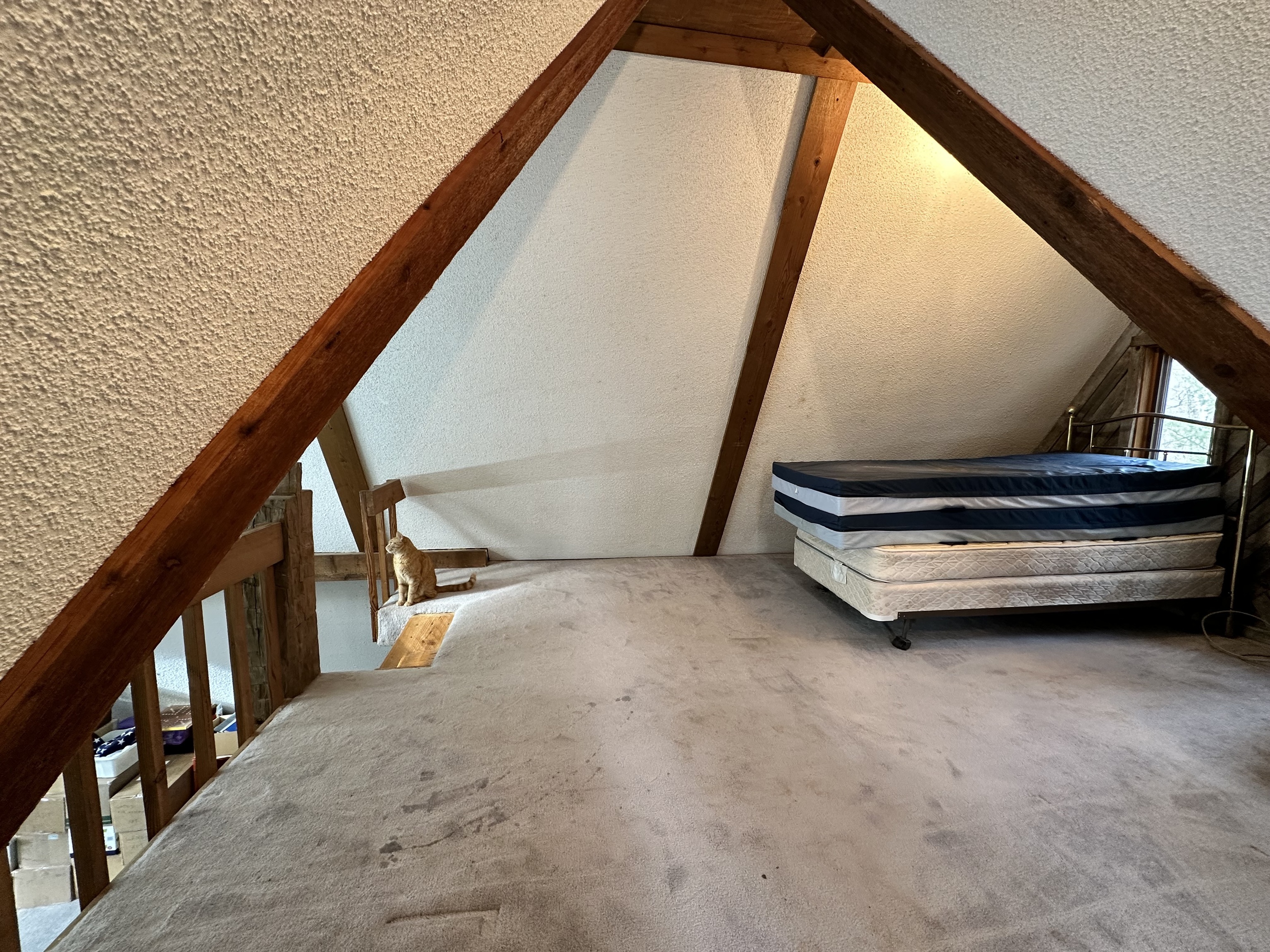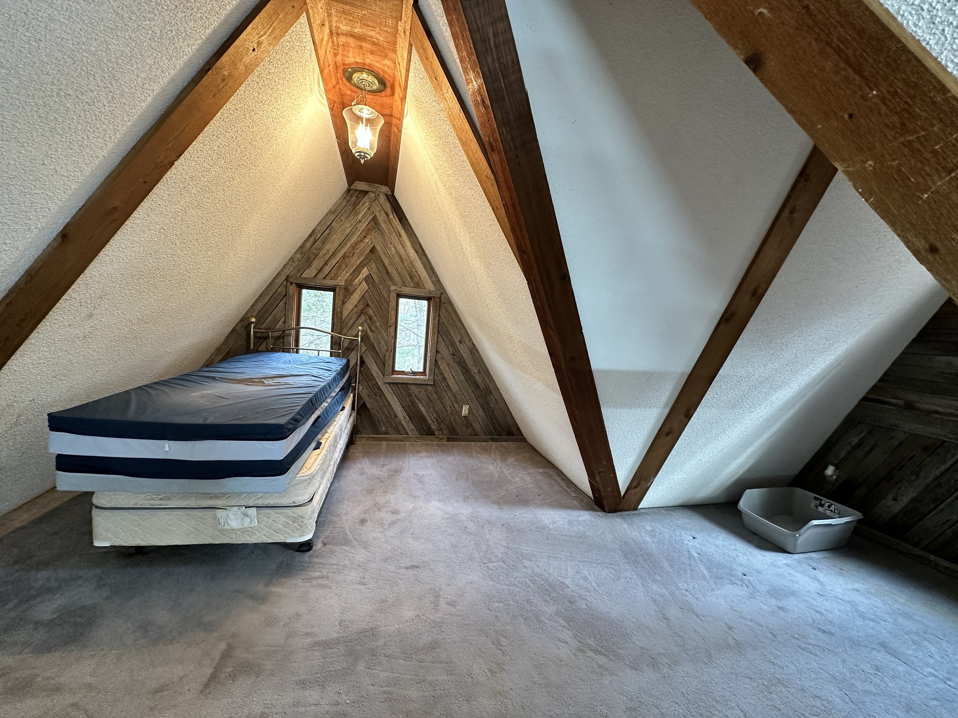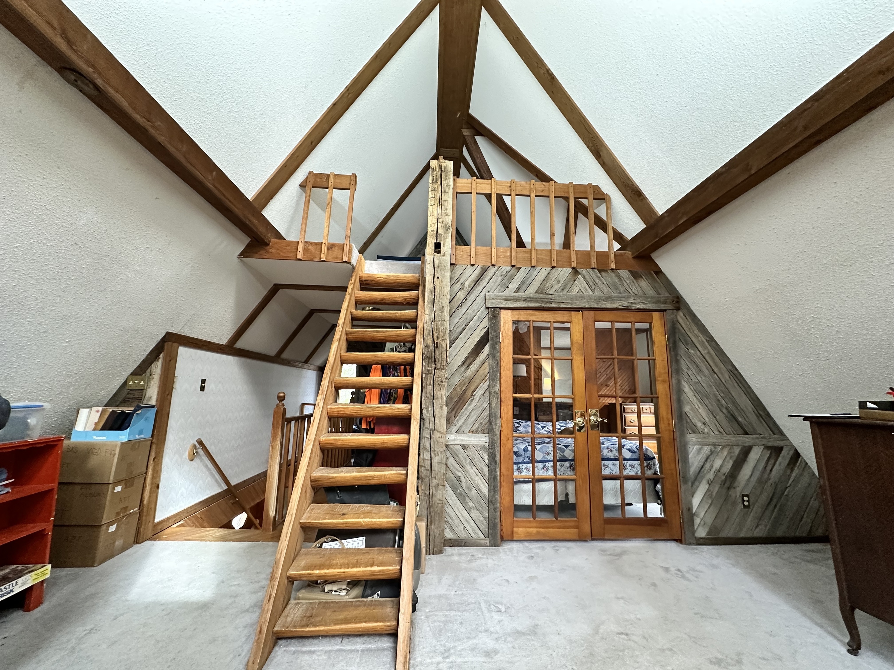 This A frame sits on approximately 8 Acres in the woods making for a peaceful spot to make your own. The property allows for great opportunities, including a 2 Car detached garage & two lofted outbuildings for your desired use. The inside of the home is an open concept on the main level with multiple storage closets. The upper level has a lot of natural light from the large windows, with a large room that could be great for entertaining. On the upper lever there is access to a balcony deck, as well as to an upper loft with loads of opportunities.