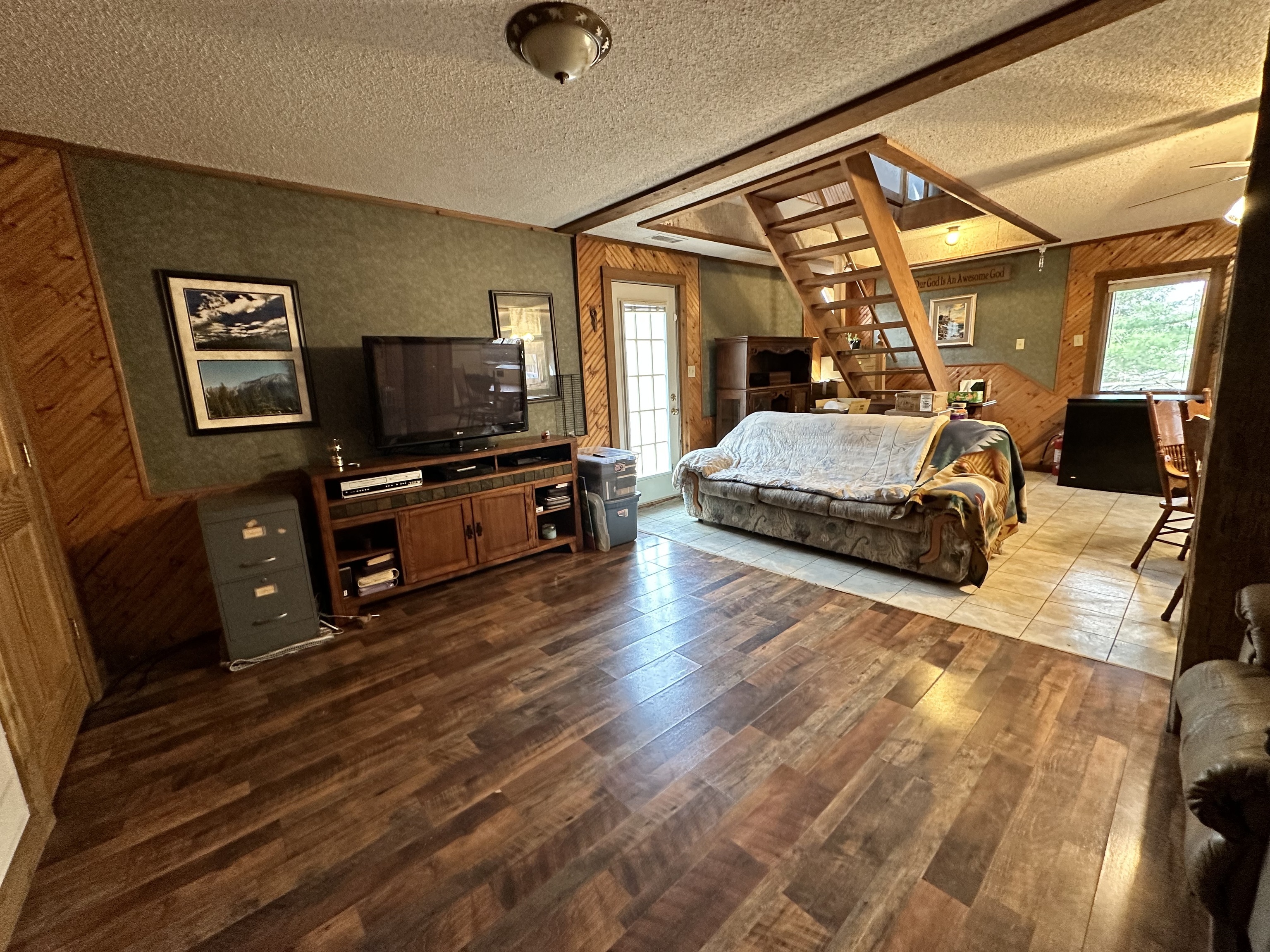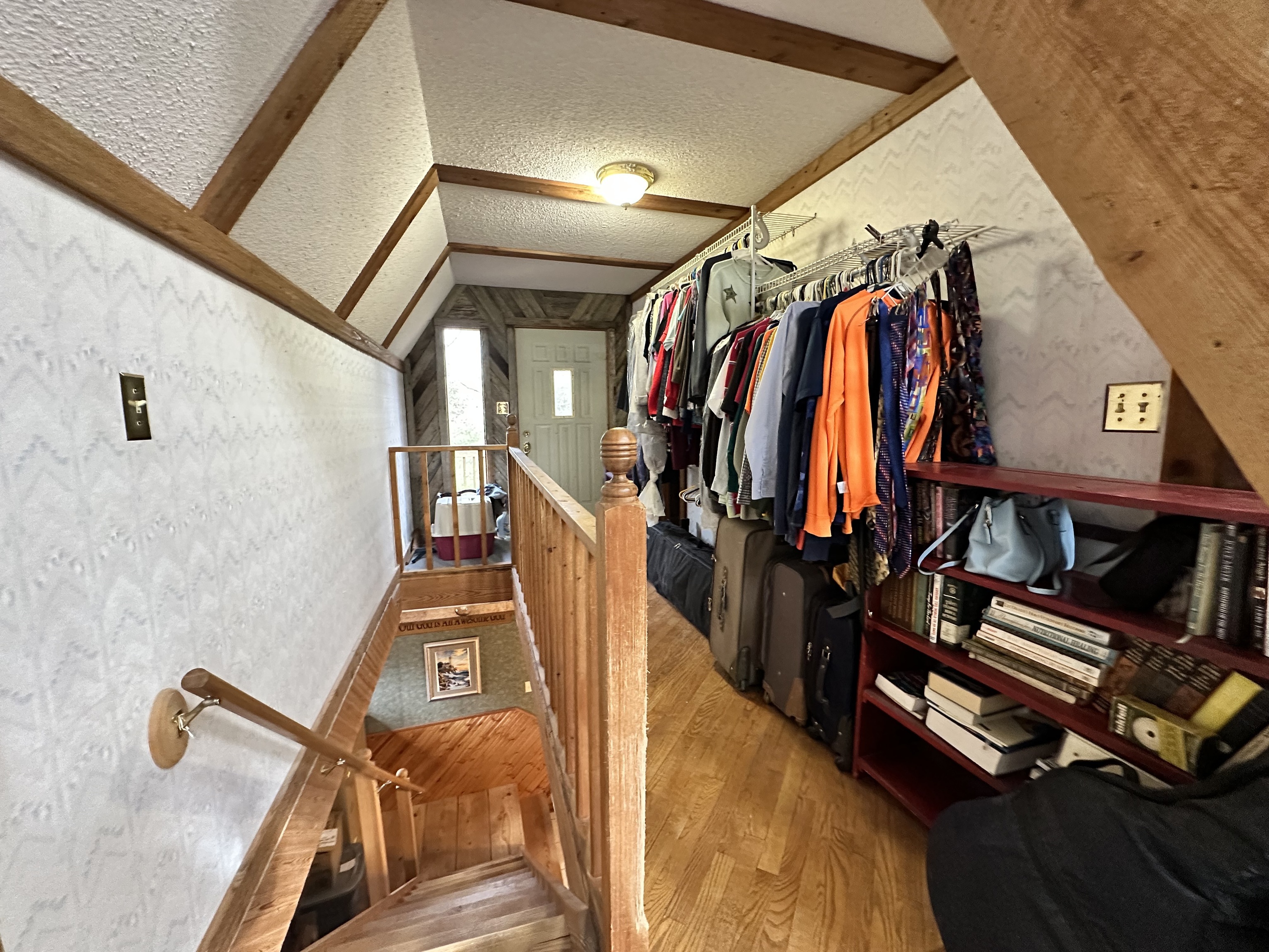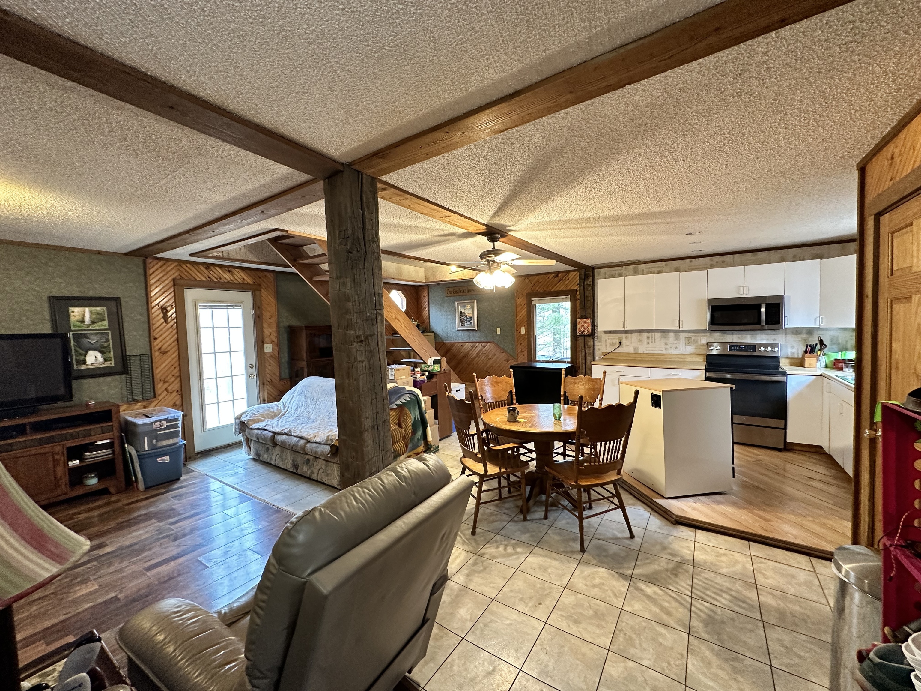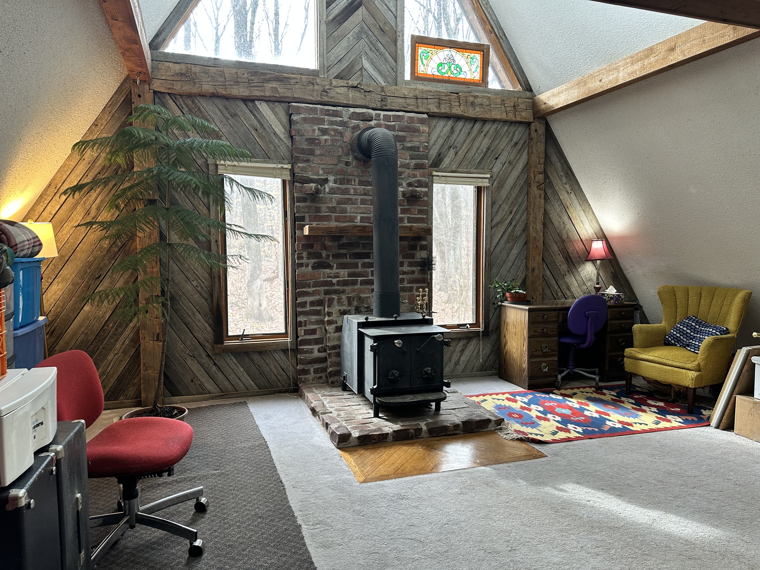 This A frame sits on approximately 8 Acres in the woods making for a peaceful spot to make your own. The property allows for great opportunities, including a 2 Car detached garage & two lofted outbuildings for your desired use. The inside of the home is an open concept on the main level with multiple storage closets. The upper level has a lot of natural light from the large windows, with a large room that could be great for entertaining. On the upper lever there is access to a balcony deck, as well as to an upper loft with loads of opportunities.