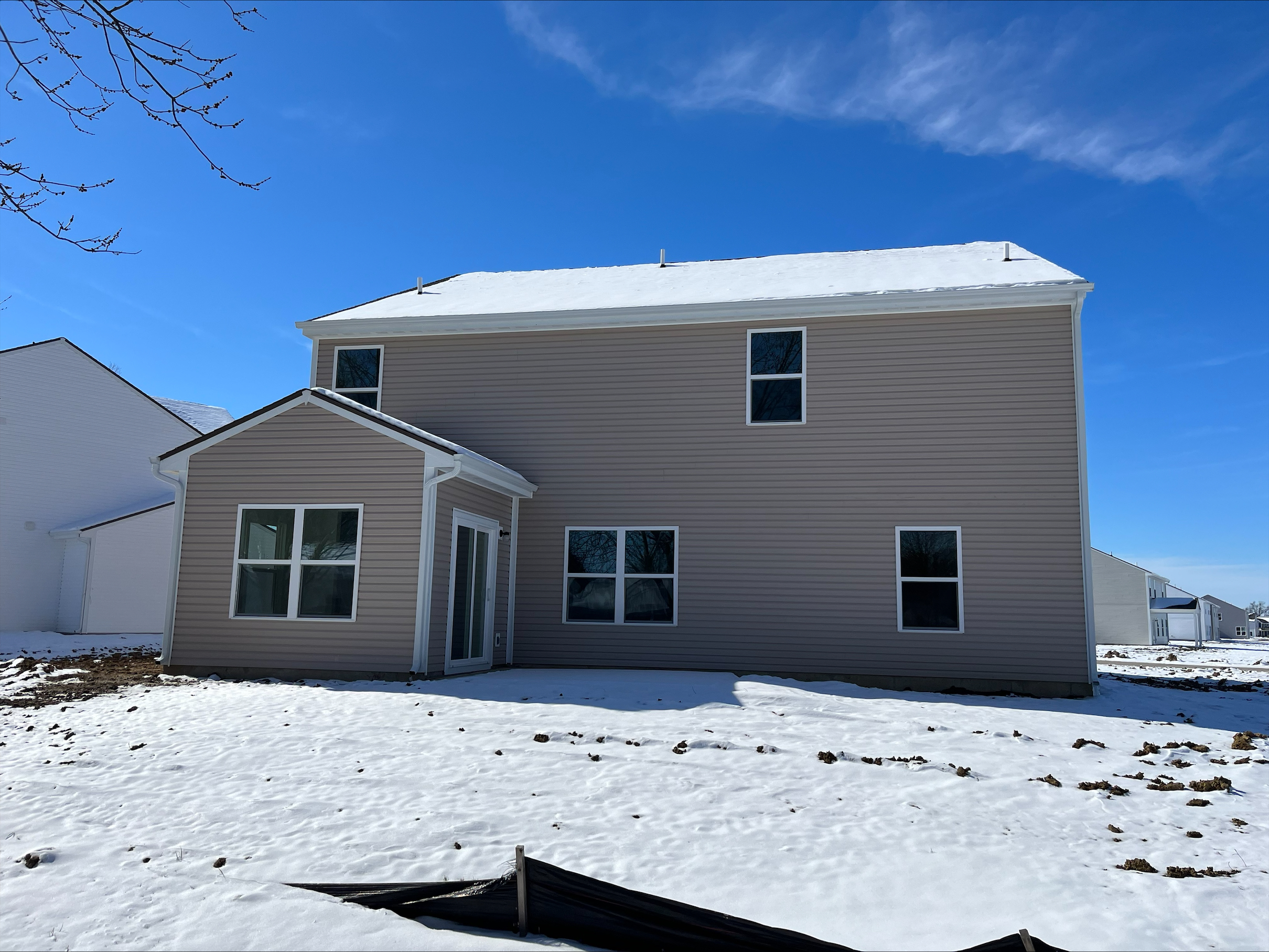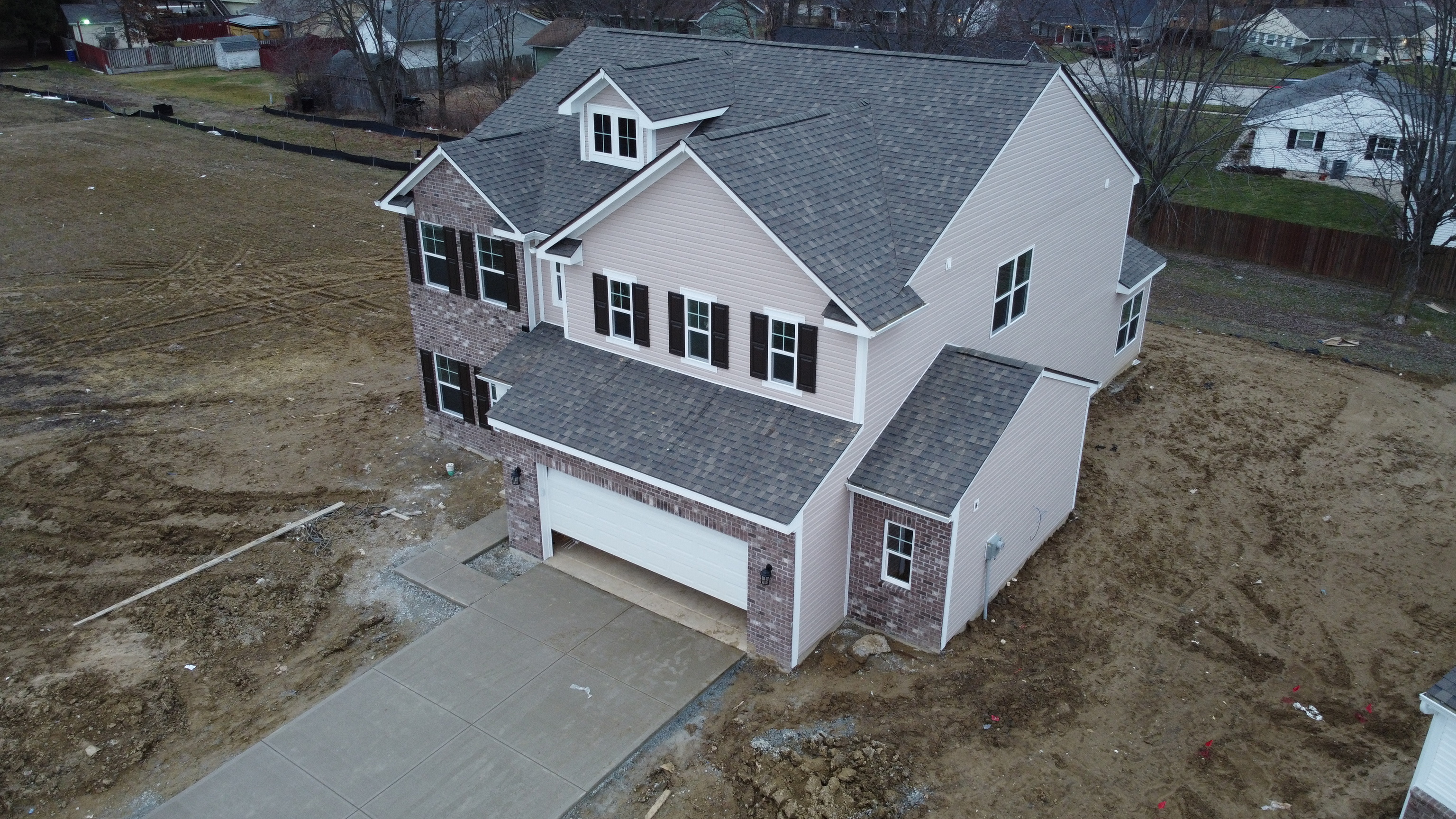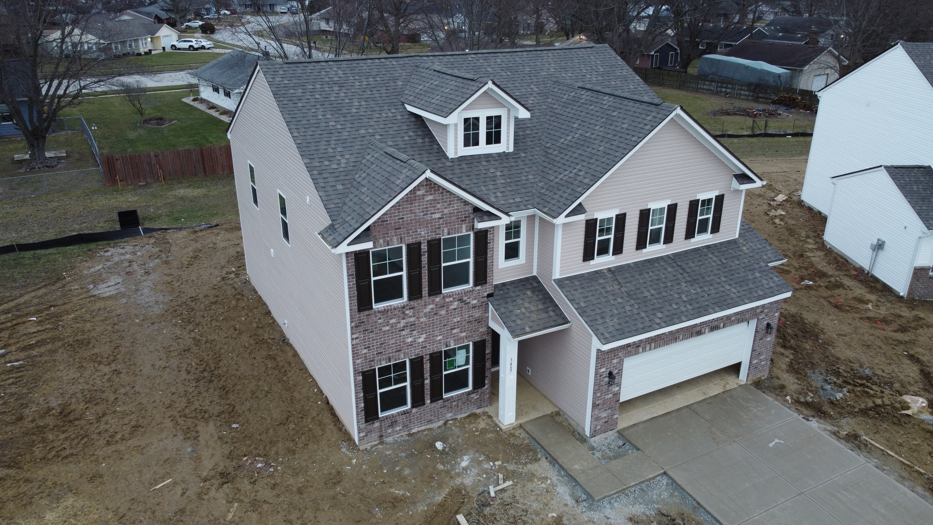 This 6-bed, 4-full bath Norway floorplan boasts an inviting exterior with vinyl and brick siding, vinyl shutters, and a two-car garage featuring a 6′ side extension. garage entrance showcases a stylish square-paneled steel door with a keyless entry pad, 2 dusk-to-dawn coach lights, one on each side. To the left of the foyer is a separate dining room then leads into the open kitchen layout to the great room and breakfast room. Kitchen features a 7×6 pantry with wired shelving, center island with a 9” deep stainless-steel sink, 42-inch-tall straight wall cabinets, small colonial crown, 4” matching backsplash, and a cabinet above the refrigerator. The kitchen appliances include Frigidaire Stainless Steel electric range, microwave, and dishwasher. All kitchen and bathroom countertops are adorned with 2CM surfaces. Off the great room and nook is a spacious sunroom with connecting 12’x10′ concrete patio. Frist floor has 9′ first-floor walls and 5′ tall windows. The bedroom on the first floor connects to one full bath room. A closet under the stairs provides additional storage. 5 bedrooms are located on the upper level where the loft has been converted into a 6th bedroom. The master bathroom boasts a 60” shower, double sink, tall, elongated toilet, and a tub/shower combination with a bi-pass glass door. The second-floor bathrooms feature tall, elongated toilets and tub/shower combinations, with one having double sinks and the other a single vanity sink. All bathrooms include 35-inch-tall cabinets. The first-floor features vinyl plank flooring throughout, while the second floor is carpeted, with vinyl plank flooring in the laundry room. The laundry room is equipped with a shelf above the washer and dryer area. The entire house is finished with colonial trim. The heating and cooling system consists of an electric furnace and heat pump, with a digital thermostat and a 50-gallon electric water heater. The house is illuminated by energy-efficient LED lighting.