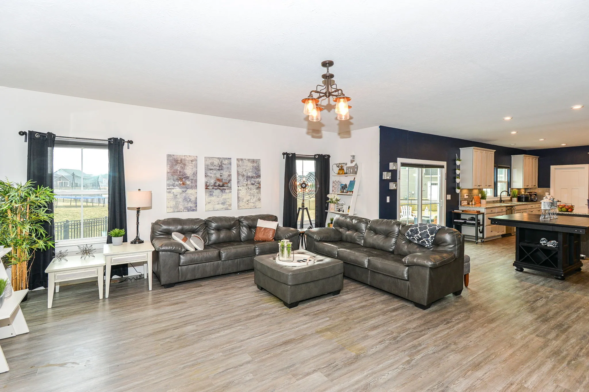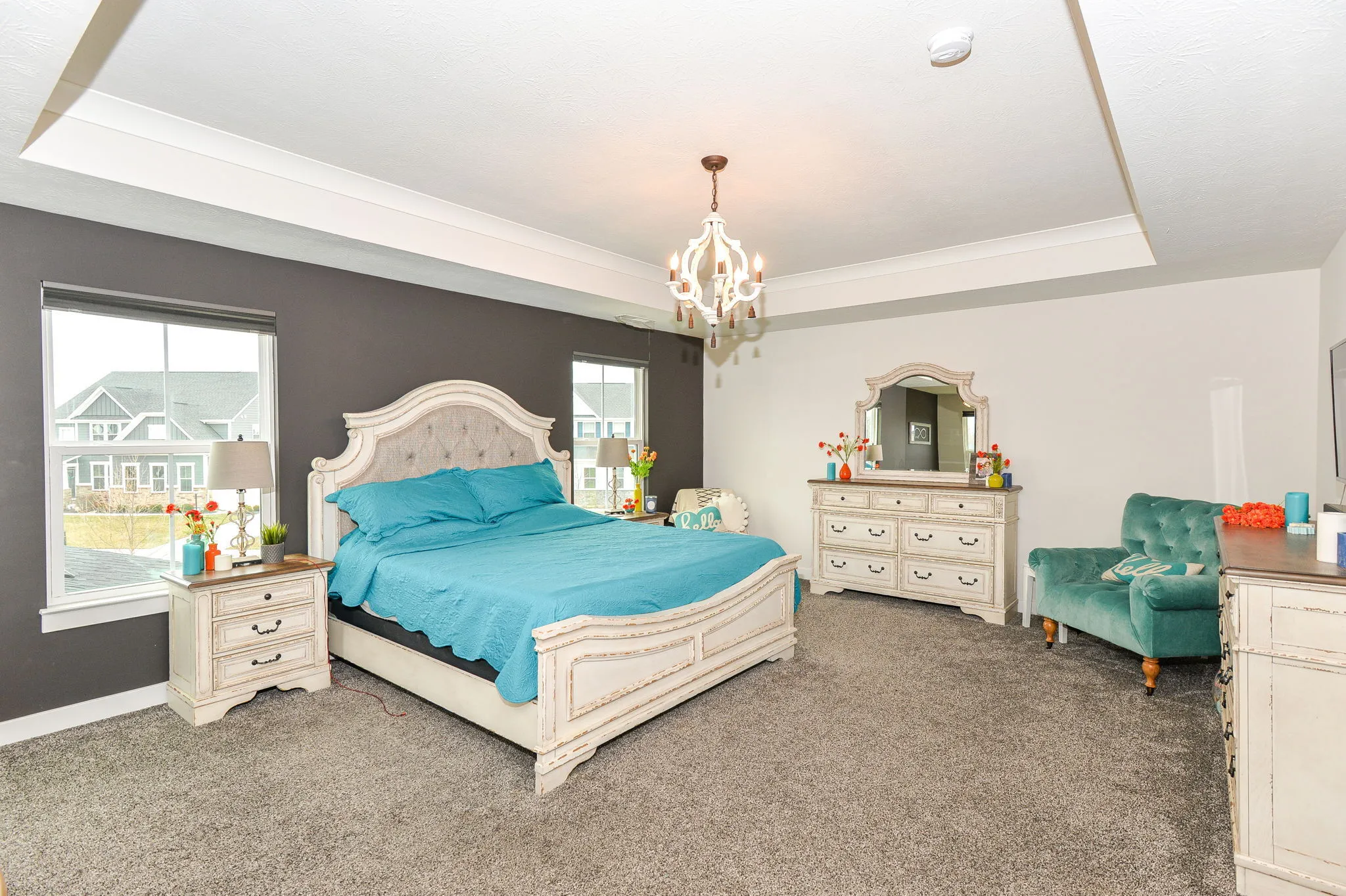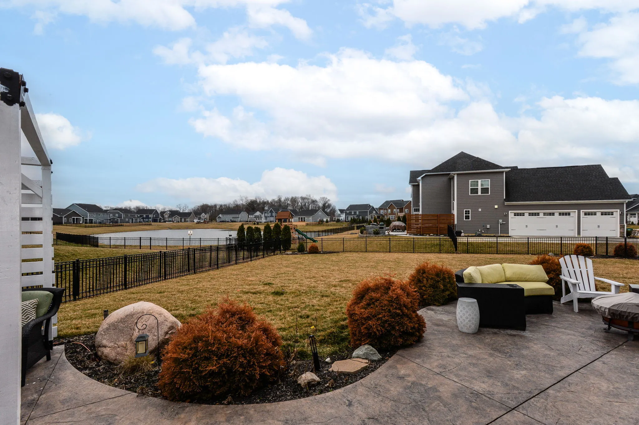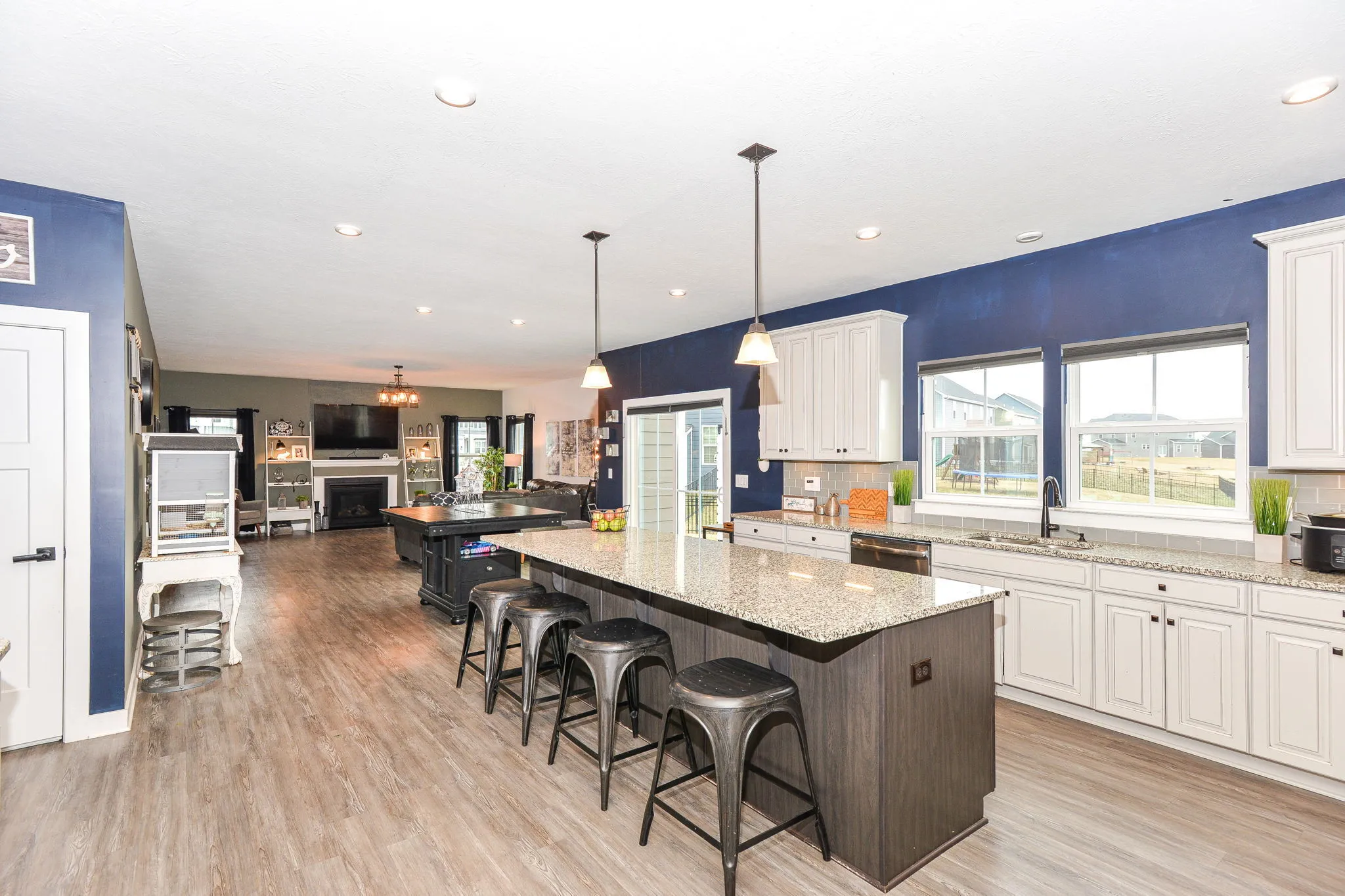 Welcome home to this immaculate turnkey ready to move in home. This cantered home has an enormous corner lot. Your future home has a 3-car garage, 6-bedrooms, and 5 (yes, 5) full bathrooms. It brilliantly combines efficiency, grandness, and beauty. The covered porch leads to an open main level with grand 20-foot ceilings. Formal dining room flows into the featured gourmet kitchen with double ovens, a vast granite island, expanded counter space, mud room, and a walk-in pantry. Eat-in kitchen area is positioned between the luxurious kitchen and the heath (living) room with a centered focused fireplace. Main level bedroom is currently being used as an office and connects to the hall full bathroom. Upper level features a loft, full double sink bathroom, laundry room, and grand primary with a sitting area, executive retreat bathroom, and expansive walk-in closet. A pleasant surprise awaits you with one of the three additional bedrooms on upper lever having an ensuite (peach room). The lower level finished basement is ready for apartment living, an in-law or mother-in-law quarters and entertaining. It is stocked with all kitchen appliances and sectional. It boasts of a theatre room with projector, screen, and chairs remaining for your use day one of your move-in. Basement utility room has good depth for plenty of storage with a washer and dryer hookup. Your backyard serenity is enclosed by a wrought iron fence with a beautifully placed pergola and a perfectly stamped concrete patio positioned ideally on the water for your relaxation and family enjoyment is. Side yard flat area could be the home of an in-ground pool. Golf-cart friendly community. Neighborhood amenities include, pool, playground and walking trails.