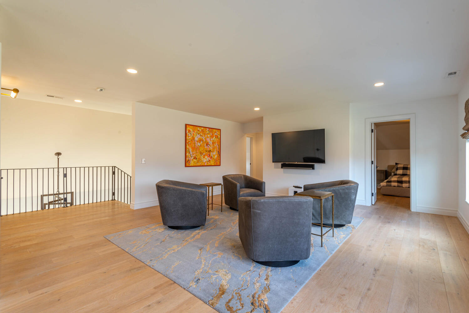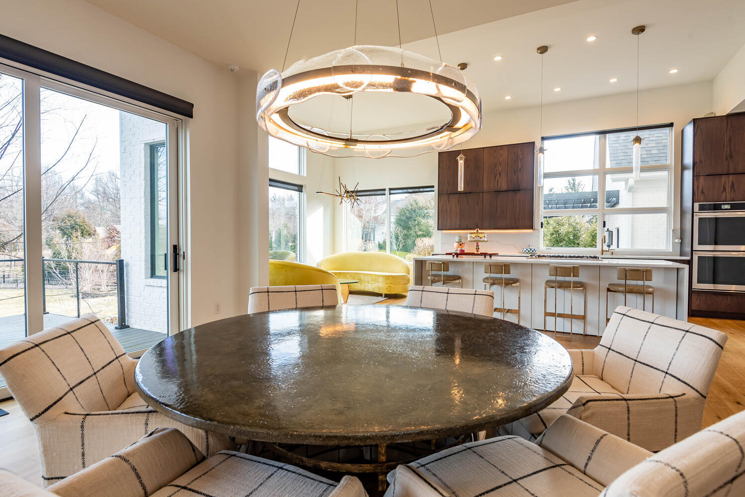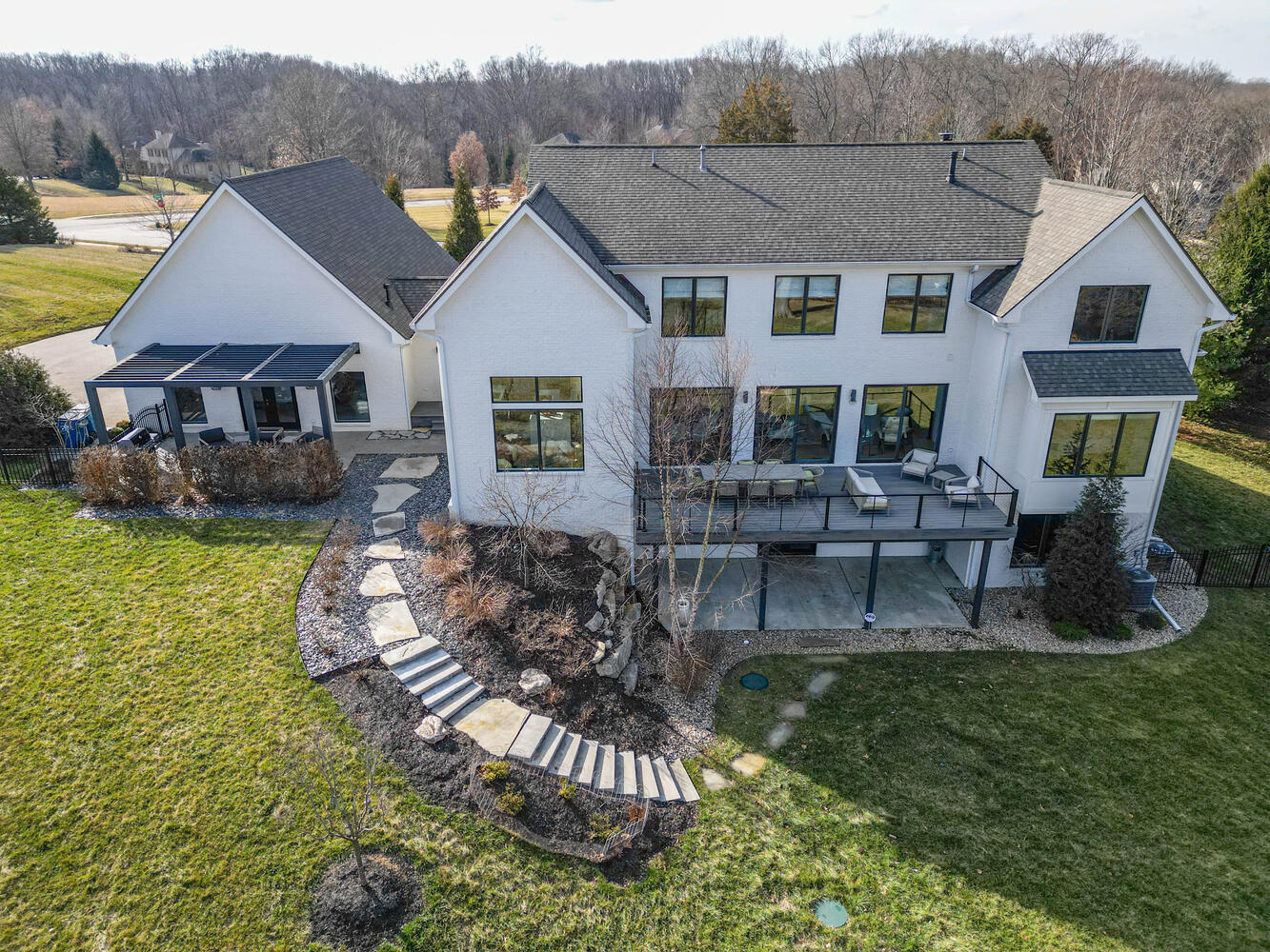 Nestled within Gramercy Park, Bloomington’s distinguished estate neighborhood offers convenient proximity to IU, the IU Health Campus, the IU golf course, and various eastside amenities. This residence exudes modern elegance with its clean lines and meticulous attention to detail. Stepping through the mahogany door with a glass insert, you’re immediately greeted by a showcase of luxury. Kaiser German 7″ finished plank hardwood flooring, upscale lighting, and a custom iron staircase provide just a glimpse of the opulence within. Featuring open entertaining spaces on each level, this home caters to diverse activities and guests. A cozy office/den off the entrance boasts a gas log fireplace, large windows, and exquisite wall coverings. The sleek contemporary style extends to the custom Stoll Cabinetry, entertaining island, quartz countertops, Emtek hardware, and stylish lighting fixtures in the kitchen. Complete with two dishwashers, two ovens, a large refrigerator, and a 6-burner gas cooktop, the kitchen is designed for culinary excellence. Additional amenities include a custom pantry, spacious laundry area, and a coffee bar with a wine/beverage refrigerator. Natural light floods through designer Pella windows and glass doors, illuminating the main floor. The primary suite is on the main level. Enjoy spa-like relaxation in the generously sized bathroom with a large steam shower, marble-topped cabinetry, and a perfectly designed walk-in closet. Upstairs, three bedrooms and two full baths offer functional living spaces, while the living area provides flexibility for gatherings or leisure. The lower level presents another complete living space, with a bedroom, full bath, kitchenette, and ample entertaining area opening to the outdoors. A large bonus room offers versatility for various uses, from a golf simulator room to a media/theatre space. The four-car garage features epoxy flooring, a thermo-controlled gas heater, a sink, and built-in Gladiator storage cabinets.